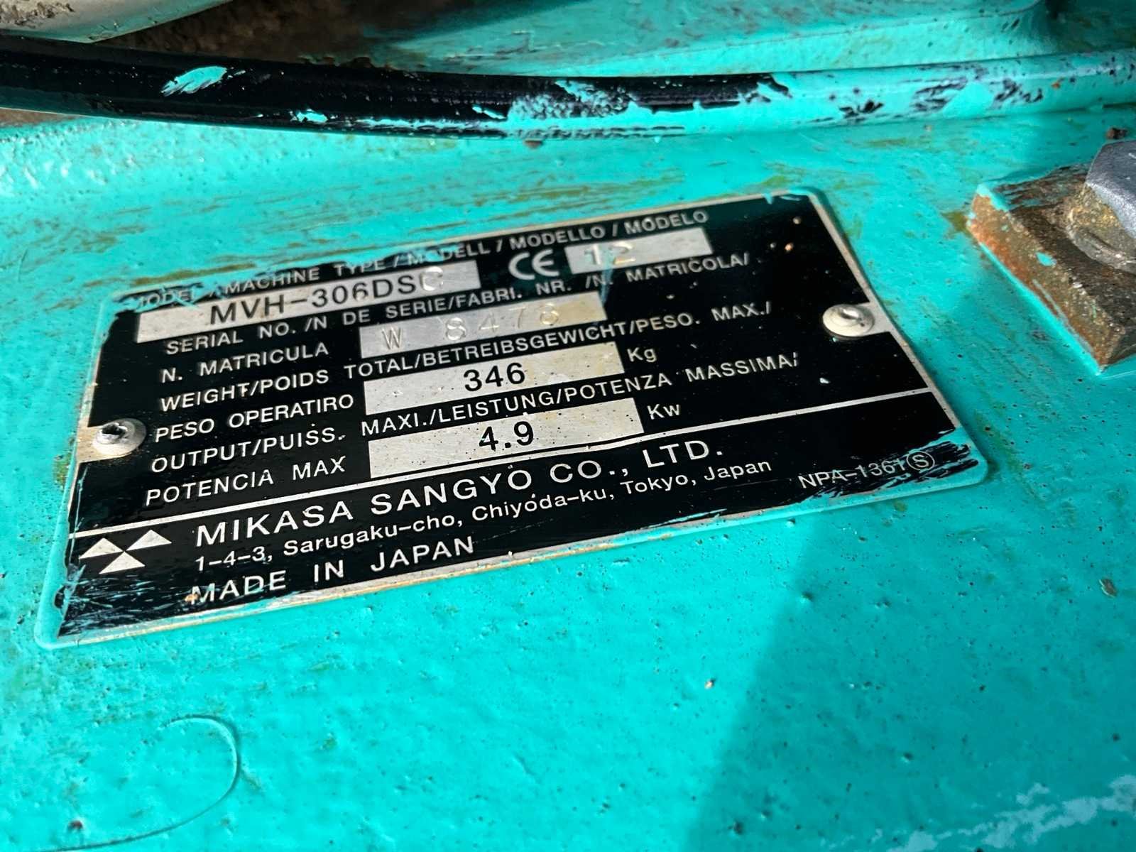 Nee Merk: Mikasa Type: MVH-306DS Serienummer: W8478 Bedrijfsgewicht: 346kg Grondplaat afm. l: 850mm Grondplaat afm. b: 450mm Merk motor: Yanmar Brandstof: Diesel