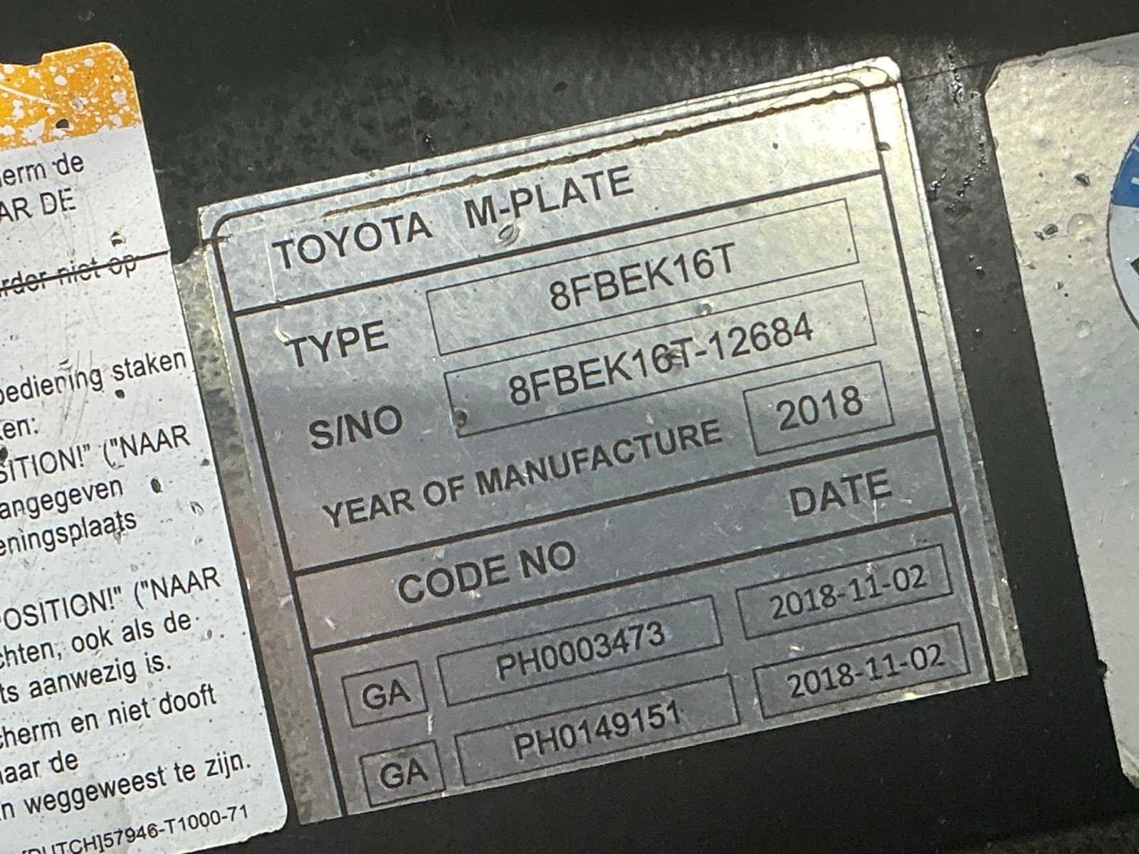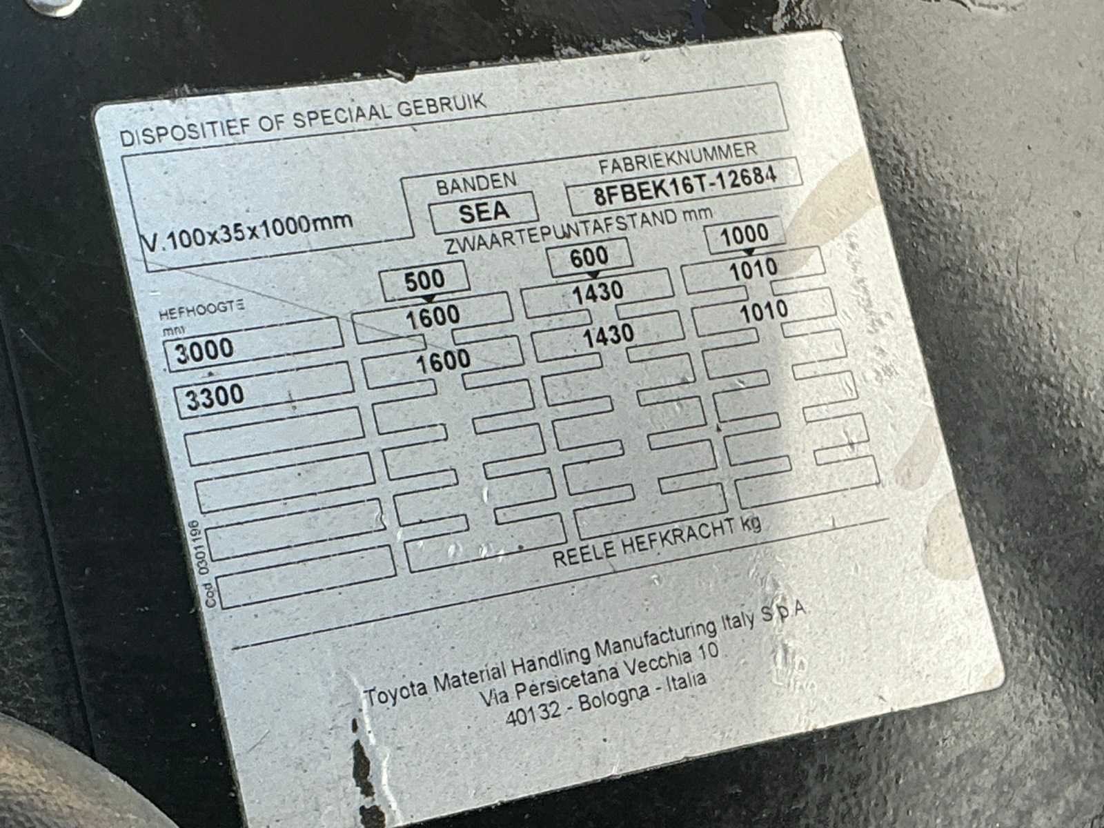 Nee Merk: Toyota Type: 8FBEK16T Bouwjaar: 2018 Serienummer: 12684 Brandstof: Elektrisch Mast: Duplex Soort band: Volrubber banden Aantal wielen: 3 Free-lift: true Side-shift: true Duplex mast: true Eigen gewicht: 3100kg Hefvermogen: 1600kg Lepellengte: 1000mm Hefhoogte: 3350mm Vol rubber banden: true Totale afmeting L: 1850mm Totale afmeting Breedte: 1050mm Totale afmeting Hoogte: 2150mm