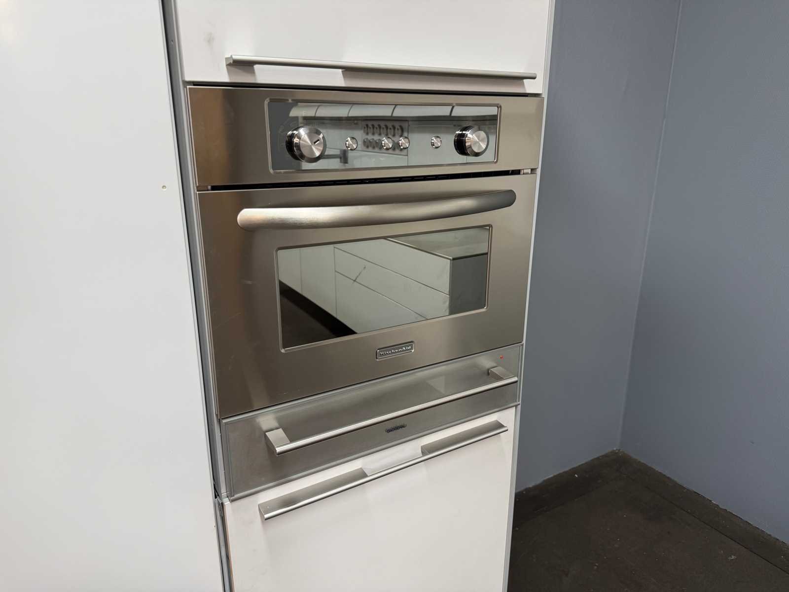 Met warmhoudlade Gaggenau WS261110; met panelen koelkastdeur; Afmetingen kastenwand circa 212,5x60x216 cm; keuken dient gedemonteerd te worden op locatie op 1e verdieping Nee Merk: Bulthaup Type keukenopstelling: Eiland Lengte: 362cm Breedte: 60cm Hoogte: 219cm Kraan: Bulthaup Gootsteen: Bulthaup Aanrechtblad: RVS Fornuis: Gaggenau Koelkast: Gaggenau IK300 Softclose: true Oven: Kitchenaid KMCE610IX Vaatwasser: Gaggenau GI406160 Lengte kookeiland: 212cm Breedte kookeiland: 78cm Hoogte kookeiland: 90,5cm
