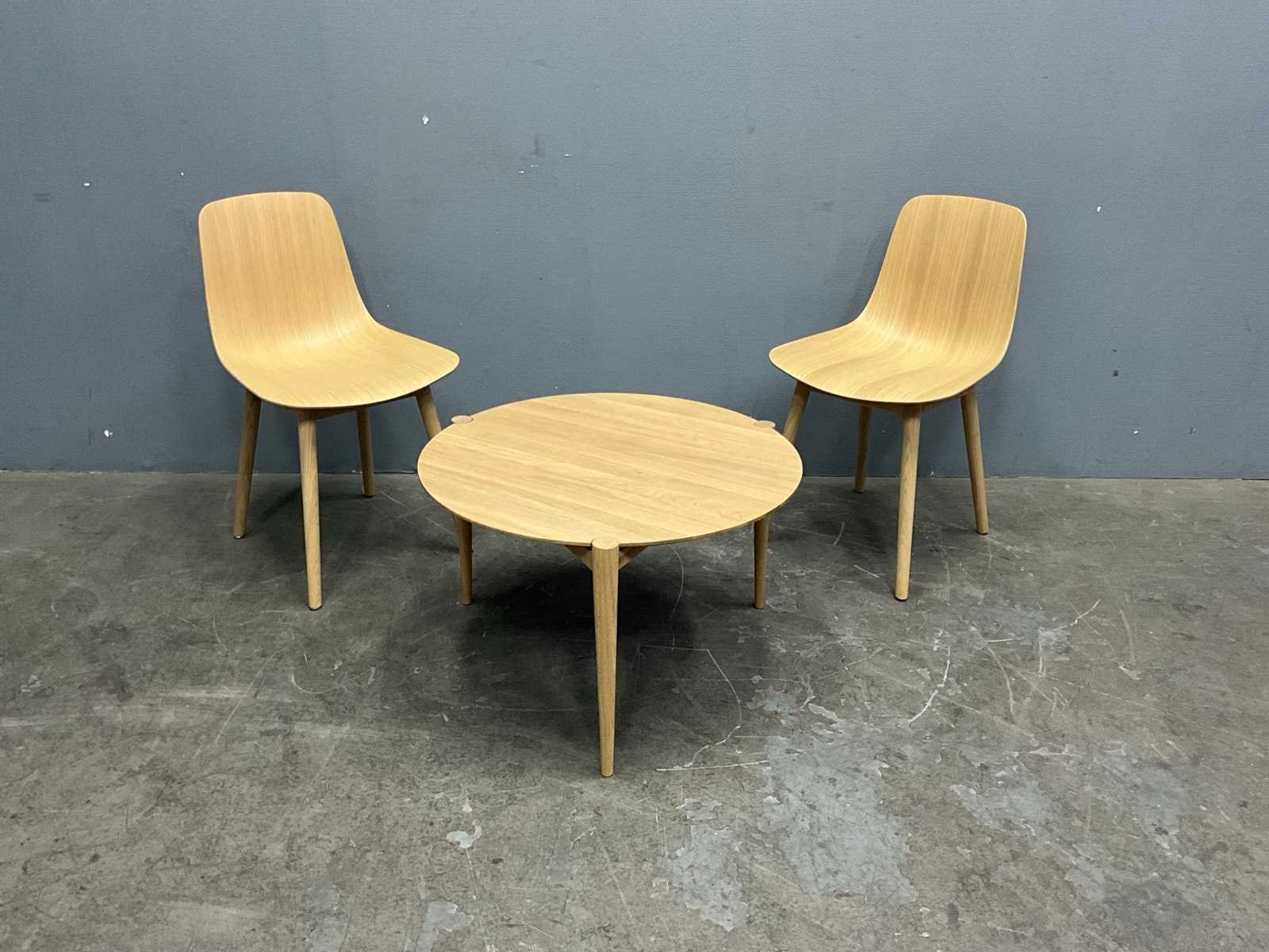 2 stoelen; 1 tafel; Nee Merk: Møbler Kleur: Eiken Zithoogte: 48cm