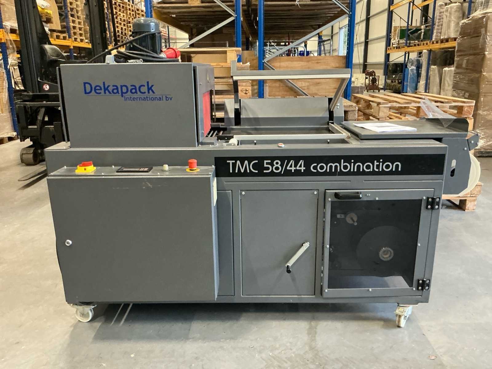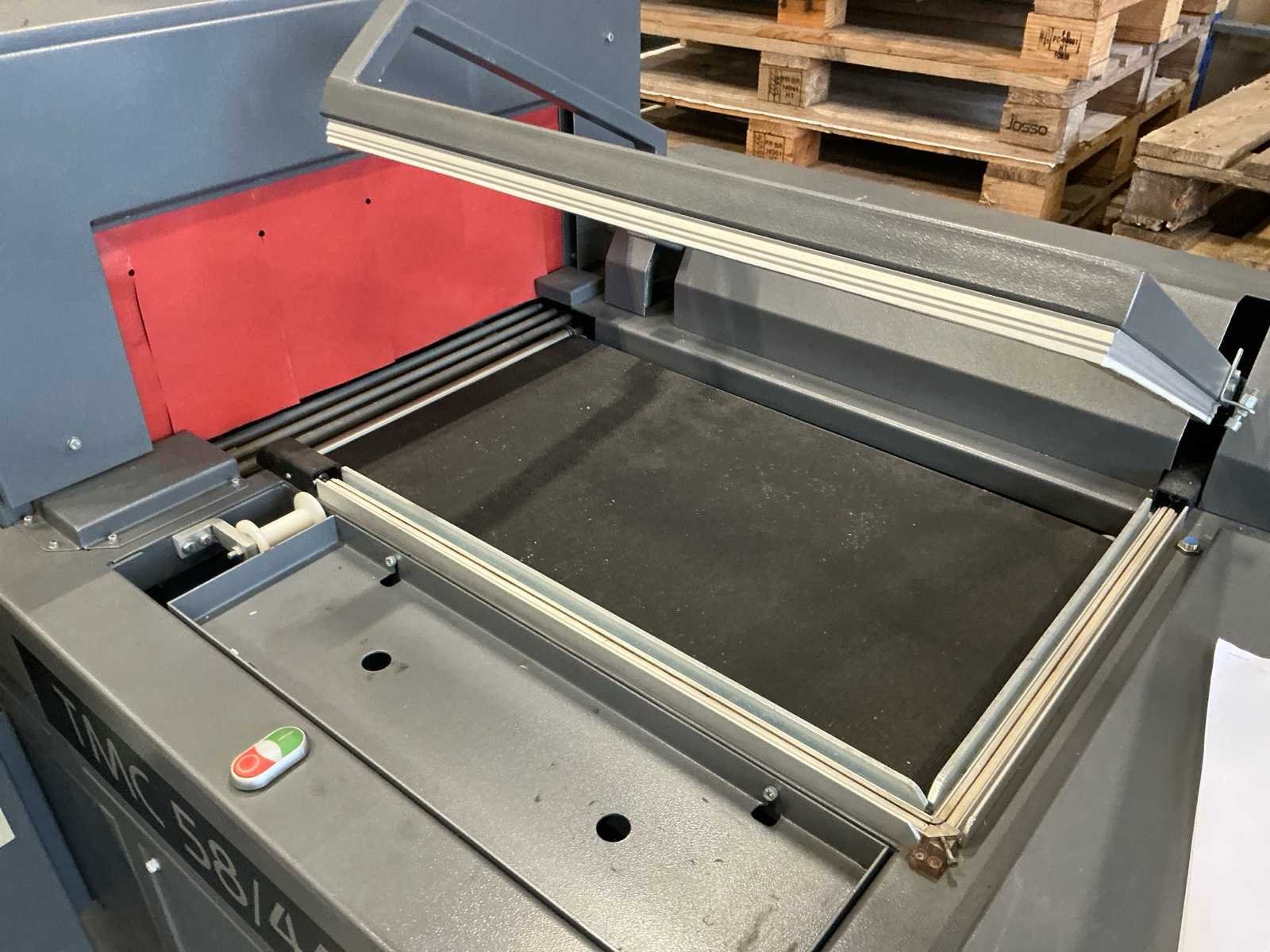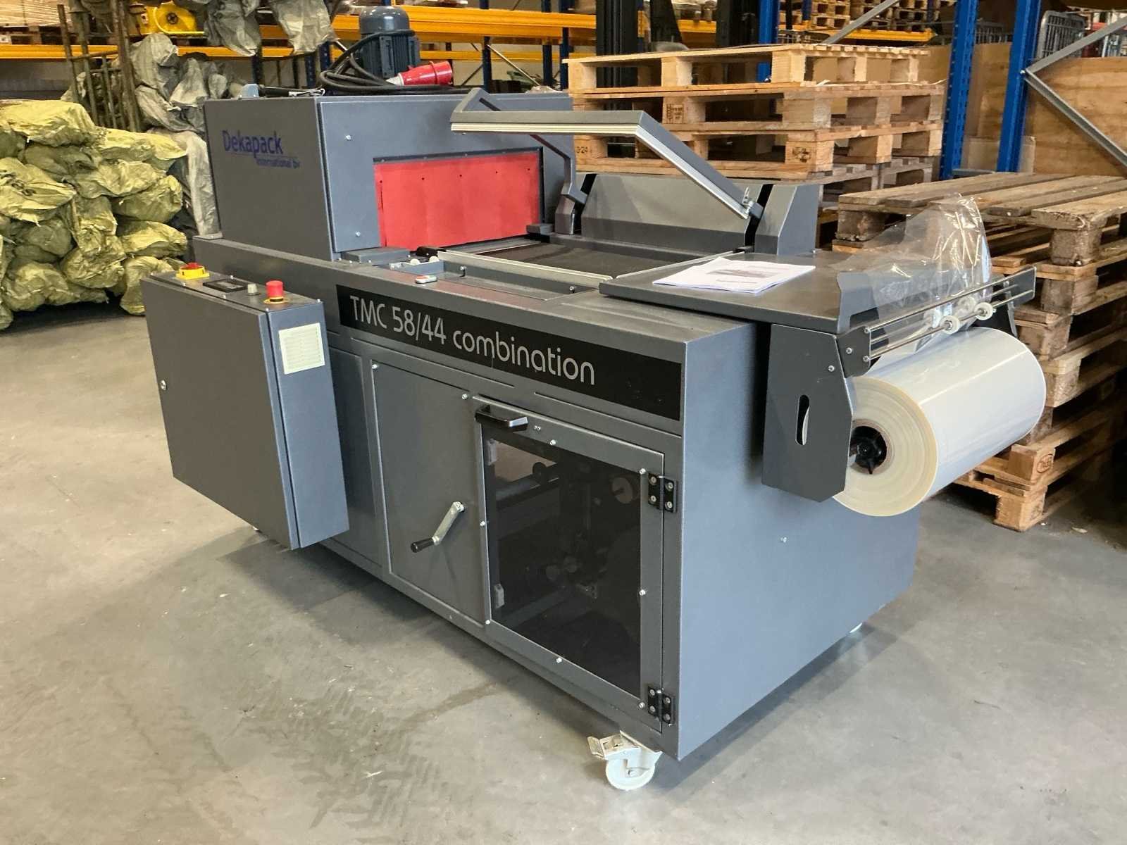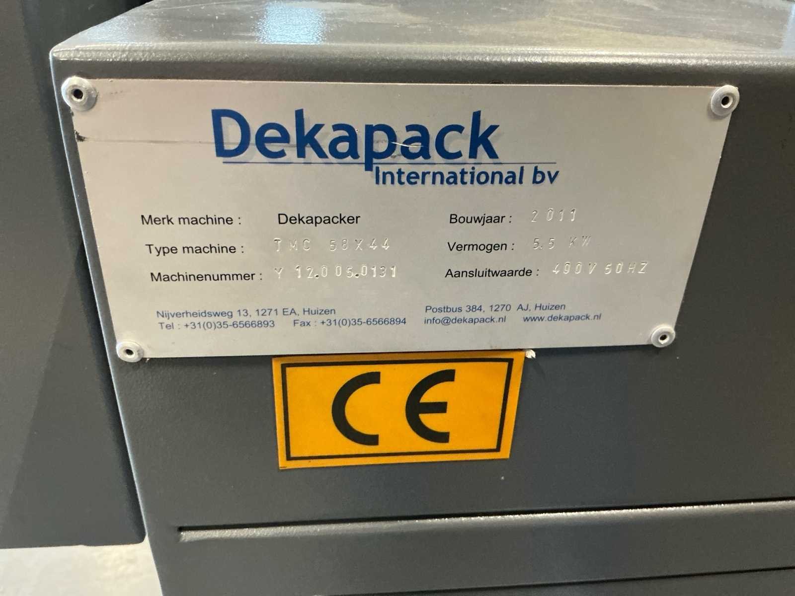 5,5 kw, maximaal 12 tot 16 per minuut, 450 uur gedraaid, inclusief transportband. Nee Merk: Dekapack Type: TMC 58x44 Bouwjaar: 2011 Serienummer: Y 12.005.0131 Max. formaat l: 550mm Werkbreedte: 440mm Rolhouder: true Transportband: true Transportband afm. l: 1200mm Transportband afm. b: 450mm Transportband afm. h: 1000mm Aansluiting: 400V Eigen gewicht: 350kg Totale afmeting L: 2385mm Totale afmeting Breedte: 1100mm Totale afmeting Hoogte: 1600mm