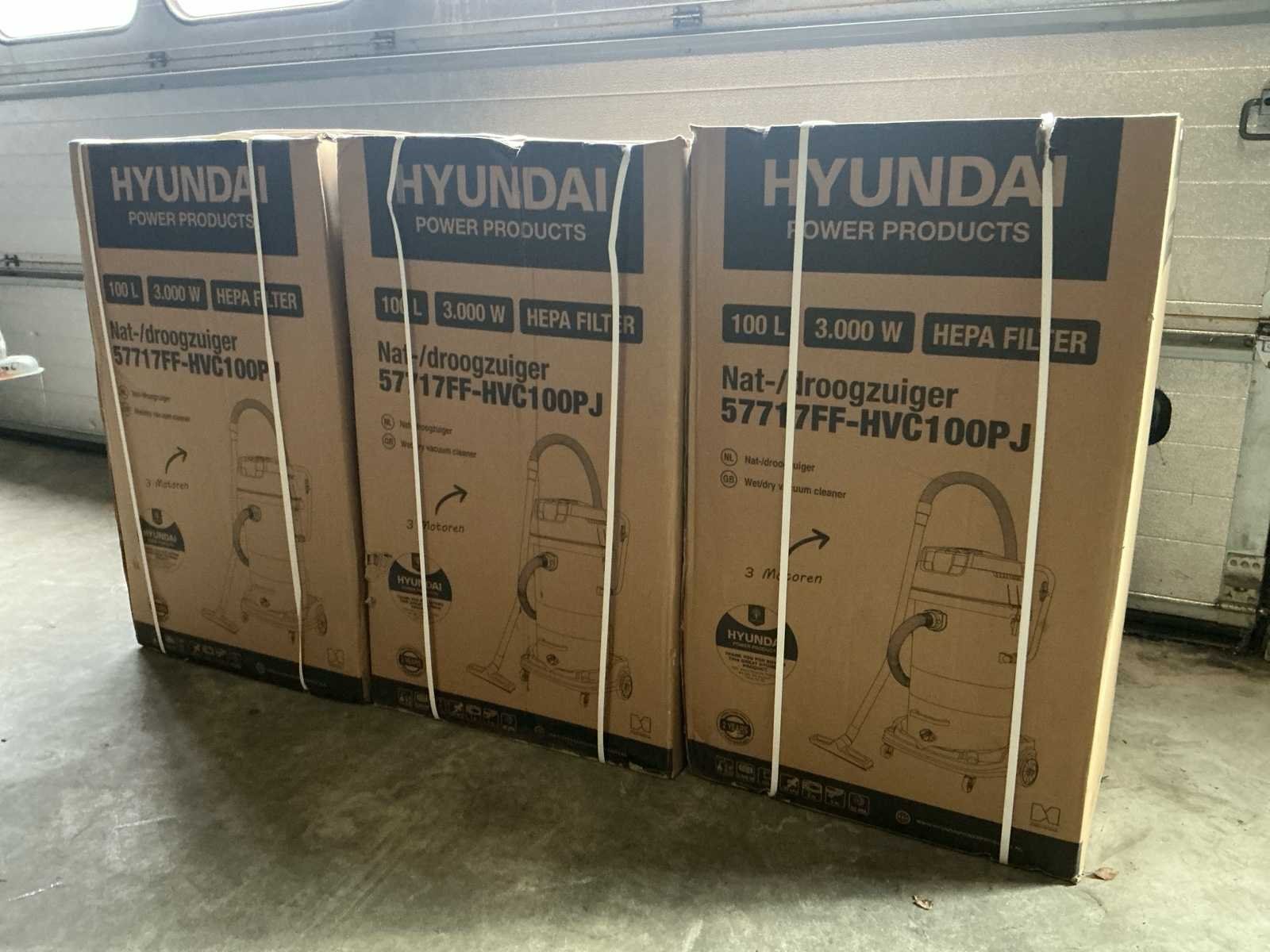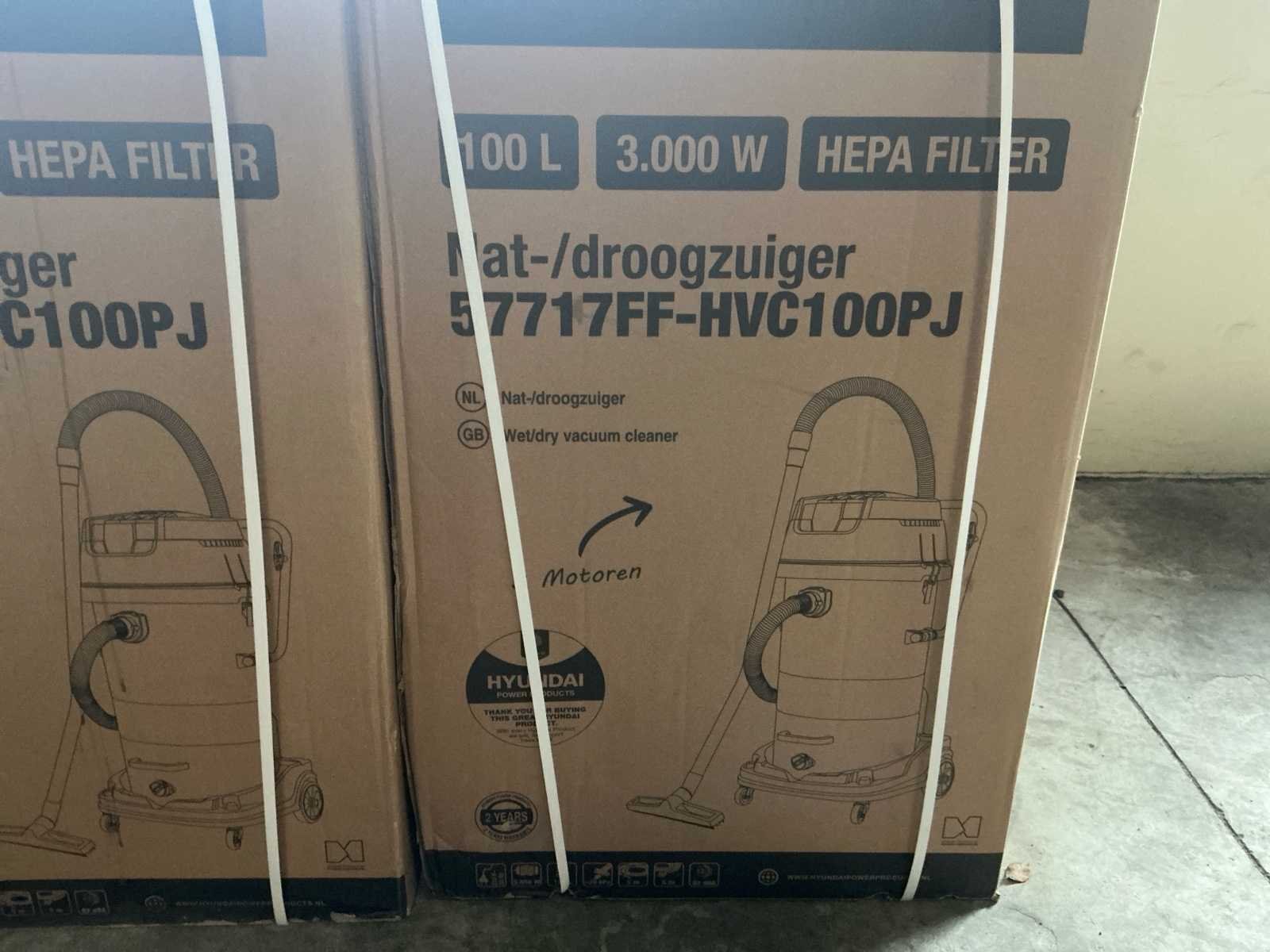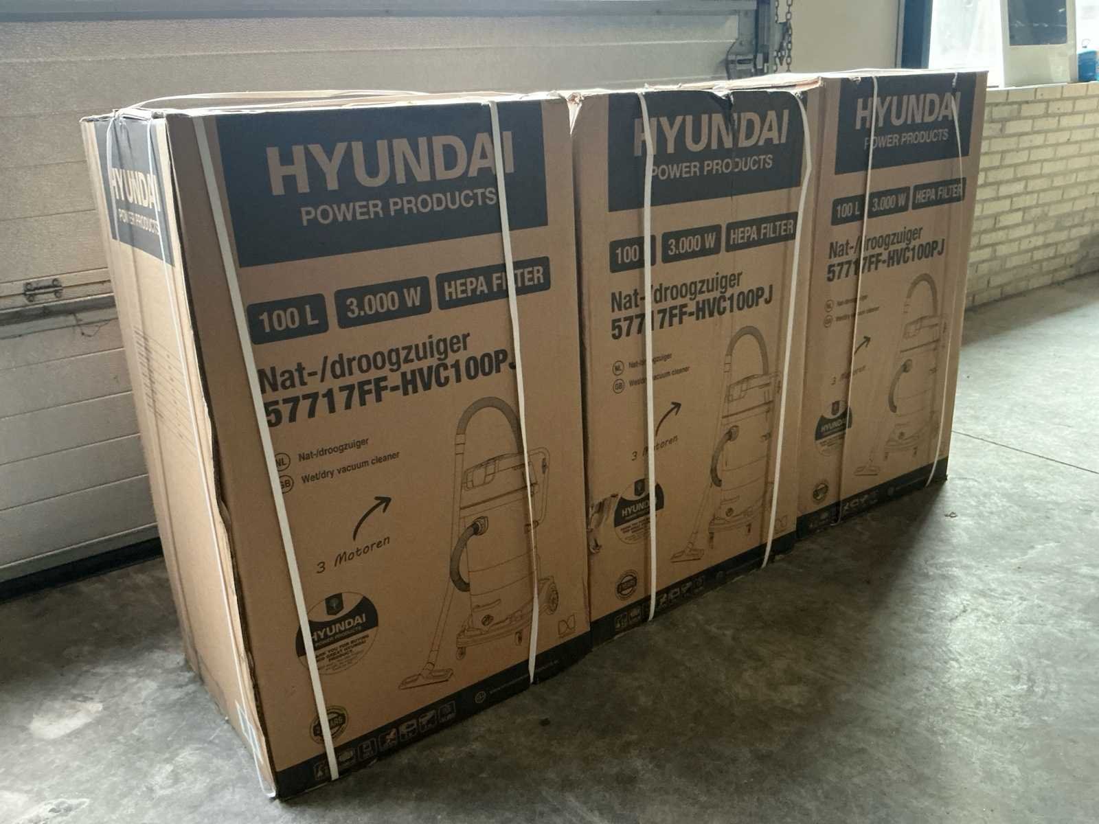 Voorzien van; 3X Hyundai Nat/ droogzuiger Nee Merk: Hyundai Type: HVC100PJ Bouwjaar: 2025 Serienummer: 57717FF Vermogen: 3000W Nat/droog zuiger: true
