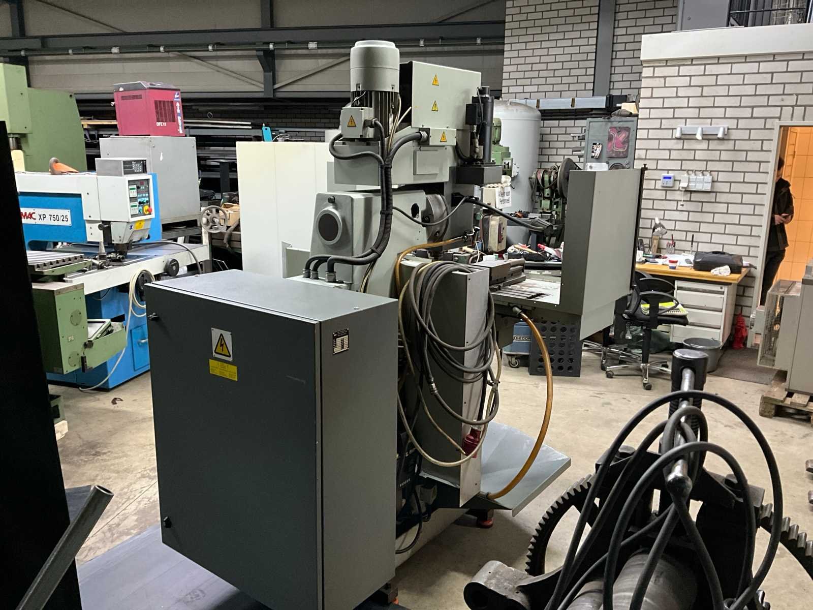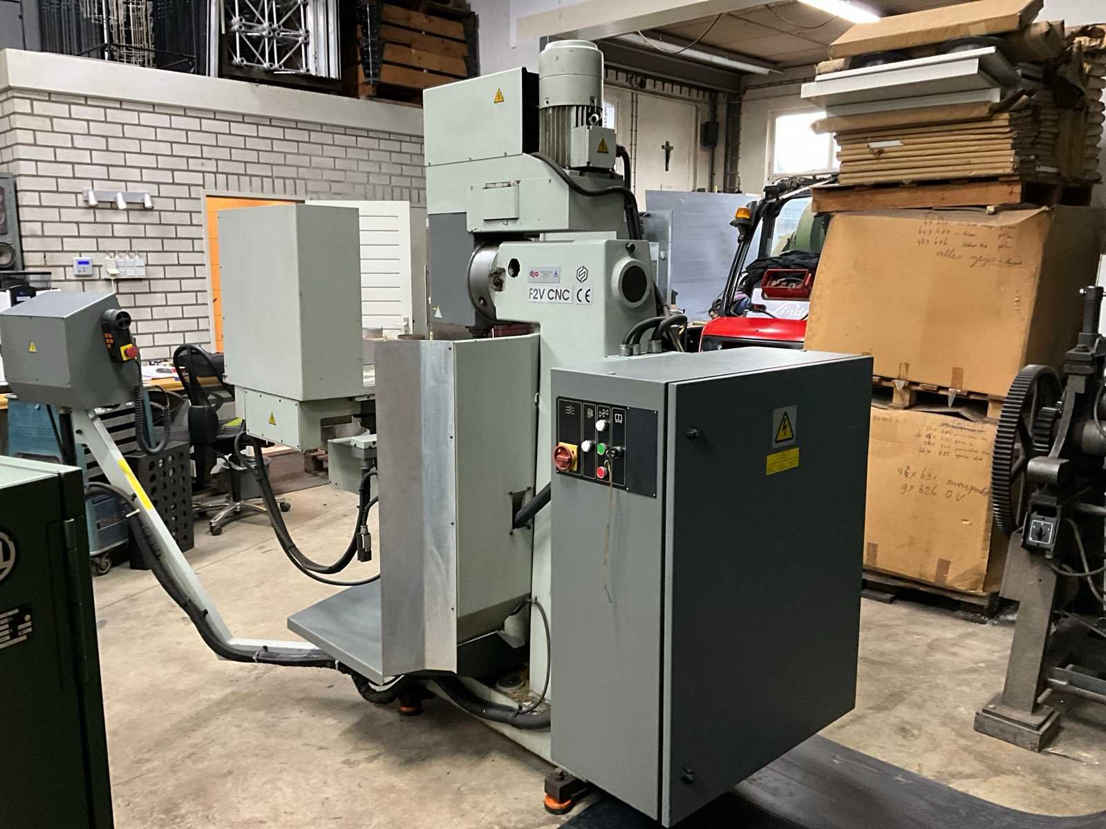 3x380V/50Hz; 32A; IP54/20; voorzien van: Yasakawa VSRISPEED 606PC; Heisenhain TN310 digitale aansturing; machineklem; diverse frezen; documentatie; automatisch koel/smeersysteem; LET OP: Koper is zelf verantwoordelijk voor het uithuizen van het kavel. Er is een heftruck aanwezig! No Merk: Tos Type: F2V-CNC-E Bouwjaar: 1995 Serienummer: 591811 Verplaatsing x-as: 600mm Verplaatsing y-as: 355mm Verplaatsing z-as: 152mm Opname iso: 40 Snelheid van n =: 60rpm Snelheid tot n =: 4000rpm CNC-besturing, merk, type: Heisenhain TN310 Motorvermogen (kW): 3.00kW Aansluiting: 3V Machinegewicht: 1400kg Afmeting l: 1750mm Afmeting b: 2660mm Afmeting h: 2300mm