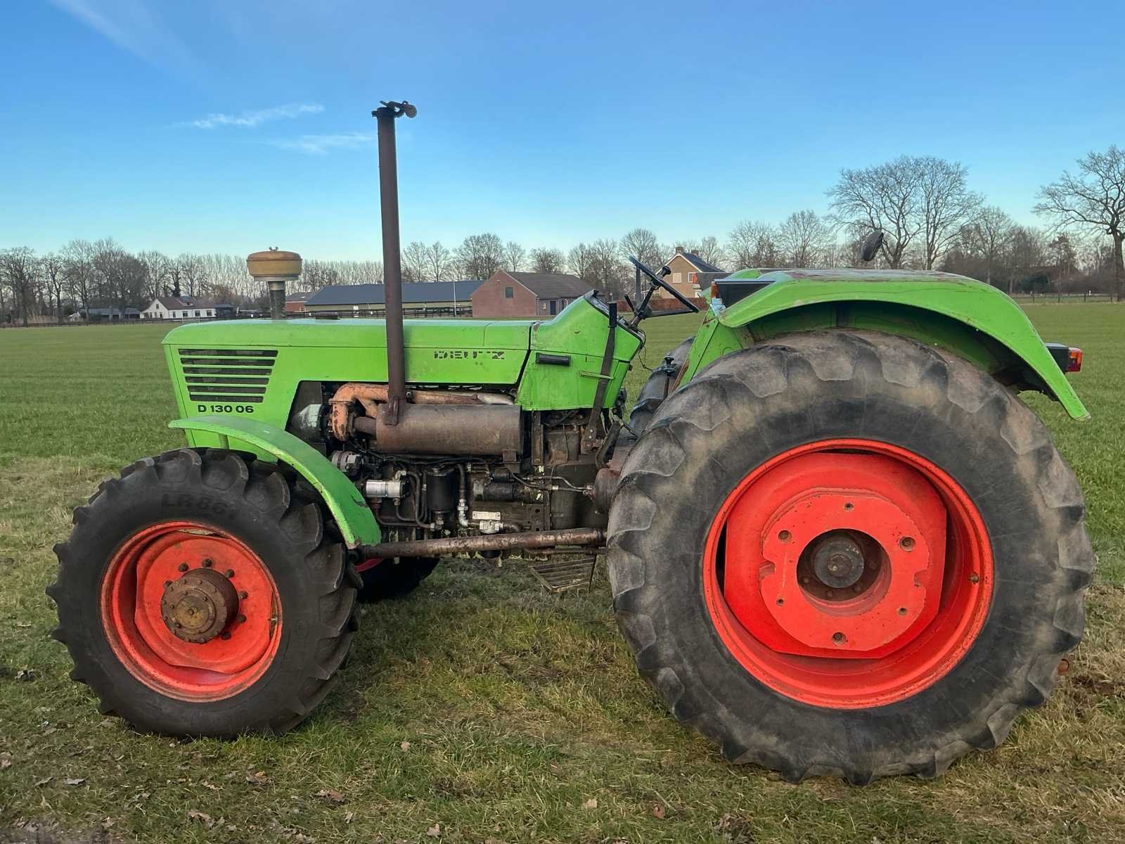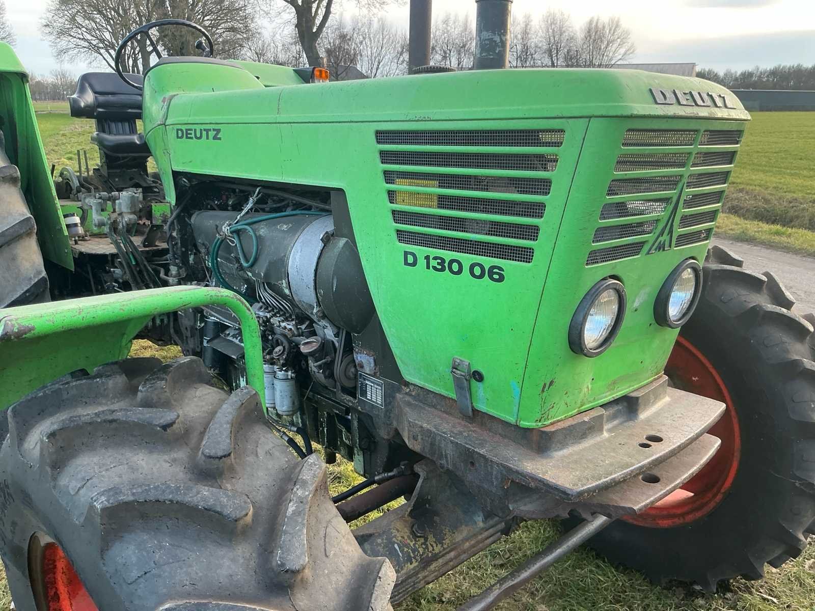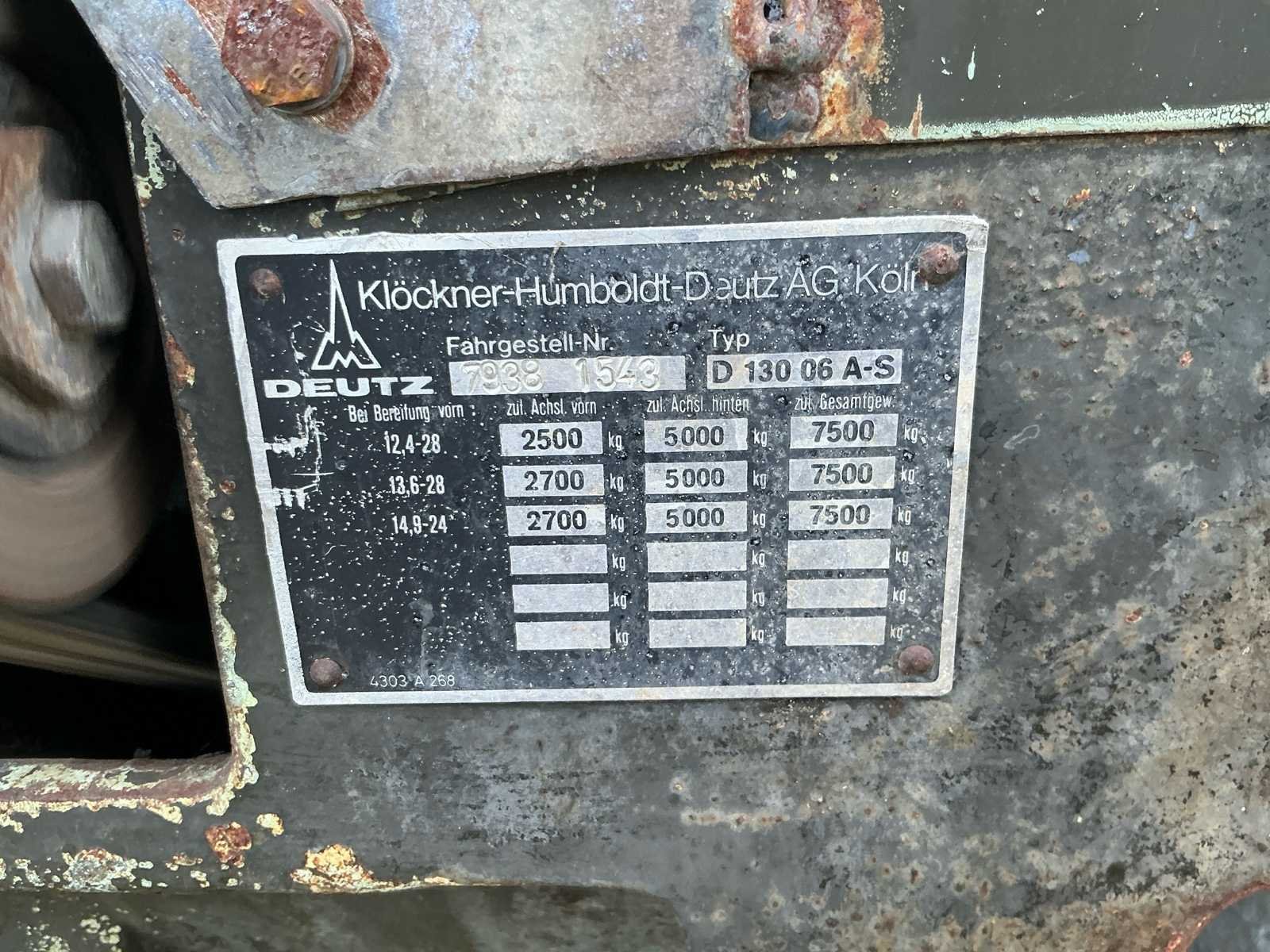 Aandrijving: A = Allrad (4WD), Uitvoering: S = Schnellgang, Motor Type: Deutz BF6L912 (luchtgekoeld), Configuratie: 6-cilinder lijn, Cilinderinhoud: circa. 6,1 liter, Vermogen: circa. 130 pk bij ~2300 rpm, Brandstof: Diesel, Koeling: Luchtgekoeld, Hefkracht: ca. 4.500–5.000 kg, Hydrauliekpomp: ~45 l/min, Aftakas (PTO): 540 / 1000 rpm, Hefinrichting: Categorie II / III Nee Merk: Deutz Type: D 130 06 A-S Bouwjaar: 1976 Serienummer: 7933 15-3 Kenteken: GEEN Motorvermogen (kW): 96kW Afgelezen urenstand: 8227 Versnellingsbaktype: Hangeschakeld Bandenmaat voor: 340/85R28 Bandenmaat achter: 20.8-38 Aantal hydraulische ventielen achter: 3 Eigen gewicht: 6500kg Totale afmeting L: 4000mm Totale afmeting Breedte: 2250mm Totale afmeting Hoogte: 2600mm Chassisnummer: E730757