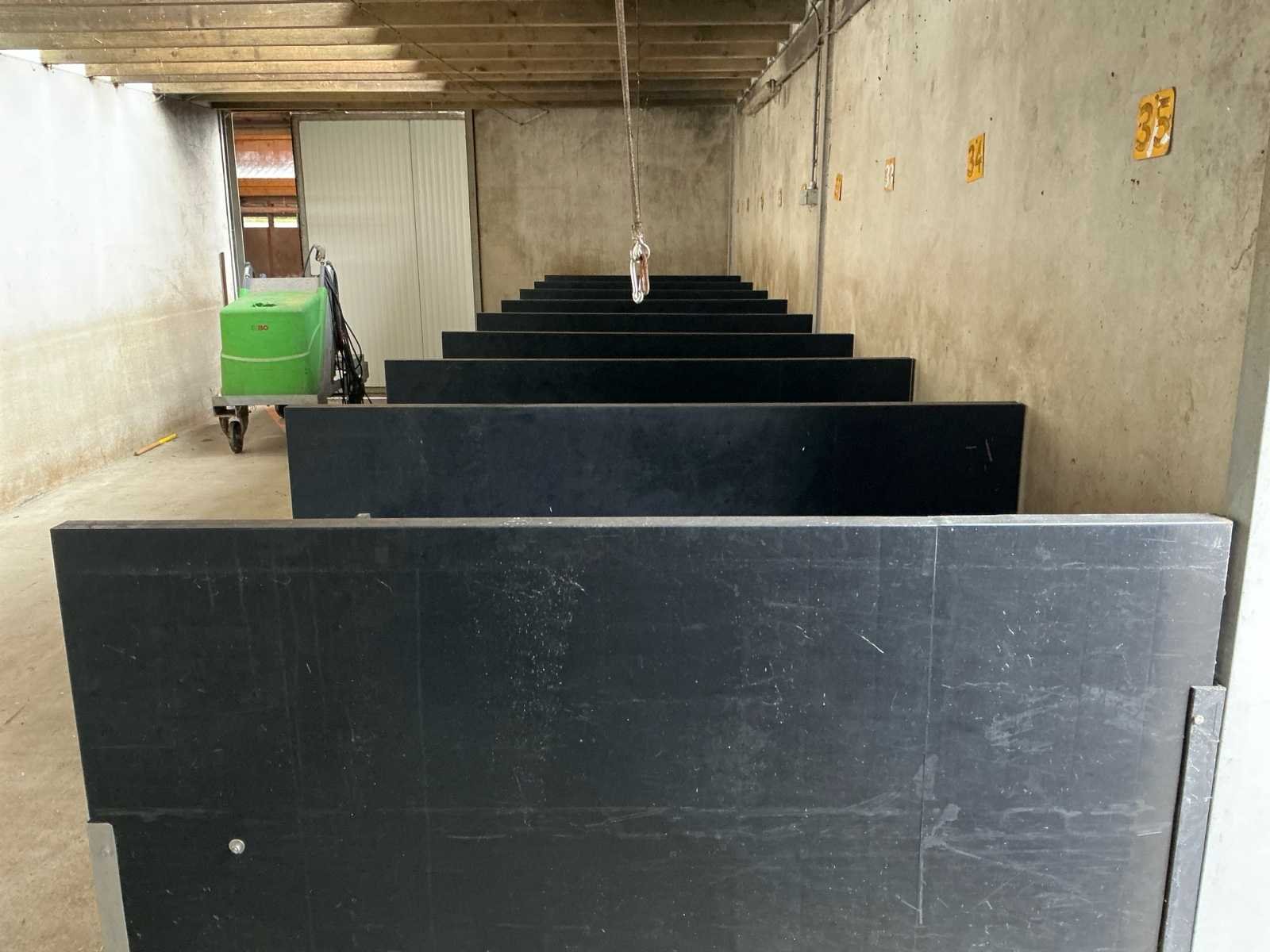 Bestaat uit: complete set van 18 individuele kalverboxen, 18 kunststof schotten, 18 RVS U-profielen, binnenafmetingen per box, breedte: 890 mm, lengte: 1.500 mm, hoogte: 1.250 mm, kunststof schotten: 1.700 x 1.250 x 50 mm, gemonteerd met kunststof U-profiel tegen wand, voorzijde voorzien van RVS U-profielen met voetstuk, gegalvaniseerd, afsluitbaar deurtje onderzijde voorzien van kunststof plaat, inclusief metalen houders voor voer-/drinkemmers (2 ringen per box), degelijke en hygiënische uitvoering 18 stuks, totale lengte inclusief tussenwanden(voor 9 stuks): ca. 8.410mm, betreft 2 opstellingen van 9 stuks, wordt door verkoper professioneel gedemonteerd, klaar voor belading en transport. No Totale afmeting L: 1700mm Totale afmeting Breedte: 50mm Totale afmeting Hoogte: 1250mm