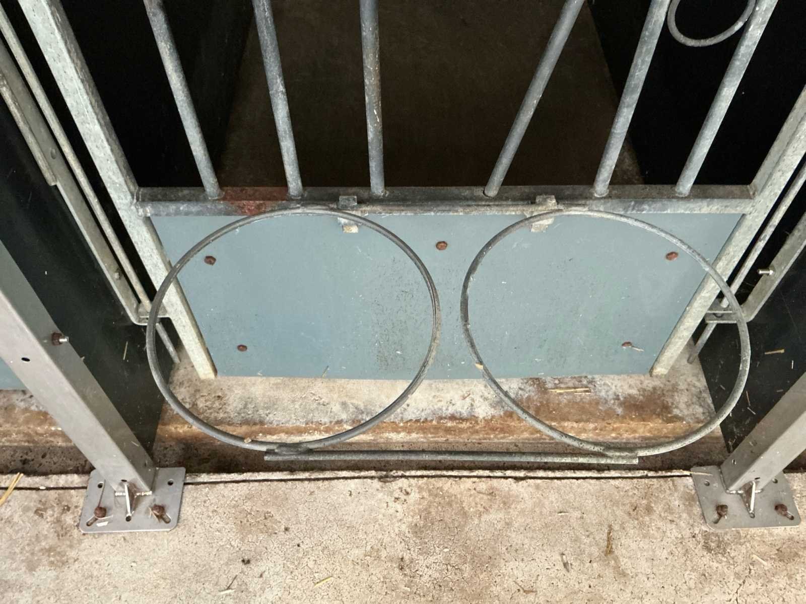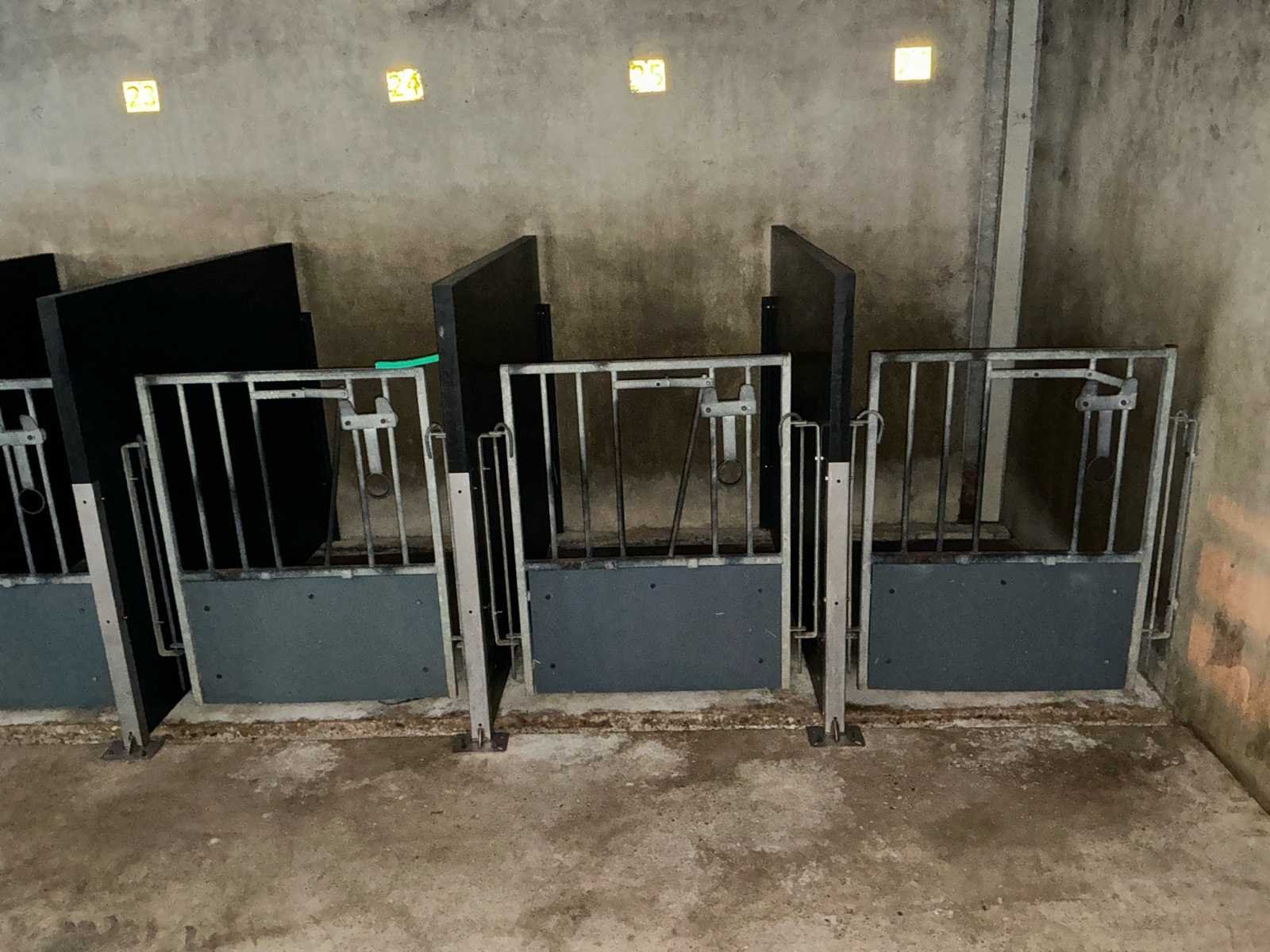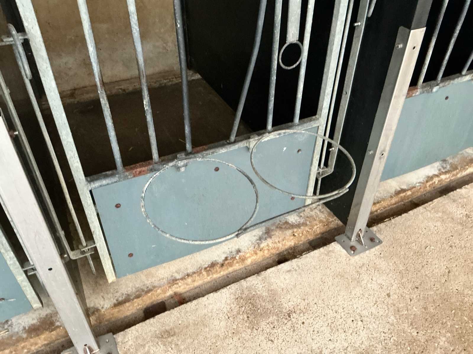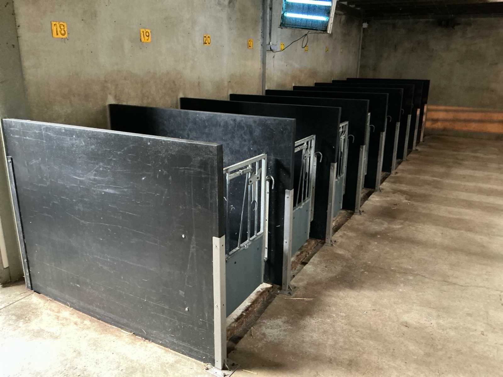 Bestaat uit: complete set van 9 individuele kalverboxen, 9 kunststof schotten, 9 RVS U-profielen, binnenafmetingen per box, breedte: 890 mm, lengte: 1.500 mm, hoogte: 1.250 mm, kunststof schotten: 1.700 x 1.250 x 50 mm, gemonteerd met kunststof U-profiel tegen wand, voorzijde voorzien van RVS U-profielen met voetstuk, gegalvaniseerd, afsluitbaar deurtje onderzijde voorzien van kunststof plaat, inclusief metalen houders voor voer-/drinkemmers (2 ringen per box), degelijke en hygiënische uitvoering 9 stuks, totale lengte inclusief tussenwanden(voor 9 stuks): ca. 8.410mm, betreft 1 opstellingen van 9 stuks, wordt door verkoper professioneel gedemonteerd, klaar voor belading en transport. No