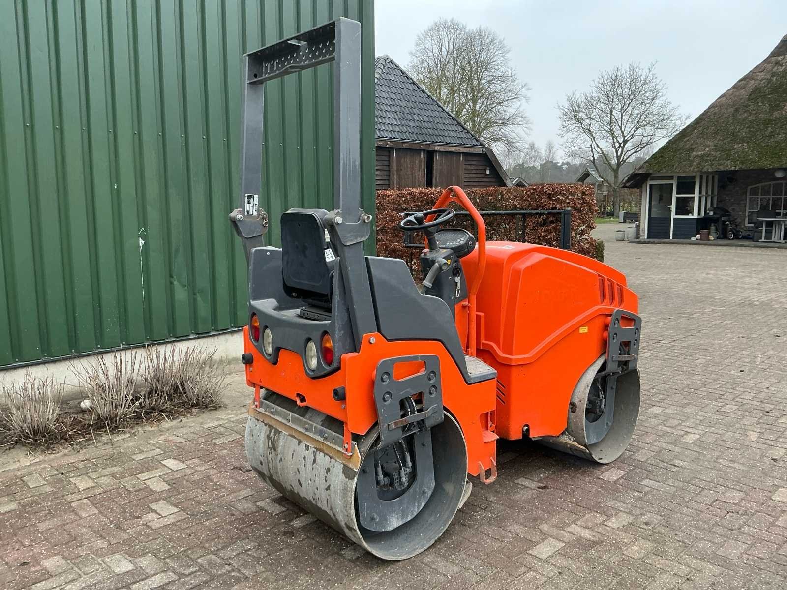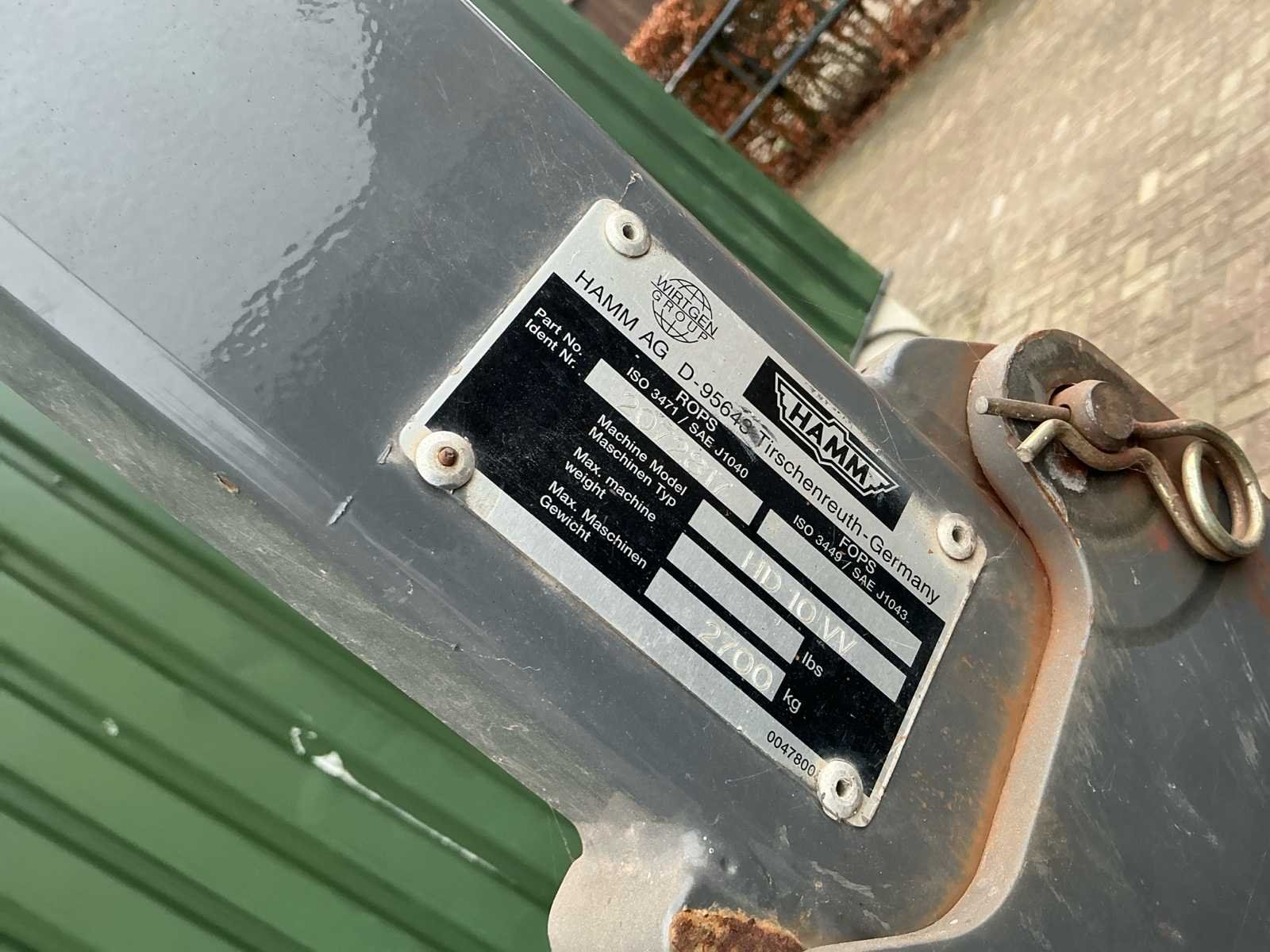 Voorzien van: 1600 uur, Sproei instalatie achter. De Hamm HD 10 W (bouwjaar 2007, ±1.600 uur) is een dubbelwals trilwals met een 22 kW (±30 pk) dieselmotor, werkbreedte 1,00 m, walsdiameter ca. 700 mm, bedrijfsgewicht ±2.700 kg (leeg ±2.200 kg, max. 3.000 kg) en afmetingen ca. 2,50 × 1,00 × 2,50 m (l×b×h), geschikt voor asfalt- en licht verdichtingswerk. No Merk: Hamm Type: HD10W Bouwjaar: 2007 Serienummer: H1710276 Werkbreedte: 1000mm Diameter circa: 700mm Eigen gewicht: 2700kg Totale afmeting L: 2500mm Totale afmeting Breedte: 1000mm Totale afmeting Hoogte: 2500mm