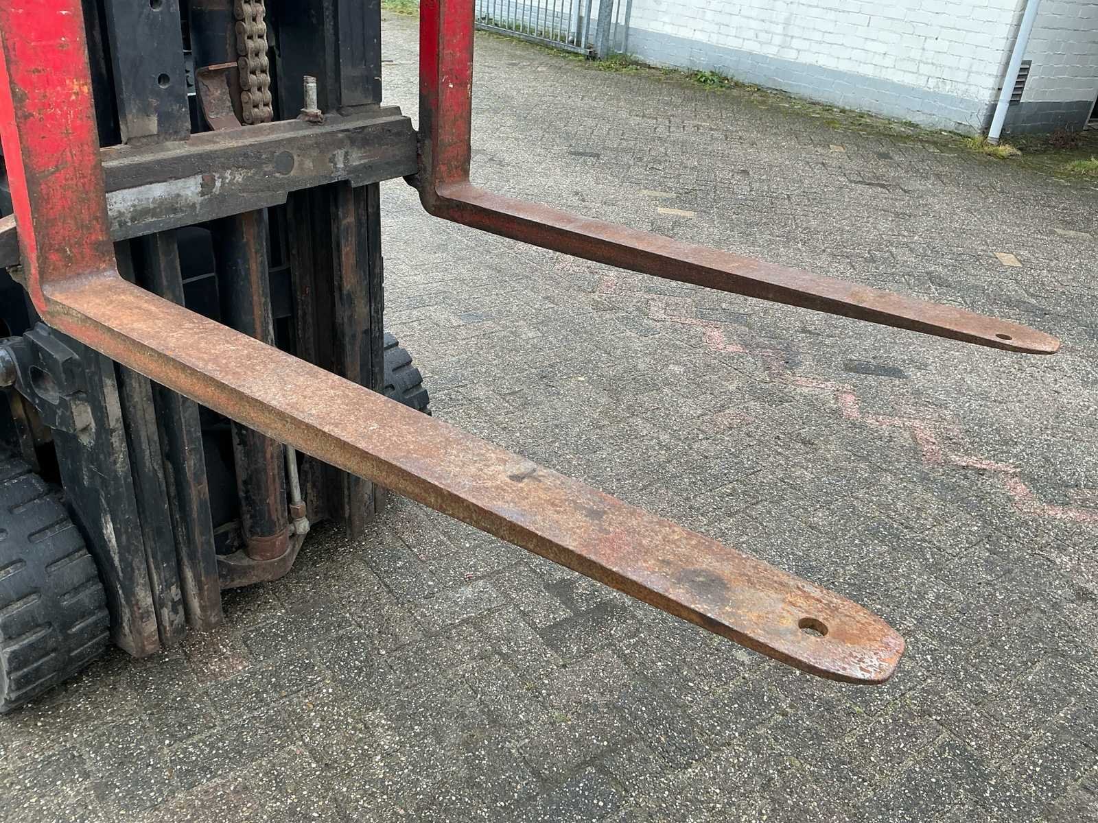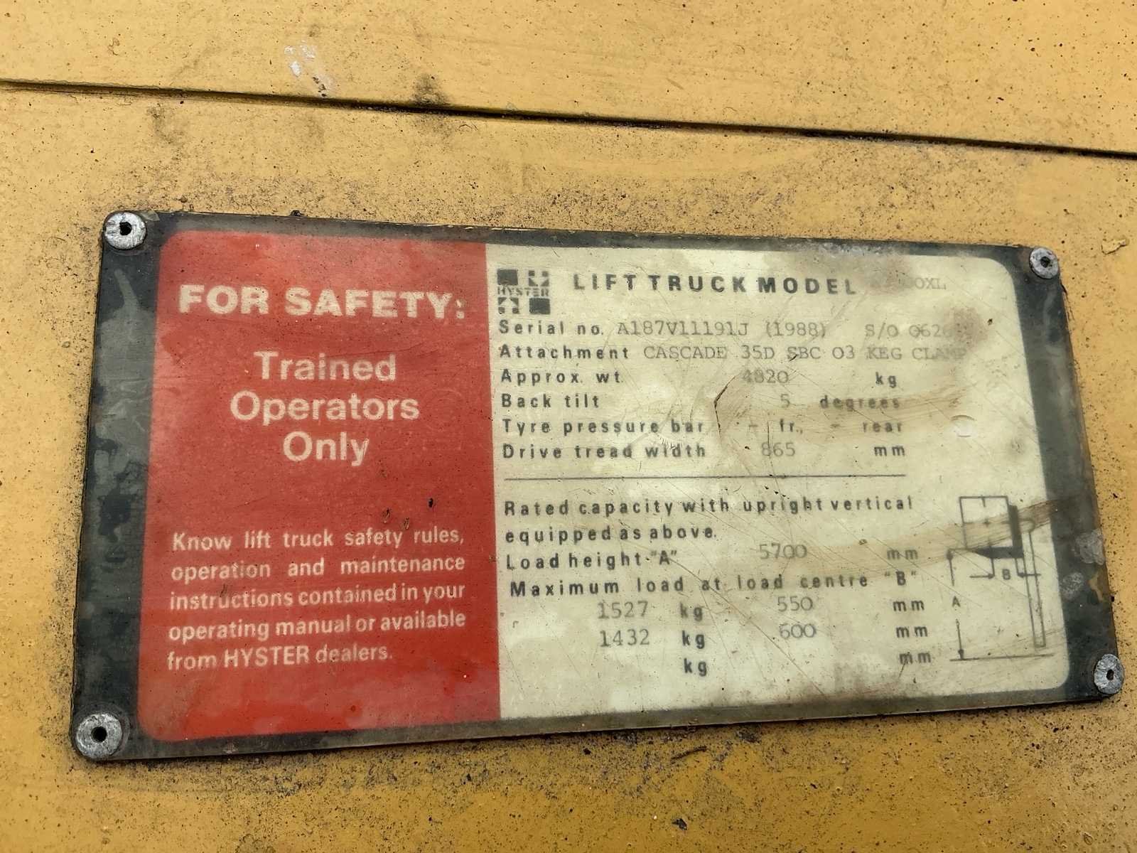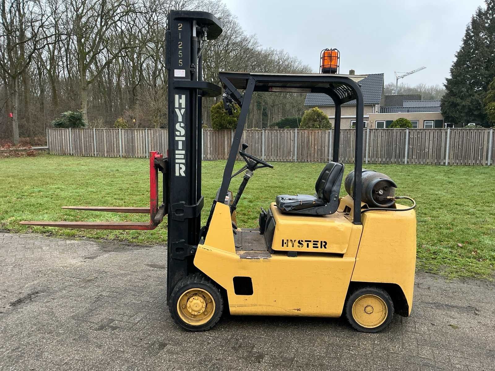 Voorzien van: werkverlichting, derde functie Nee Merk: Hyster Type: S3.00XL Bouwjaar: 1988 Serienummer: A187V1119IJ Brandstof: Lpg Mast: Triplex Soort band: Volrubber Aantal wielen: 4 Afgelezen urenstand: 3322 Free-lift: true Triple mast: true Eigen gewicht: 4440kg Hefvermogen: 1204kg Lepellengte: 1060mm Max. hefhoogte: 5700mm Vol rubber banden: true Minimale doorrijhoogte: 2600mm Totale afmeting L: 3360mm Totale afmeting Breedte: 1030mm Totale afmeting Hoogte: 2600mm LPG: true