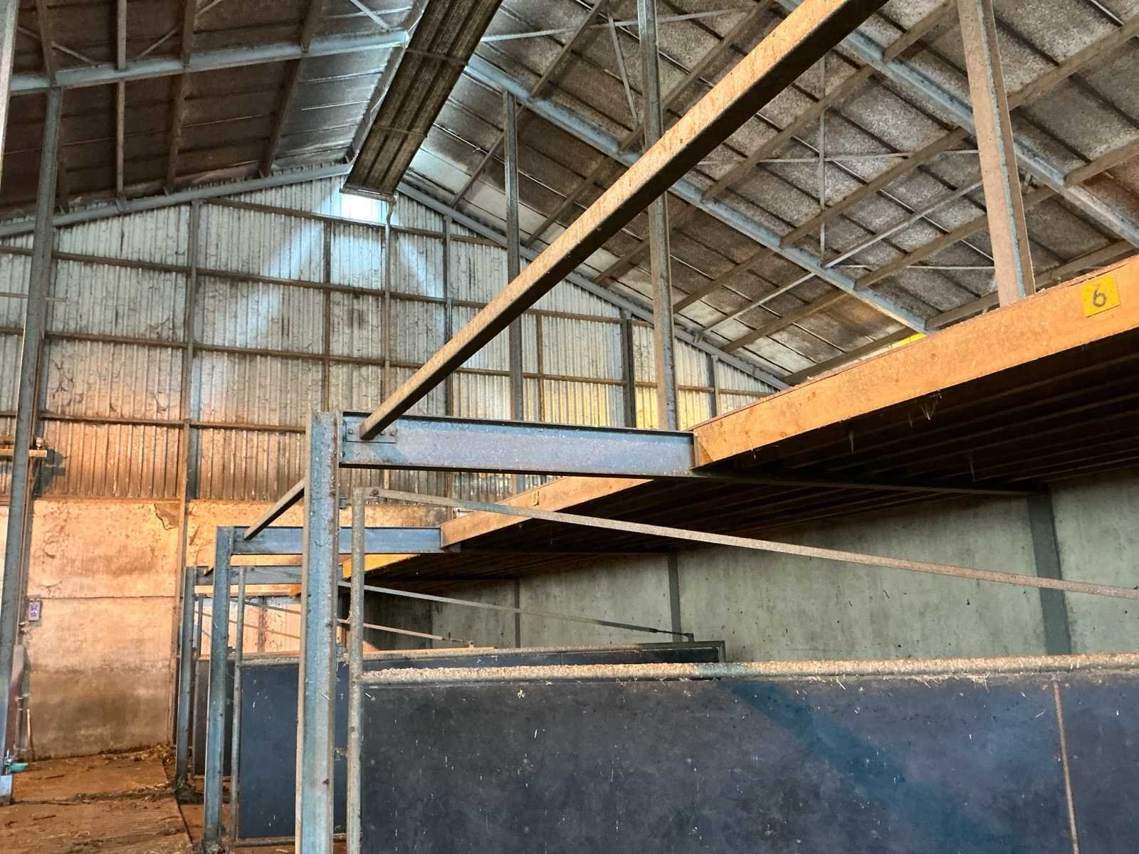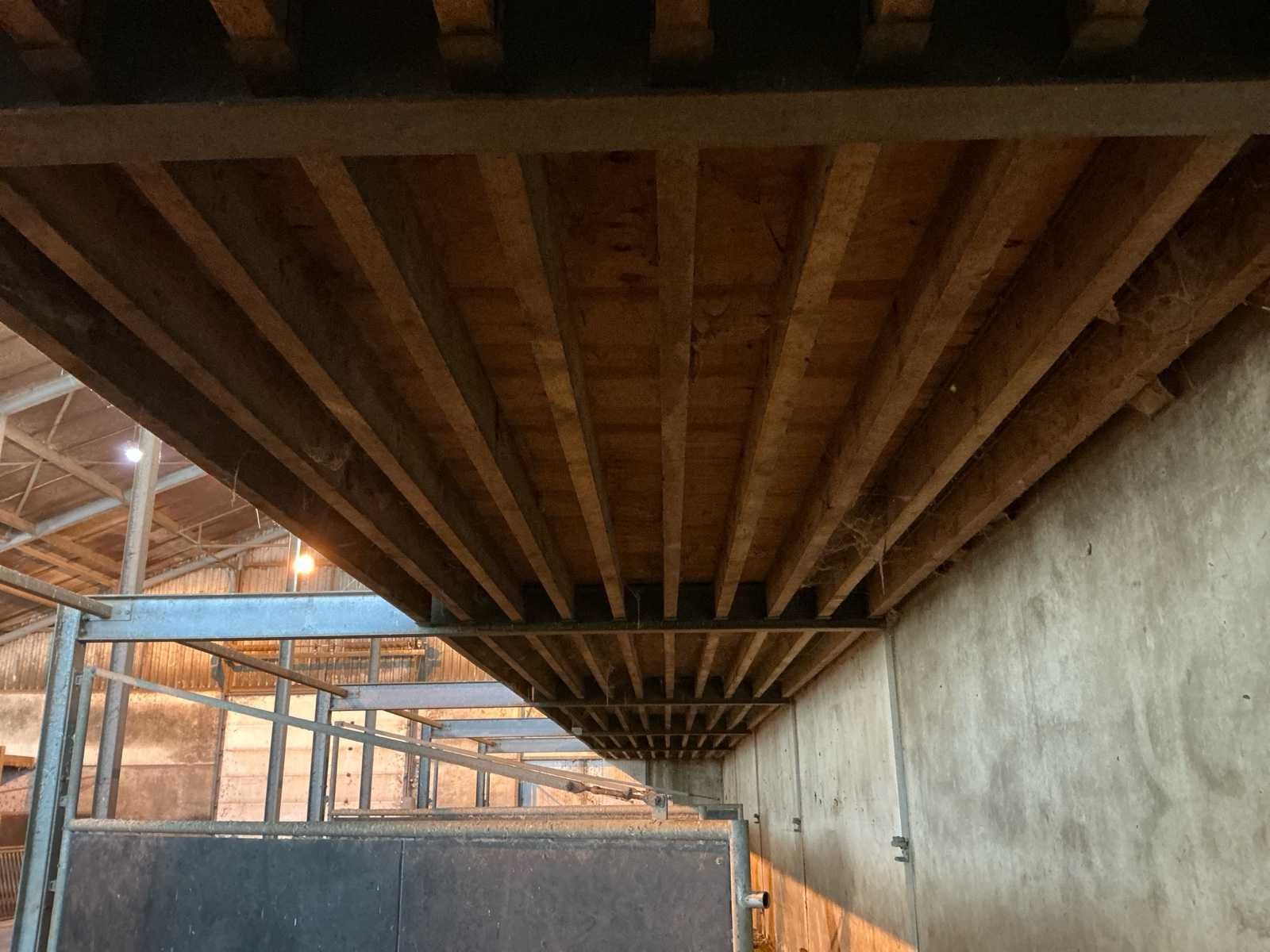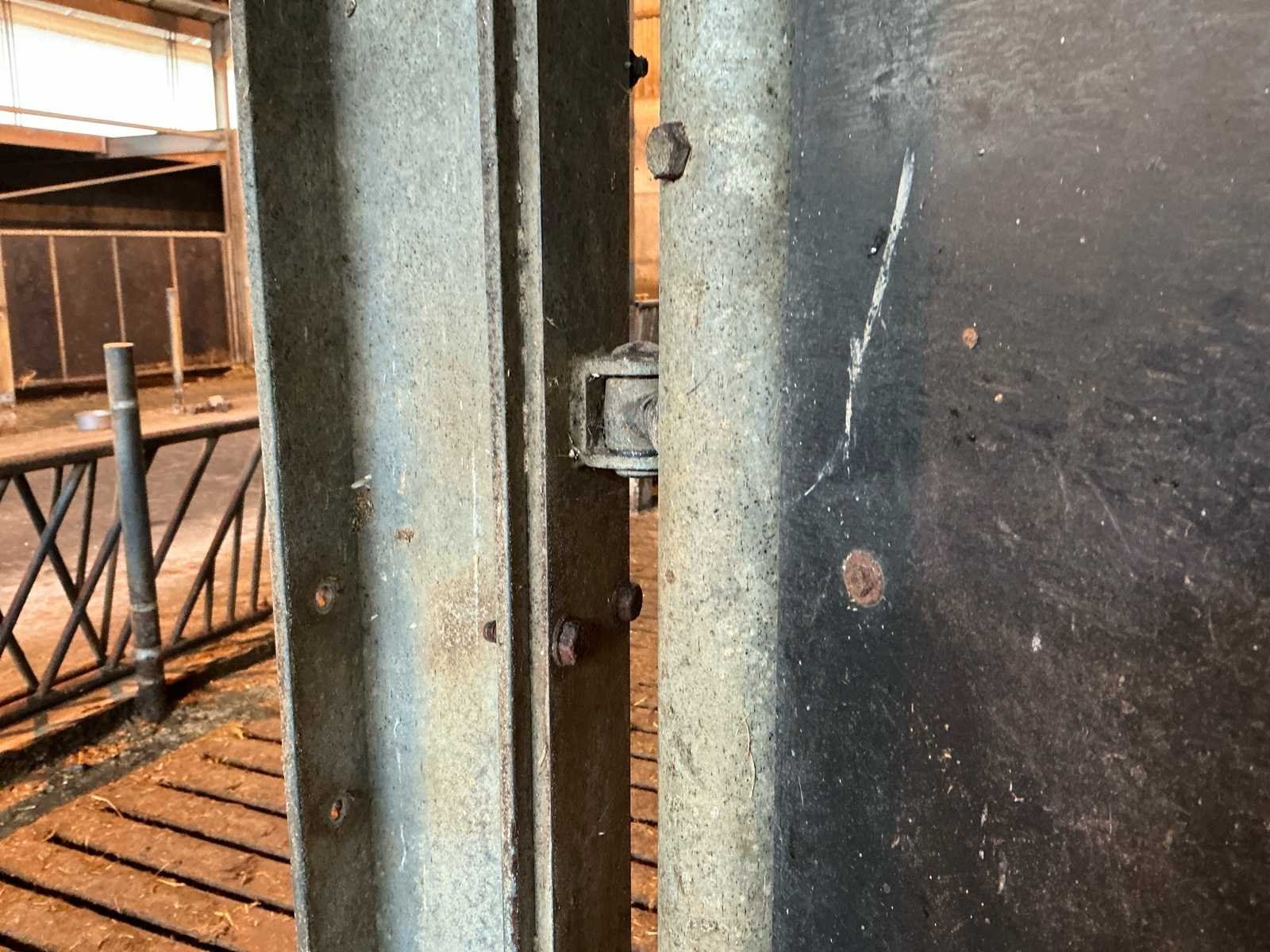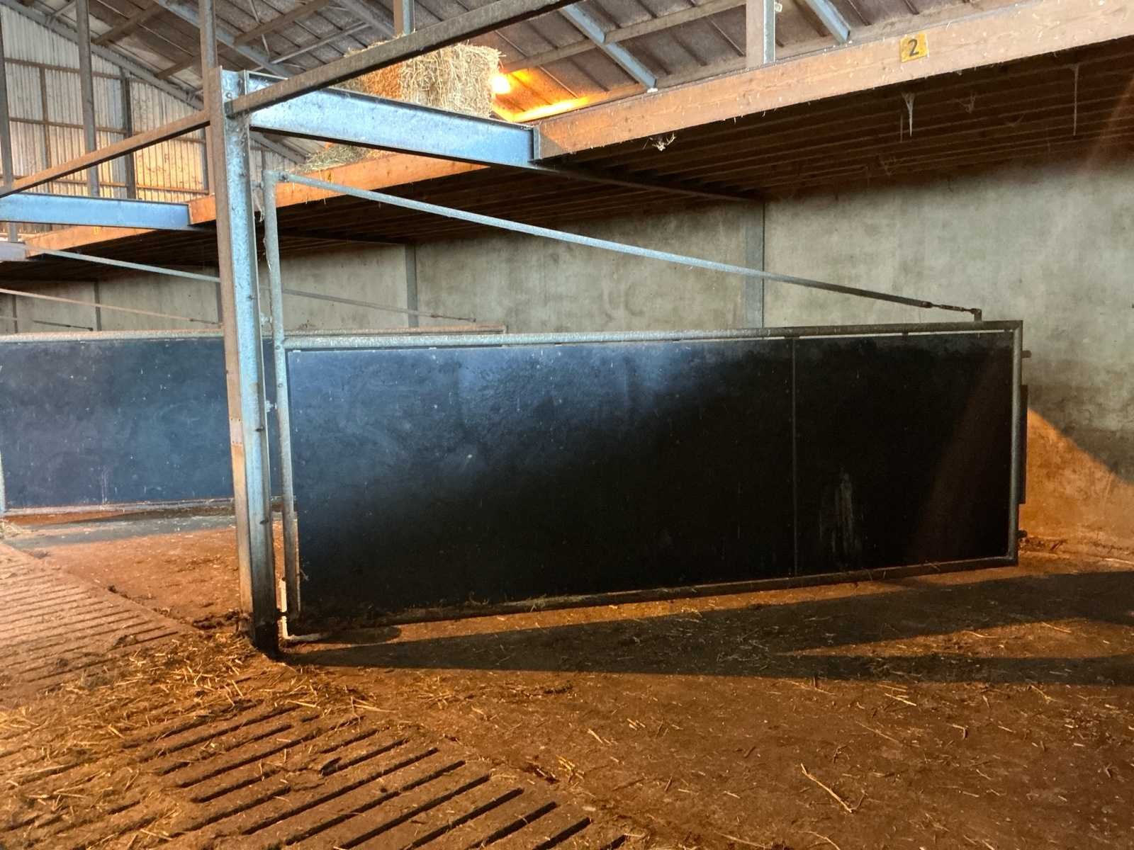 Bestaat uit: complete stalinrichting bestaande uit 6 stalen draaipoorten, bijbehorende staalconstructie (hoofddraagconstructie) en houten vloer-/balklaag, constructie uitgevoerd in zware agrarische kwaliteit, geschikt voor heropbouw of hergebruik, poorten 6 stuks, stalen draaipoorten, afmetingen per poort: breedte: 4.800 mm, hoogte: 1.650 mm, hoogte buisconstructie: 2.500 mm, scharnieren: 4 per poort, scharnierstift: Ø ca. 100 mm, lengte: 2.500 mm, bevestigd met 10 bouten per scharnieropstelling, gelaste en gegalvaniseerde staalconstructie, zware industriële/staltoepassing, staalconstructie (hoofddraagconstructie) spantbreedte: 4.885 mm, spantprofiel: 135 mm breed, 270 mm hoog, kokerprofielen: 70 x 70 mm, lengte: 4.900 mm, H-balken: 5 stuks, staanders: 5 stuks (let op: staanders zijn in beton verankerd en maken géén onderdeel uit van de verkoop, constructie uitgevoerd met gelaste en geboute verbindingen, houten vloer-/balklaag, houten balken: 60 stuks, afmetingen: 220 x 70 mm, lengte: 4.900 mm, underlayment platen: 24 stuks, aanvullend 4 platen, toegepast als dragende vloerconstructie, stalen poorten: ± 3.000 – 3.600 kg, staalconstructie (liggers, kokers, H-balken): ± 2.000 – 2.500 kg, houten balken en platen: ± 3.000 – 3.500 kg, totaal geschat gewicht: ca. 8.000 – 9.500 kg, totale lengte opstelling: ca. 29 meter, zie foto 2, in rood gemarkeerde delen, maken geen onderdeel van de aankoop, zie kavel 207 voor een zelfde opstelling. No Eigen gewicht: 9500kg Totale afmeting L: 29000mm