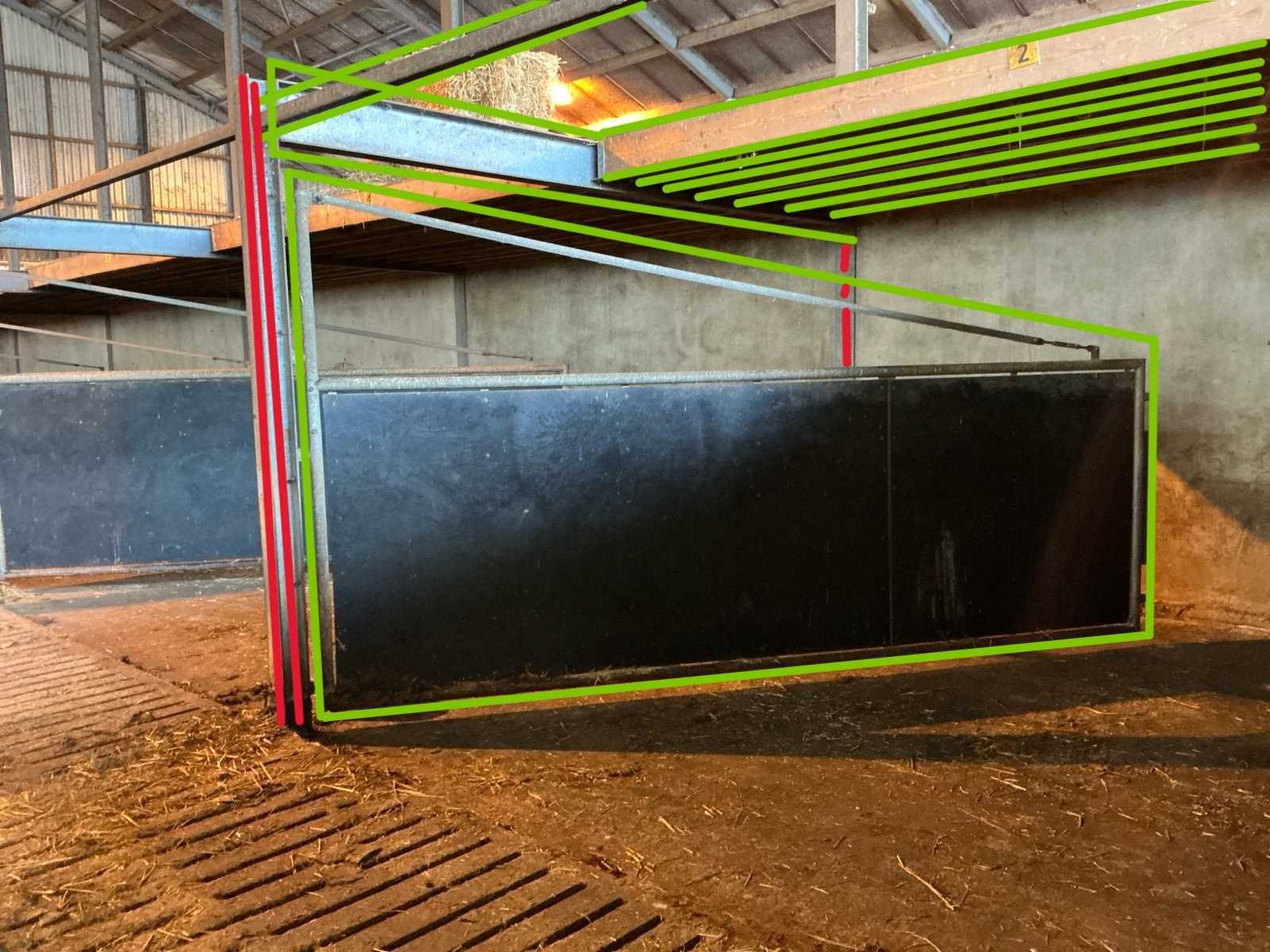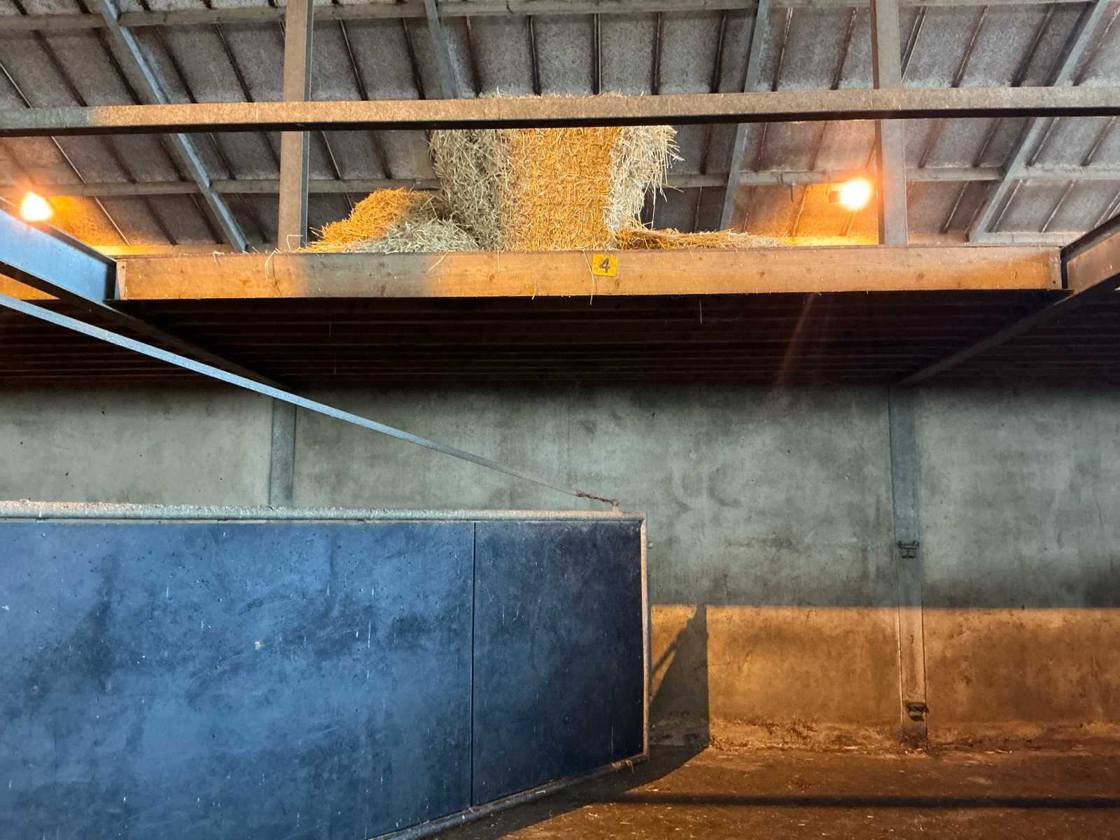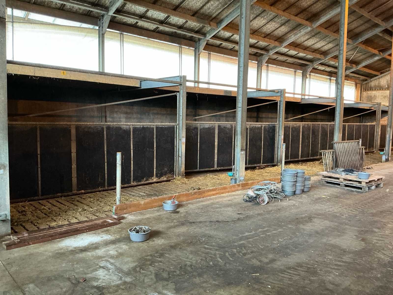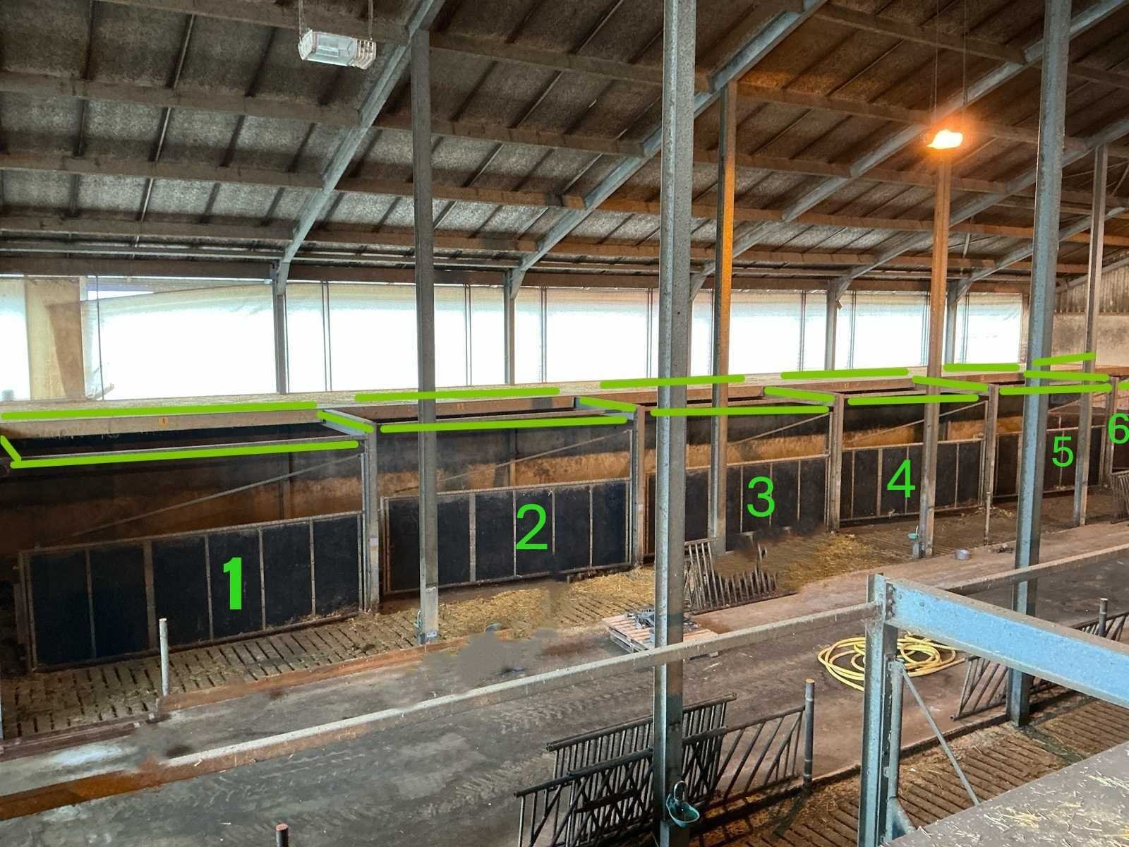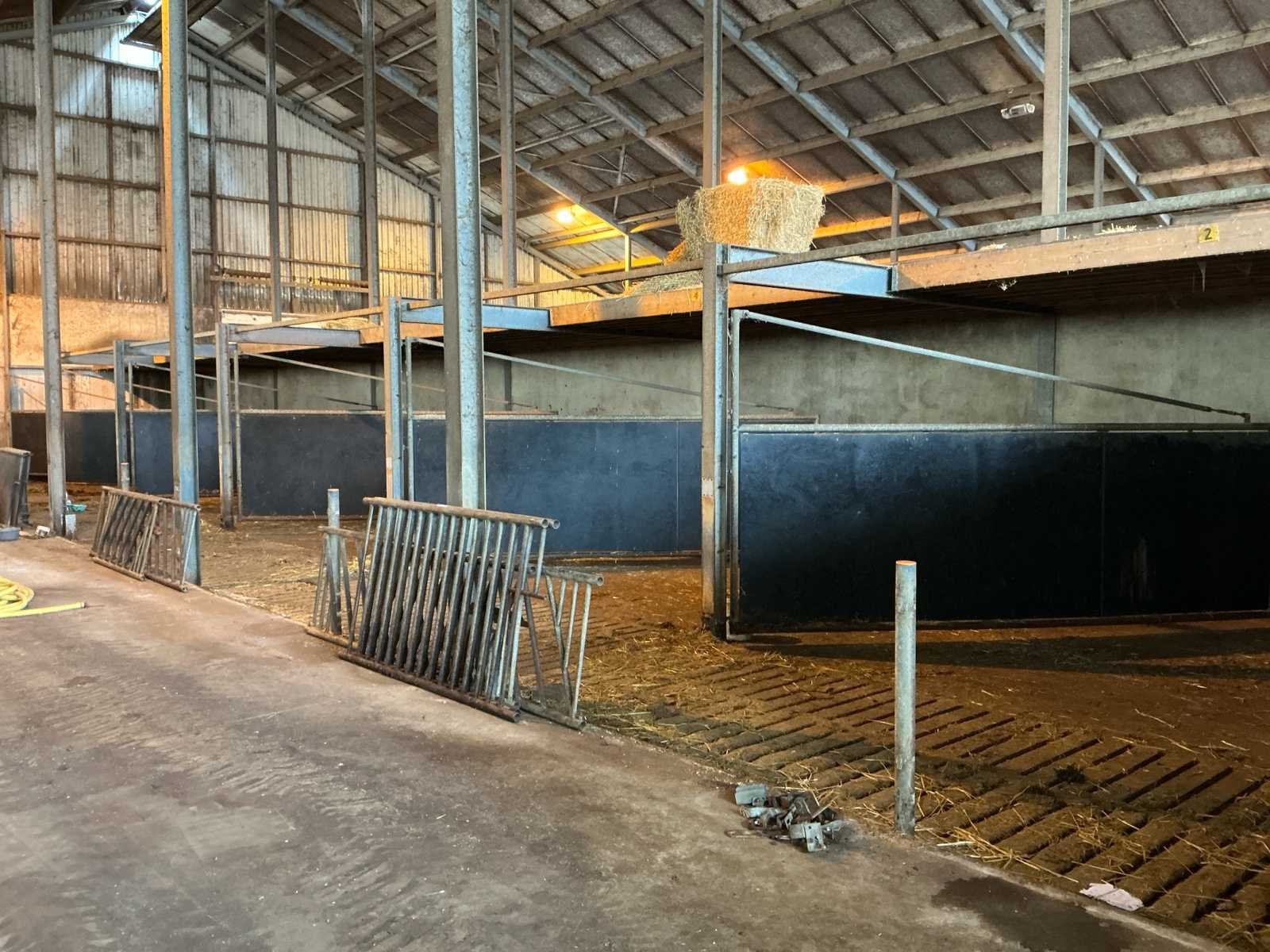 Bestaat uit: complete stalinrichting bestaande uit 6 stalen draaipoorten, bijbehorende staalconstructie (hoofddraagconstructie) en houten vloer-/balklaag, constructie uitgevoerd in zware agrarische kwaliteit, geschikt voor heropbouw of hergebruik, poorten 6 stuks, stalen draaipoorten, afmetingen per poort: breedte: 4.800 mm, hoogte: 1.650 mm, hoogte buisconstructie: 2.500 mm, scharnieren: 4 per poort, scharnierstift: Ø ca. 100 mm, lengte: 2.500 mm, bevestigd met 10 bouten per scharnieropstelling, gelaste en gegalvaniseerde staalconstructie, zware industriële/staltoepassing, staalconstructie (hoofddraagconstructie) spantbreedte: 4.885 mm, spantprofiel: 135 mm breed, 270 mm hoog, kokerprofielen: 70 x 70 mm, lengte: 4.900 mm, H-balken: 5 stuks, staanders: 5 stuks (let op: staanders zijn in beton verankerd en maken géén onderdeel uit van de verkoop, constructie uitgevoerd met gelaste en geboute verbindingen, houten vloer-/balklaag, houten balken: 60 stuks, afmetingen: 220 x 70 mm, lengte: 4.900 mm, underlayment platen: 24 stuks, aanvullend 4 platen, toegepast als dragende vloerconstructie, stalen poorten: ± 3.000 – 3.600 kg, staalconstructie (liggers, kokers, H-balken): ± 2.000 – 2.500 kg, houten balken en platen: ± 3.000 – 3.500 kg, totaal geschat gewicht: ca. 8.000 – 9.500 kg, totale lengte opstelling: ca. 29 meter, zie foto 2, in rood gemarkeerde delen, maken geen onderdeel van de aankoop, zie kavel 207 voor een zelfde opstelling. No Eigen gewicht: 9500kg Totale afmeting L: 29000mm