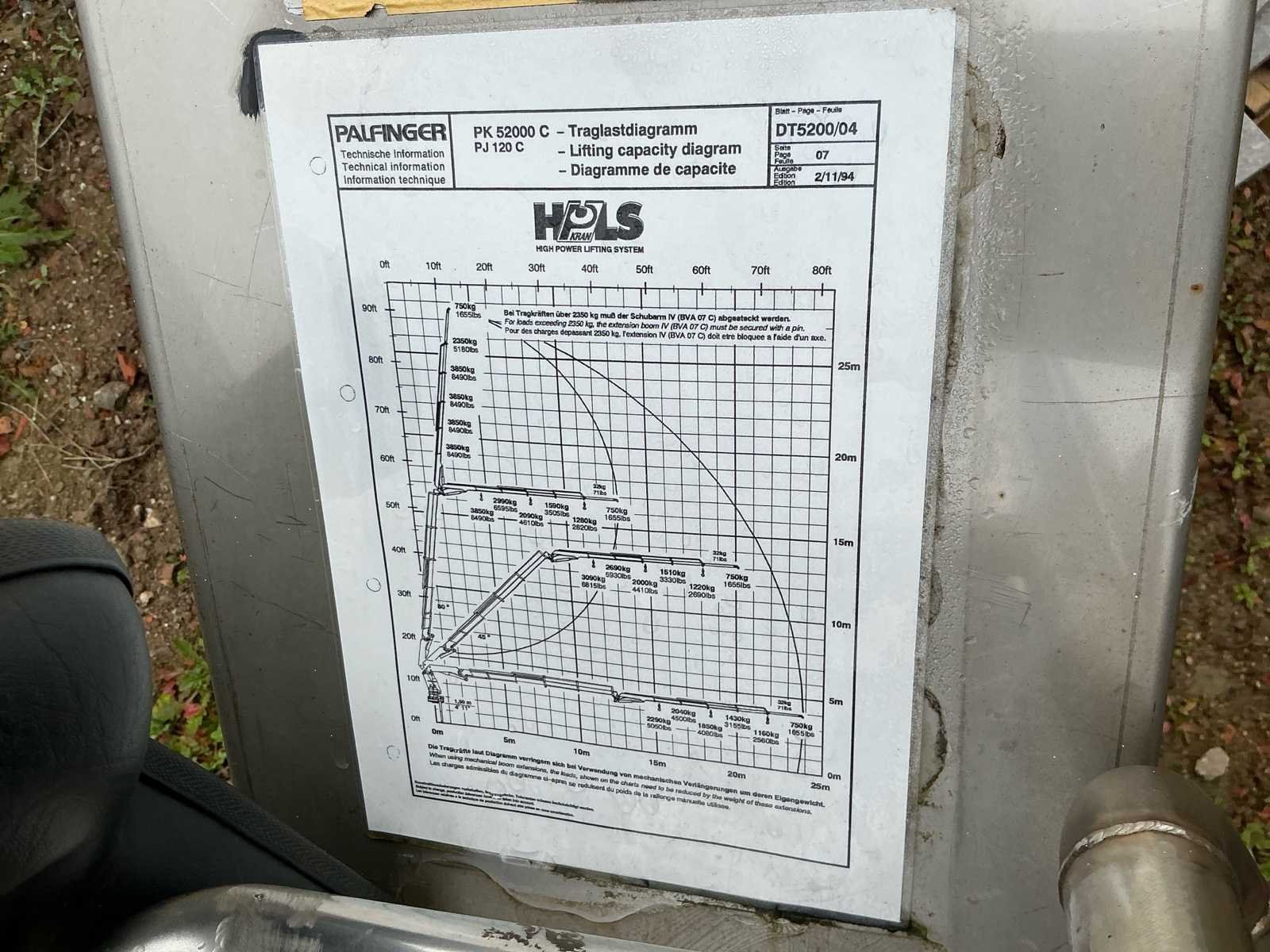 Aansluiting op PTO, Mechanische bediening, Hydrauliek slangen recentelijk vernieuwd (2023), volledige documentatie aanwezig. Nee Merk: Palfinger Type: PK 52000 C Bouwjaar: 1995 Max. hijscapaciteit: 15000kg Max. mastlengte: 20m Aantal mastdelen: 4 Max. hijshoogte: 25m Max. haakhoogte: 25m Met kraanboek: true Eigen gewicht: 6000kg Totale afmeting L: 2700mm Totale afmeting Breedte: 1500mm Totale afmeting Hoogte: 2900mm