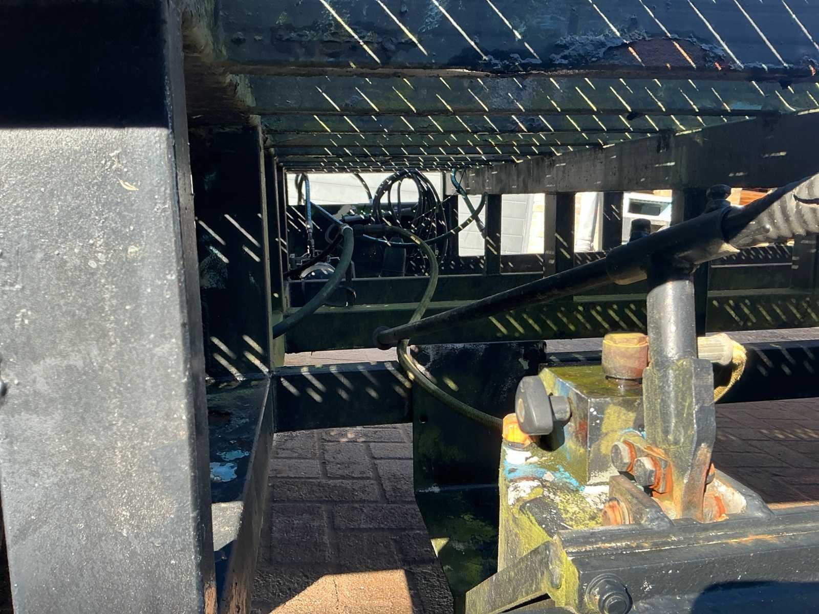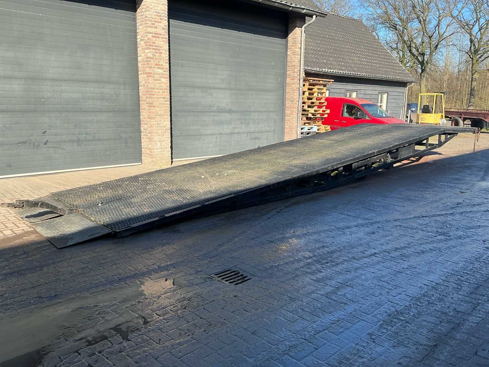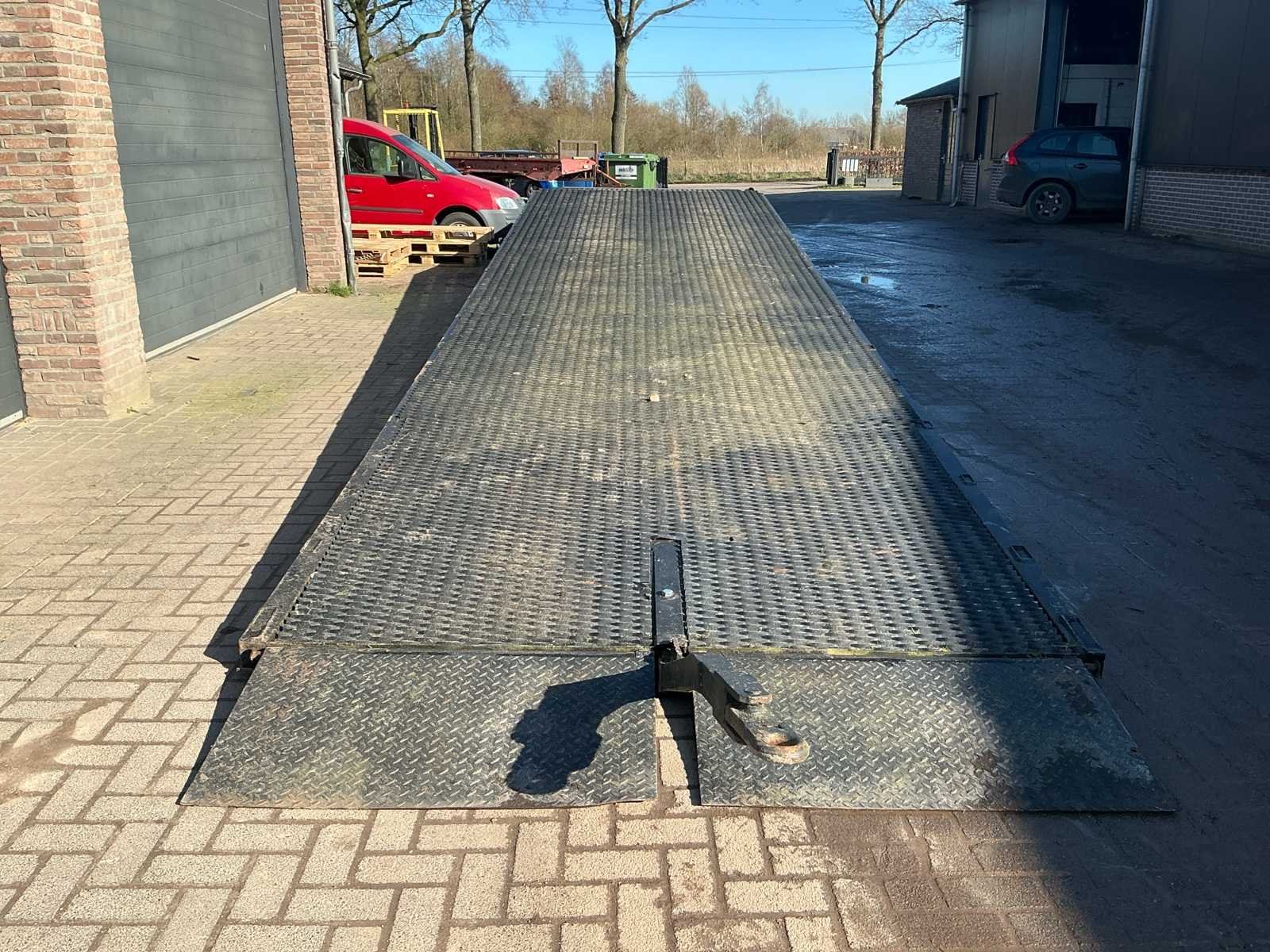 Voorzien van: handpomp, elektrische pomp, vol rubberen banden, haakoog, Zware stalen laadbrug / oprijplateau met traanplaat rijvlak, 12,00 meter lang en 2,50 meter breed, voorzien van oprijklep en robuust stalen frame, geschikt voor het laden van voertuigen, tractoren en machines, met een geschat draagvermogen van circa 10–15 ton. No Totale afmeting L: 12100mm Totale afmeting Breedte: 2400mm Totale afmeting Hoogte: 1000mm