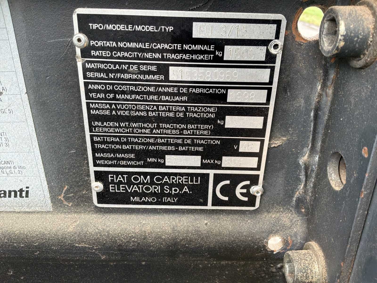 Zonder lader * urenstand niet afleesbaar No Merk: Fiat Type: FU 3/15 Bouwjaar: 1998 Serienummer: 5153580969 Brandstof: Elektrisch Aantal wielen: 3 Side-shift: true Hefvermogen: 1500kg Lepellengte: 1200mm Min. hefhoogte: 3300mm Vol rubber banden: true Minimale doorrijhoogte: 2150mm Totale afmeting L: 3000mm Totale afmeting Breedte: 950mm Leveringsvoorwaarden: Geladen op vrachtwagen