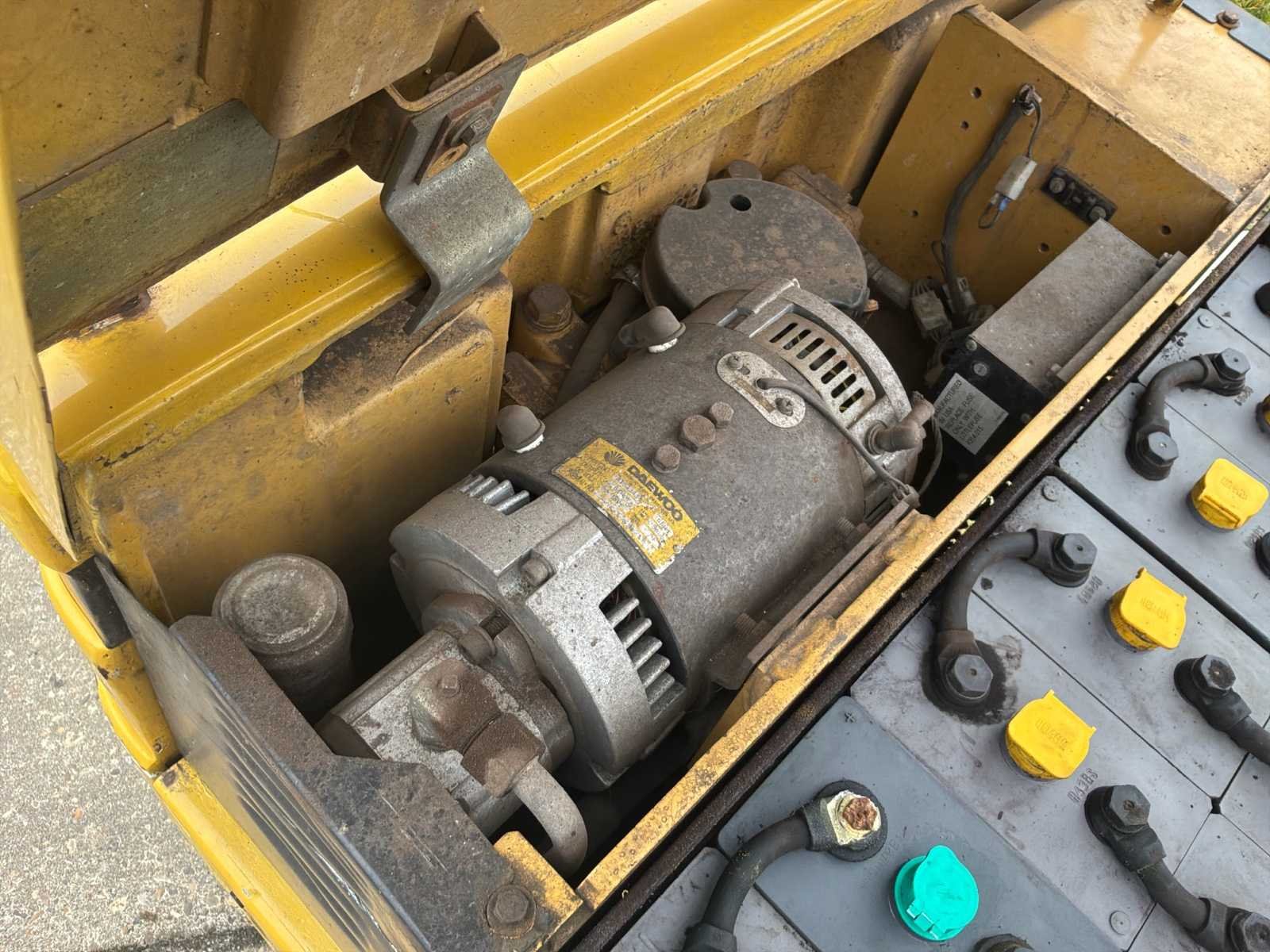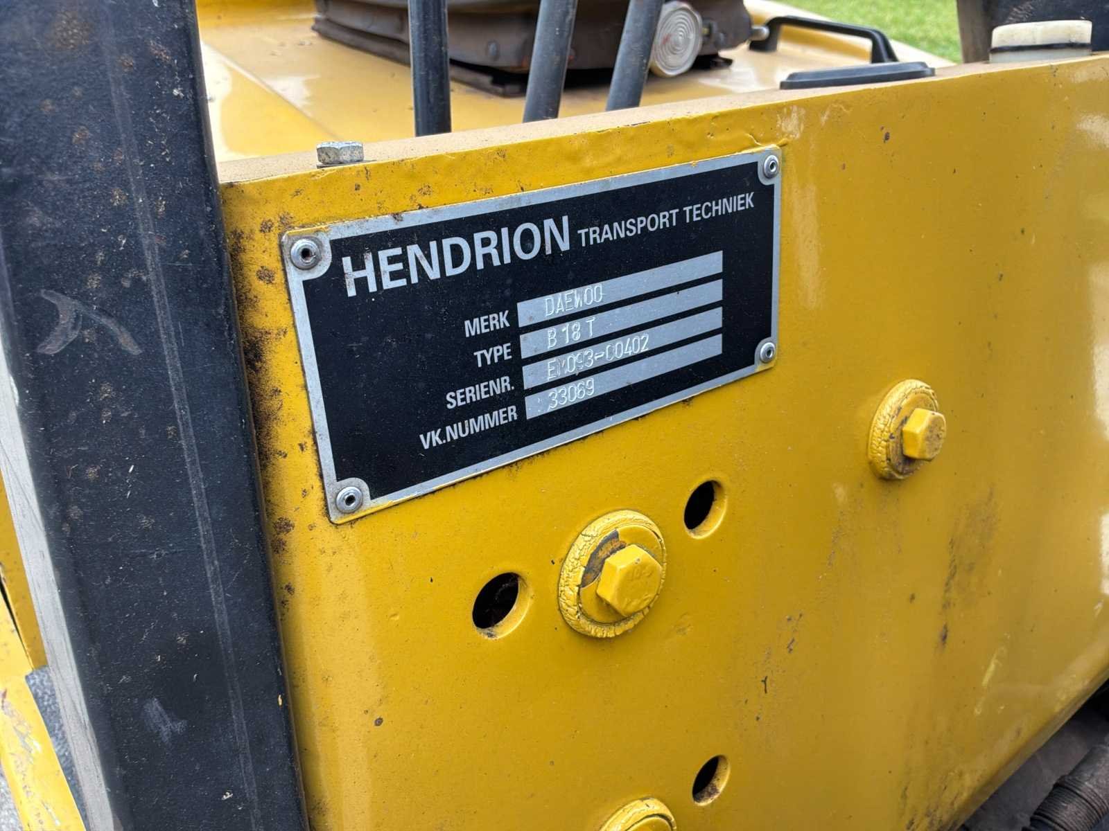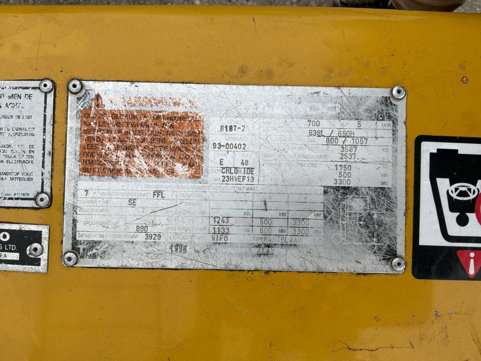 Zonder lader * 1 achterwiel ontbreekt * mogelijkheid voor 3e hydraulische functie No Merk: Daewoo Type: B18T-2 Bouwjaar: 1998 Serienummer: 93-00402 Brandstof: Elektrisch Aantal wielen: 3 Afgelezen urenstand: 8167 Free-lift: true Duplex mast: true Eigen gewicht: 3587kg Hefvermogen: 1800kg Lepellengte: 900mm Max. hefhoogte: 3300mm Vol rubber banden: true Minimale doorrijhoogte: 2100mm Totale afmeting L: 2800mm Totale afmeting Breedte: 1100mm Leveringsvoorwaarden: Geladen op vrachtwagen