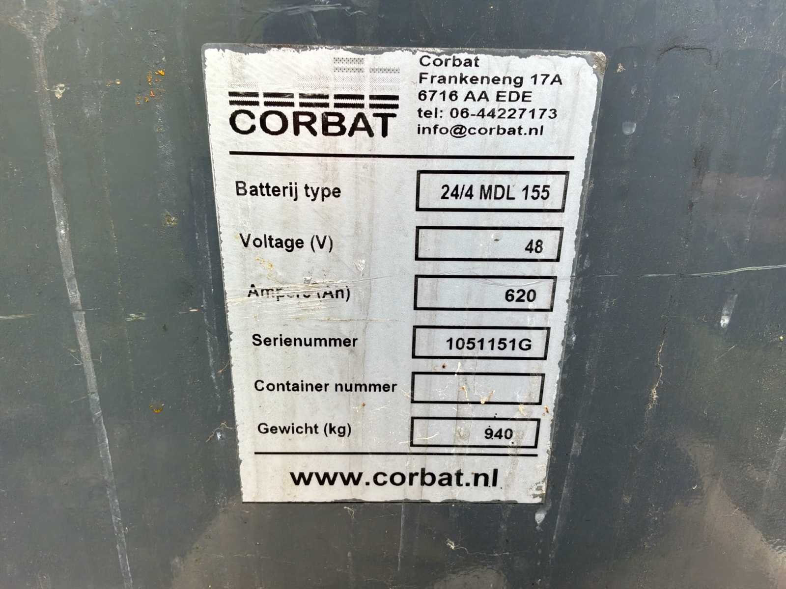 Inclusief pallet No Merk: Corbat Type: 48V / 620Ah Bouwjaar: 2012 Eigen gewicht: 940kg Totale afmeting L: 900mm Totale afmeting Breedte: 500mm Totale afmeting Hoogte: 790mm Leveringsvoorwaarden: Geladen op vrachtwagen