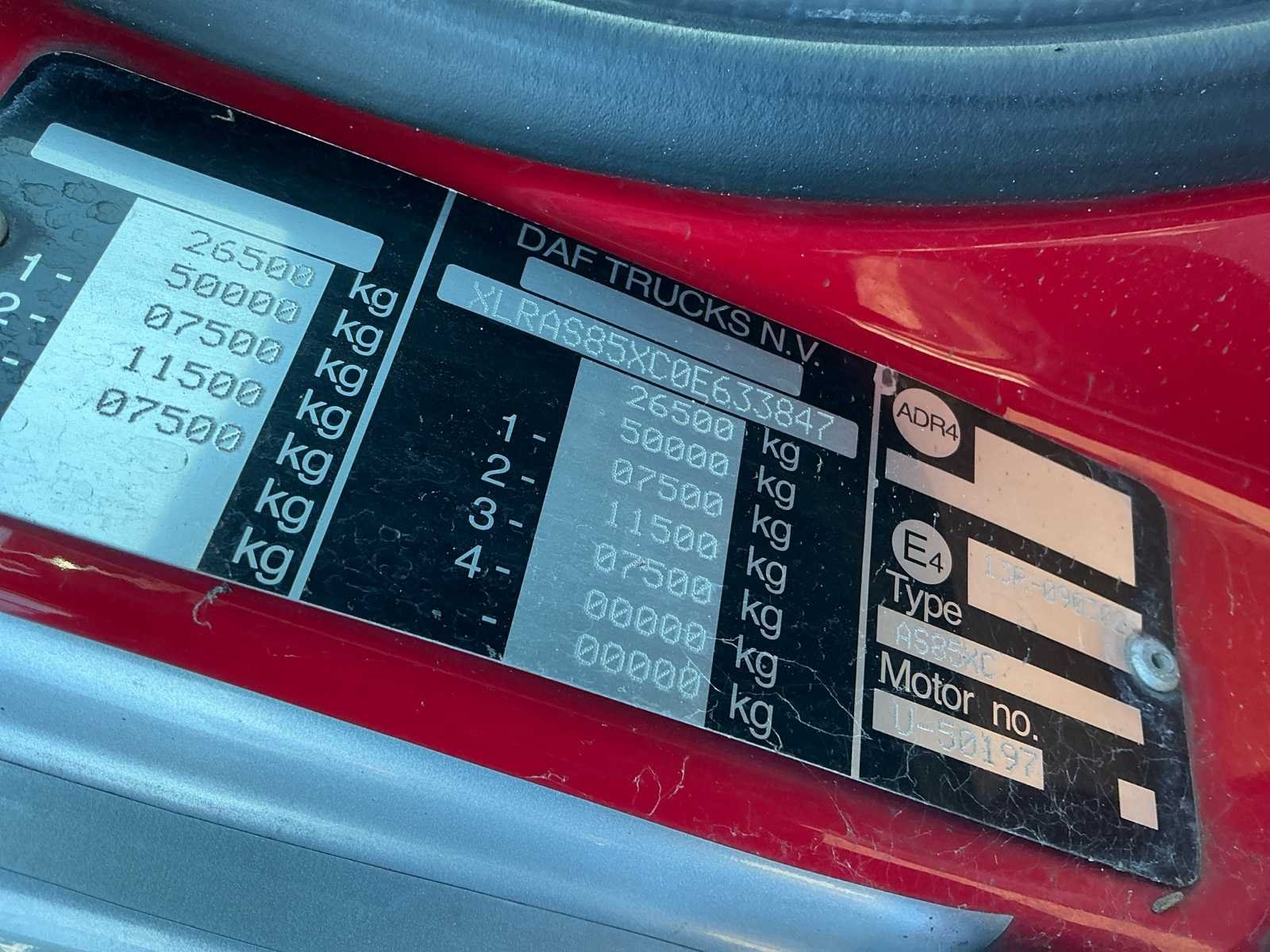 Voorzien van: 3-assige kipper (6x2), 3 delig te kantelen, meesturende achteras, Autolaadkraan Hiab XS (type: 122D-2 HIDUO B) icm nieuwe ringen in cilinder met knijpbak, glijblokken in kraan vervangen, met draadloze afstandsbediening, kipper bak (DRZ-KIPPER 13785) uitzet steunpoten, AC, luchtgeveerde stoel, achteruitrijd en dodenboek camera, volle tank diesel, rondom led, rondom nieuwe verlichting, Nee Kenteken: BPLX25 Merk: DAF Type: CF Kipper Bouwjaar: 2004 Chassisnummer VIN: XLRTE32X0ED553847 Cilinderinhoud: 2600cc Kilometerstand bij opname: 419740km APK vervaldatum: 2026-08-30 Datum eerste toelating: 2004-06-18 Datum eerste toelating (NL): 2004-06-18 Type transmissie: Automatisch Aantal assen: 3 Asconfiguratie: 6x2 Fuel Type: Diesel Laadvermogen: 12370kg Aantal sleutels: 2 Emissieklasse: 4 Laadkraan: true Hydraulische laadklep: true Totale afmeting L: 9400mm Totale afmeting Breedte: 2500mm Totale afmeting Hoogte: 3200mm Afgelezen kilometerstand: 419740km Nationaliteit documenten: Nederlands Kentekenpapieren compleet?: true Aantal zitplaatsen: 3 Zelf rijdend exporteren: Mogelijk Automaat: true Diesel: true