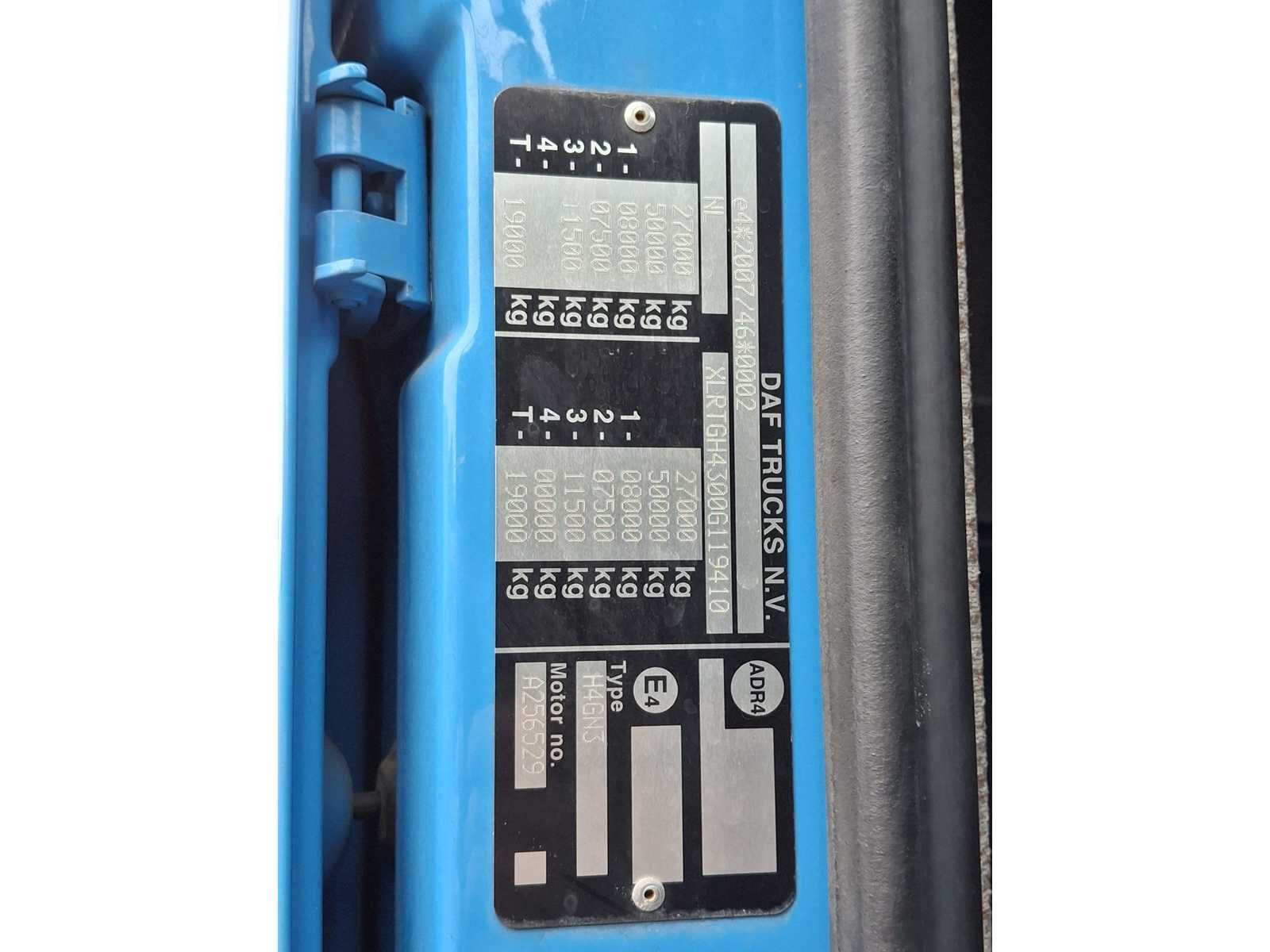 No Kenteken: 95-BHK-5 Merk: DAF Type: H4GN3 / XF 460 FTG Bouwjaar: 2016 Cilinderinhoud: 12902cc Kilometerstand bij opname: 568589km APK vervaldatum: 2026-10-06 Datum eerste toelating: 2016-10-06 Datum eerste toelating (NL): 2016-10-06 Fuel Type: diesel Laadvermogen: 18137kg Emissieklasse: 6 Aantal zitplaatsen: 2