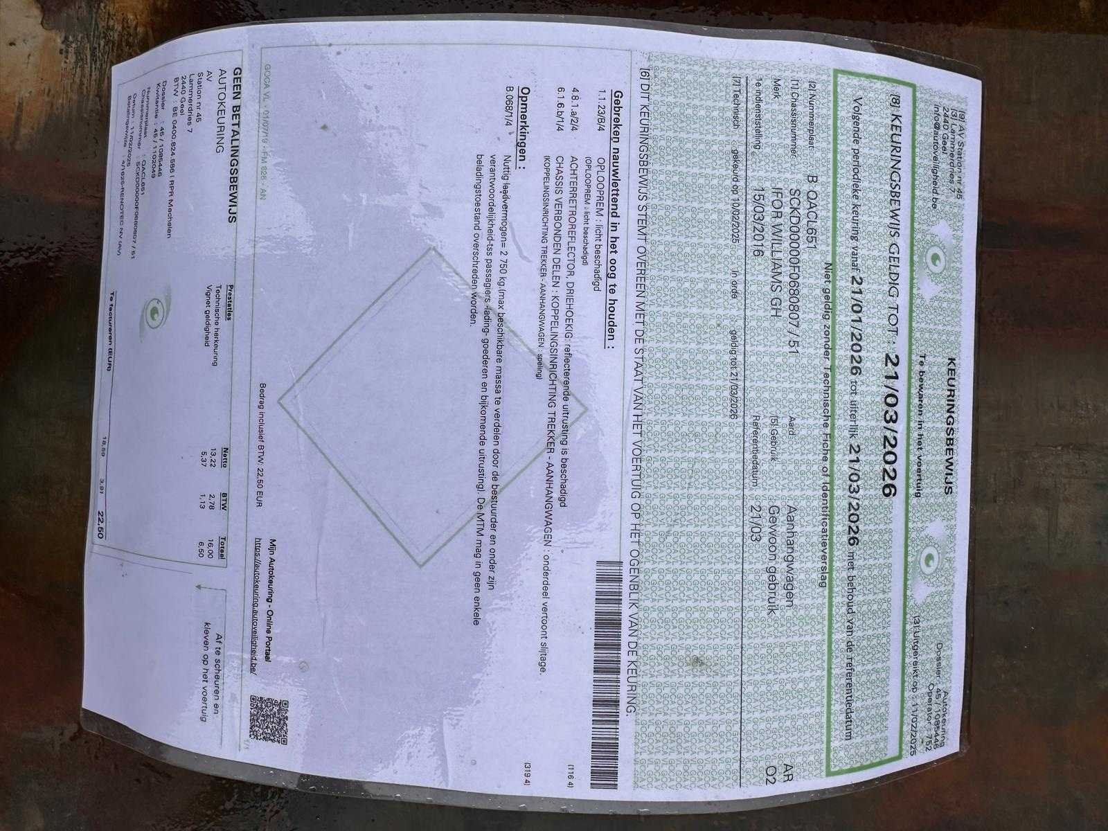 Voorzien van: Belgisch kenteken, keuringsbewijs geldig tot 21/03/2026, verlichting, trekhaakkoppeling, handrem, oprijplaten, reserveband, neuswiel Nee Merk: Ifor Williams GH Type: GH1054BT Bouwjaar: 2016 Chassisnummer: SCKD00000F0680807/51 Aantal assen: 2 Ledig gewicht: 3500kg Laadvermogen: 1800kg Lengte: 300cm Breedte: 160cm