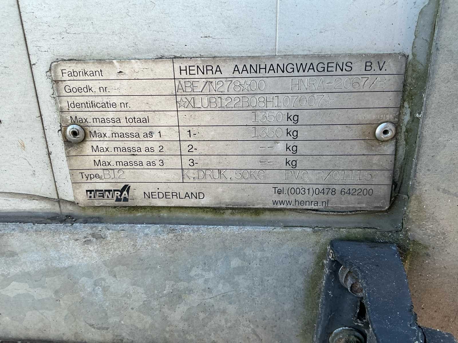 Zonder slot. Nee Merk: Henry Type: HNRA-2067/B Bouwjaar: 2007 Chassisnummer: XLUB122B08H1007 Aantal assen: 1 Laadbak afmeting l: 239cm Laadbak afmeting b: 130cm Ledig gewicht: 300kg Laadvermogen: 1050kg Datum eerste toelating: 2008-11-07 Datum eerste toelating (NL): 2008-11-07 Kenteken: 97-WB-SG Kentekenpapieren compleet?: true Hoogte: 130cm Lengte: 390cm Breedte: 170cm Zelf rijdend exporteren: Mogelijk
