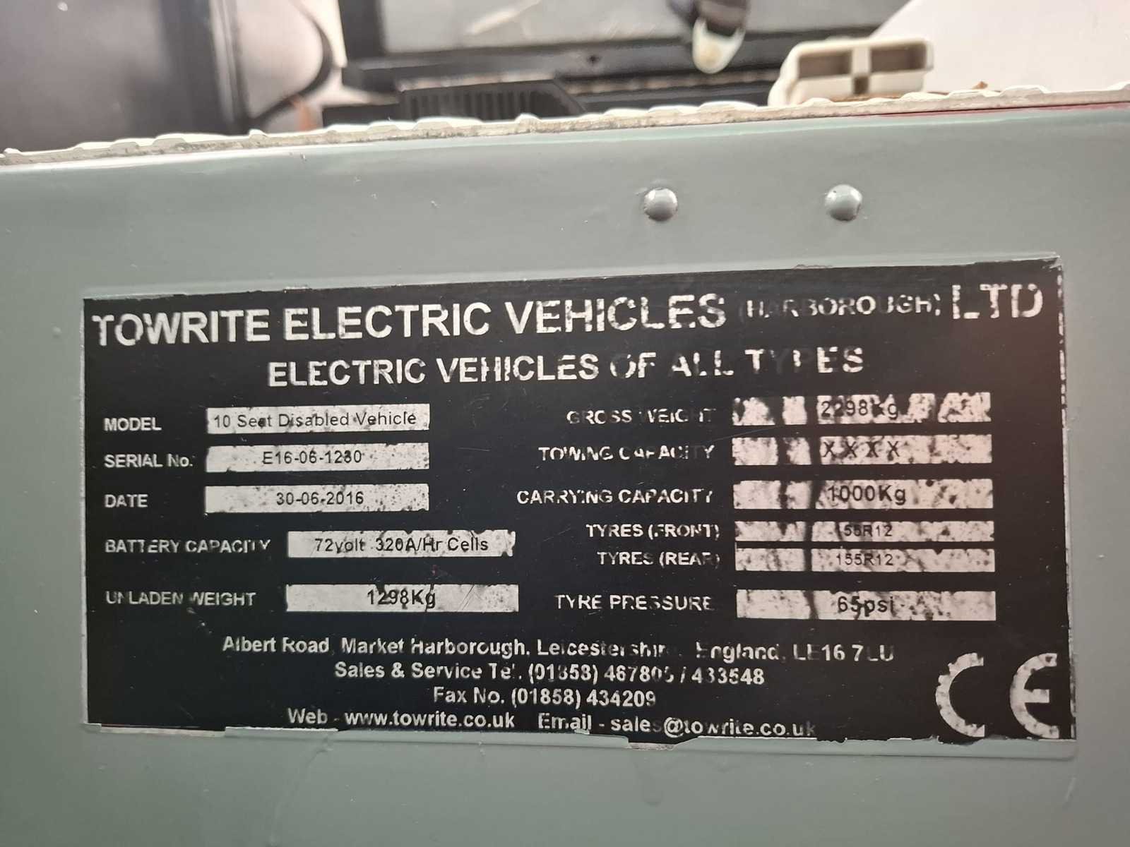 Geen sleutel aanwezig, niet rijdend, lader is niet getest. tellerstand niet afleesbaar. Nee Merk: Towrite Type: 10 Seat disabled vehicle Bouwjaar: 2016 Chassisnummer VIN: E16-06-1280 Automaat: true Brandstof: Elektrisch Emissieklasse: A Aantal personen: 10 Totale afmeting L: 530cm Totale afmeting Breedte: 150cm Totale afmeting Hoogte: 210cm Ledig gewicht: 1298
