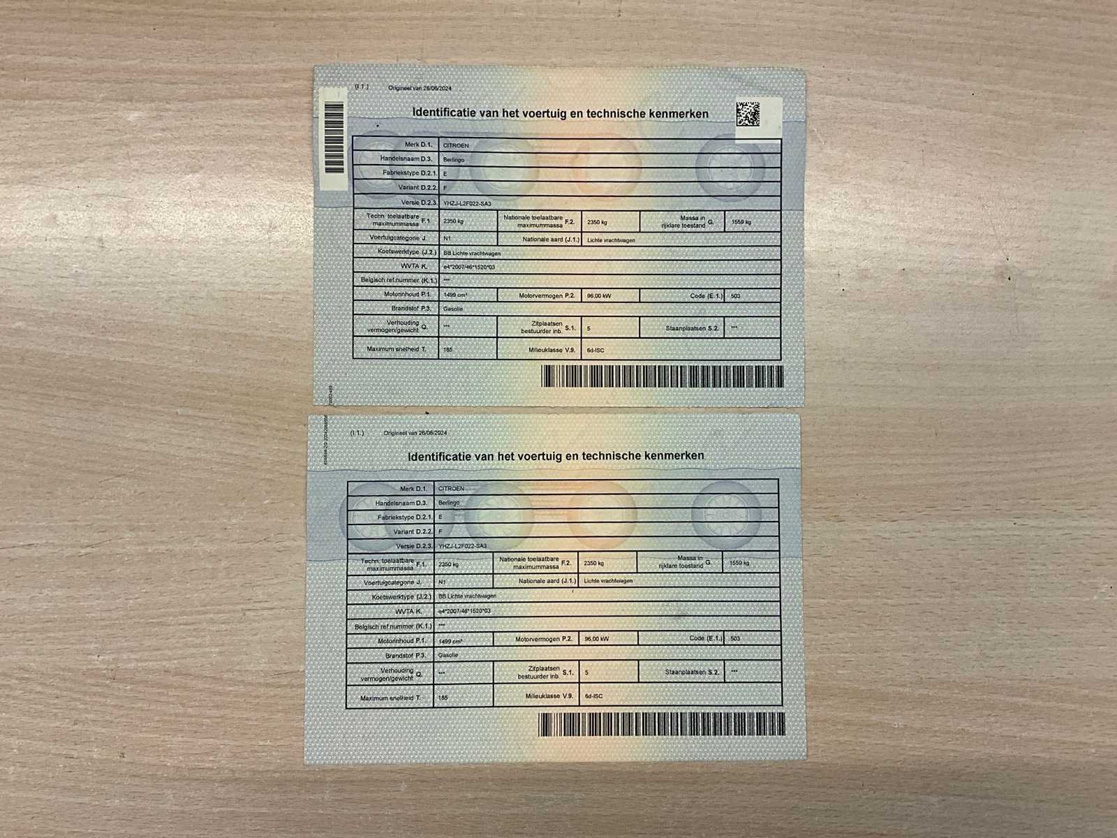 Let op: voertuig heeft schades en gebruiksporen, opnieuw overgespoten lak, Elektrische ramen en spiegels, 6 versnellingen handgeschakeld, airco, multimedia systeem, 5 zitplaatsen, dubbele schuifdeur, trekhaak No Merk: Citroën Type: Berlingo Model: 1.5 Bouwjaar: 2021 Chassisnummer: VR7EFYHZJLJ788243 Cilinderinhoud: 1499cc Vermogen (kW): 96kW Brandstof: diesel Datum eerste toelating: 14-01-2021 Transmissie: Handgeschakeld Aantal zitplaatsen: 5 Nationaliteit documenten: België Aantal sleutels: 1 Ledig gewicht: 1559kg Laadvermogen: 791kg Aantal cilinders: 4 Emissieklasse: 6d-ISC Kentekenpapieren compleet?: true