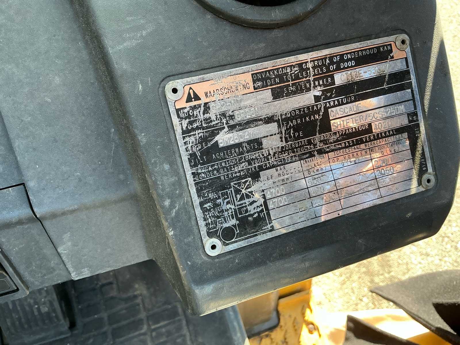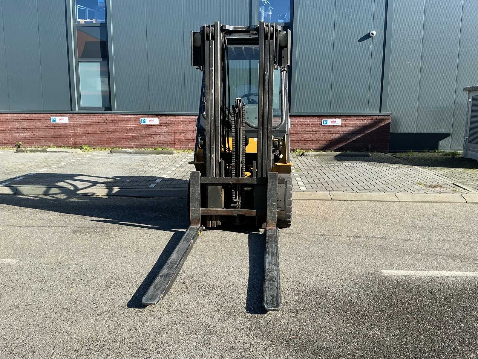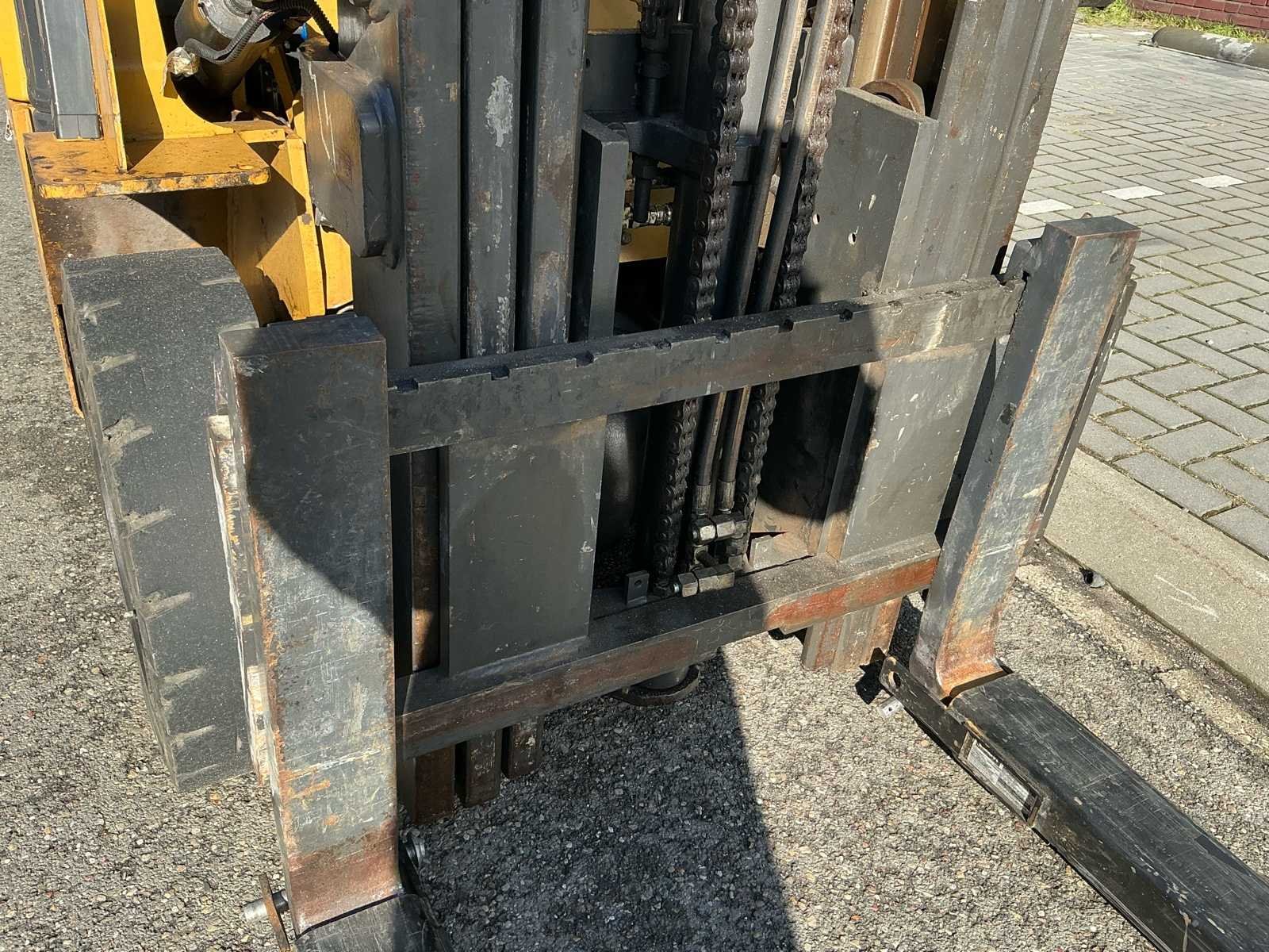 Vermogen: 41kW Nee Merk: CAT Type: GP25NT Bouwjaar: 2014 Brandstof: Gas Aantal wielen: 4 Afgelezen urenstand: 11924 Free-lift: true Side-shift: true Triple mast: true Hefvermogen: 2500kg Max. hefhoogte: 4700mm Vol rubber banden: true LPG: true