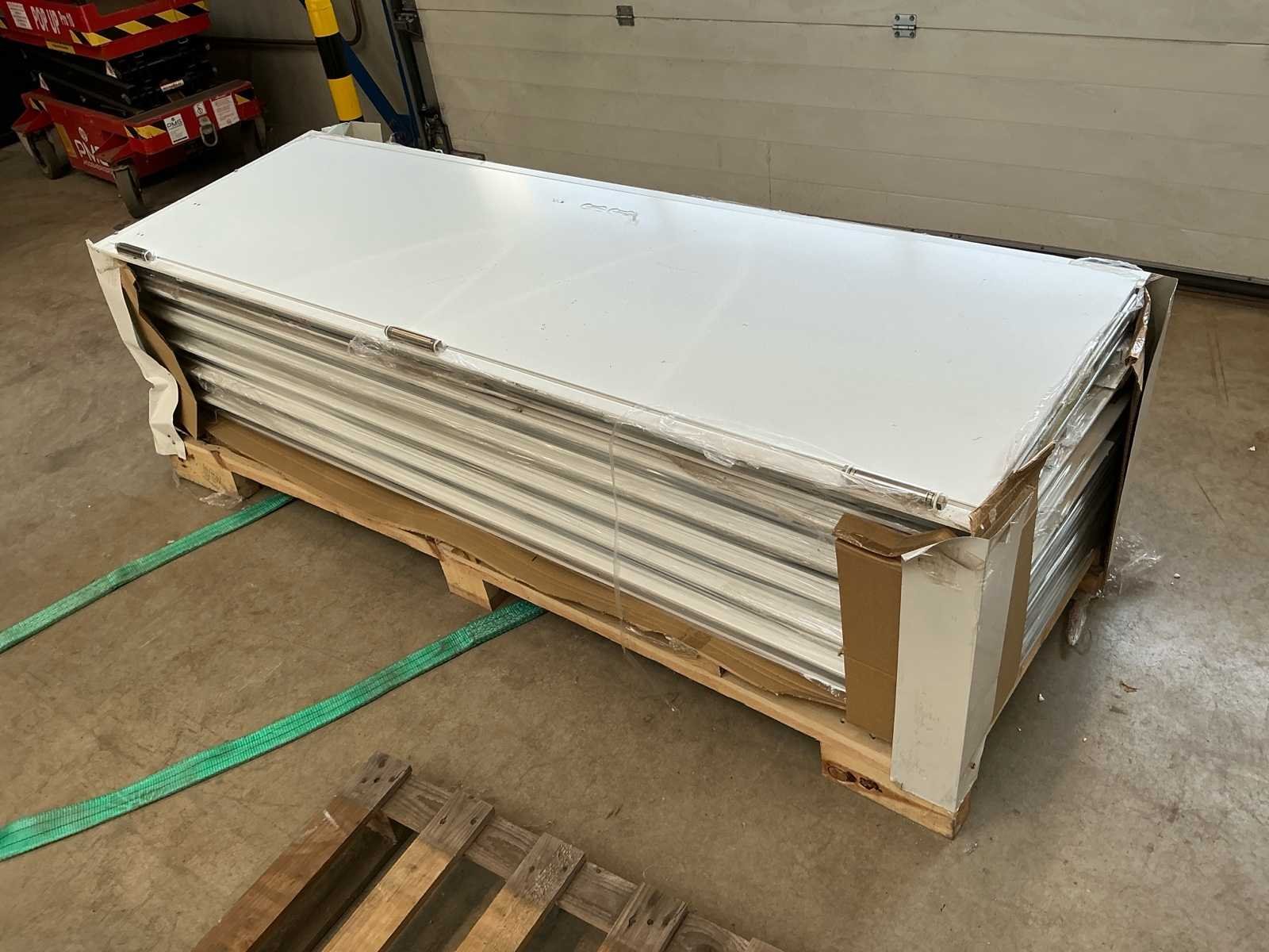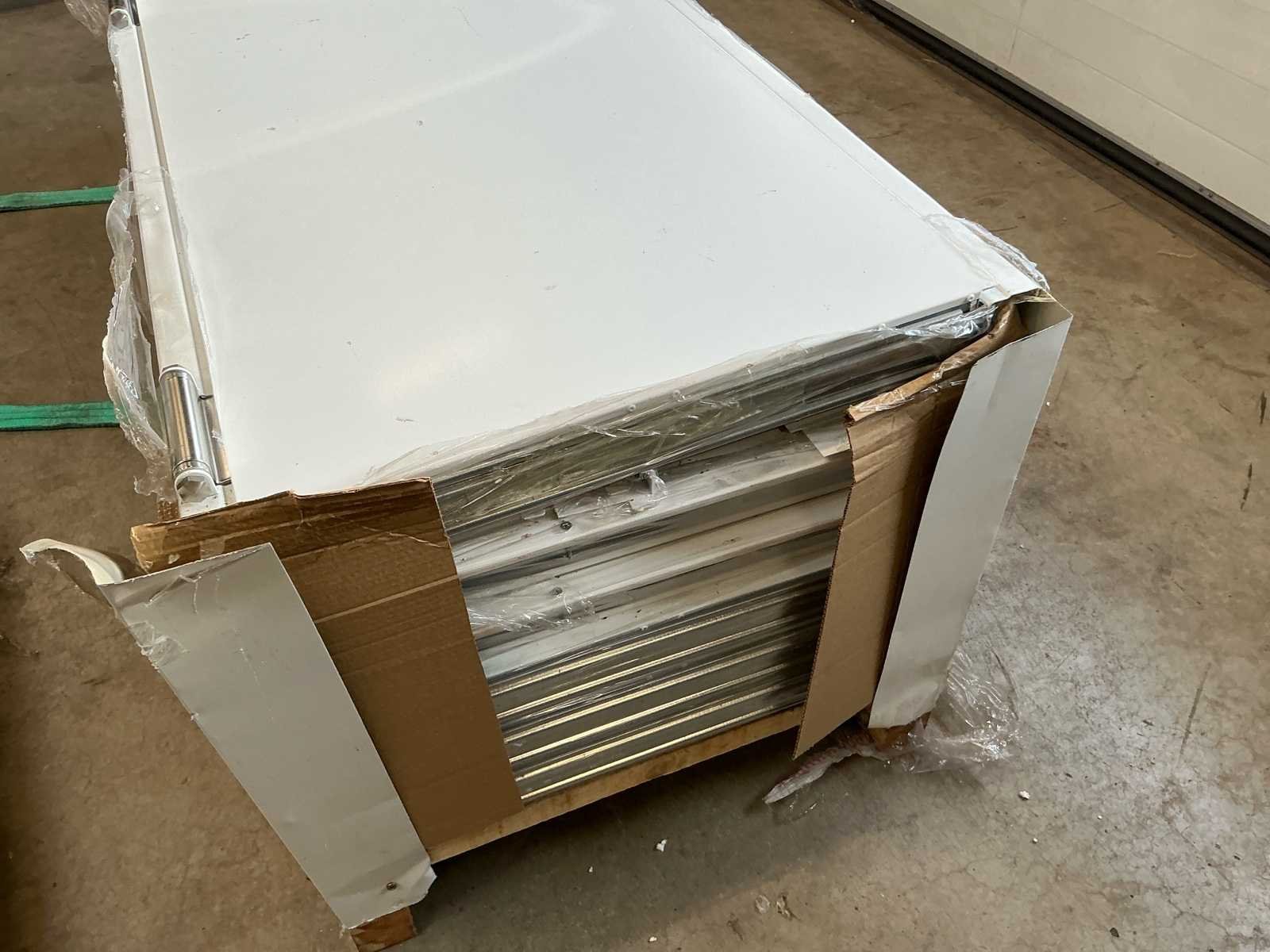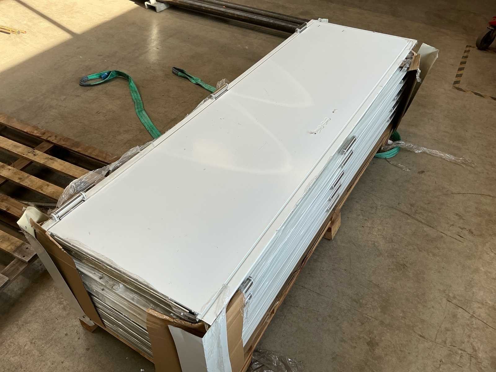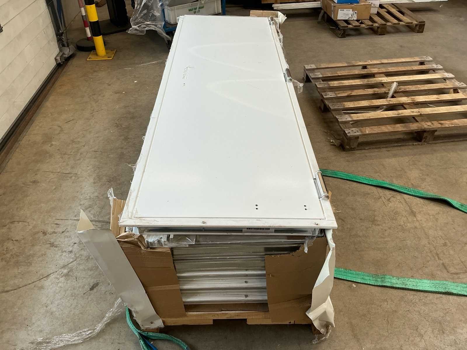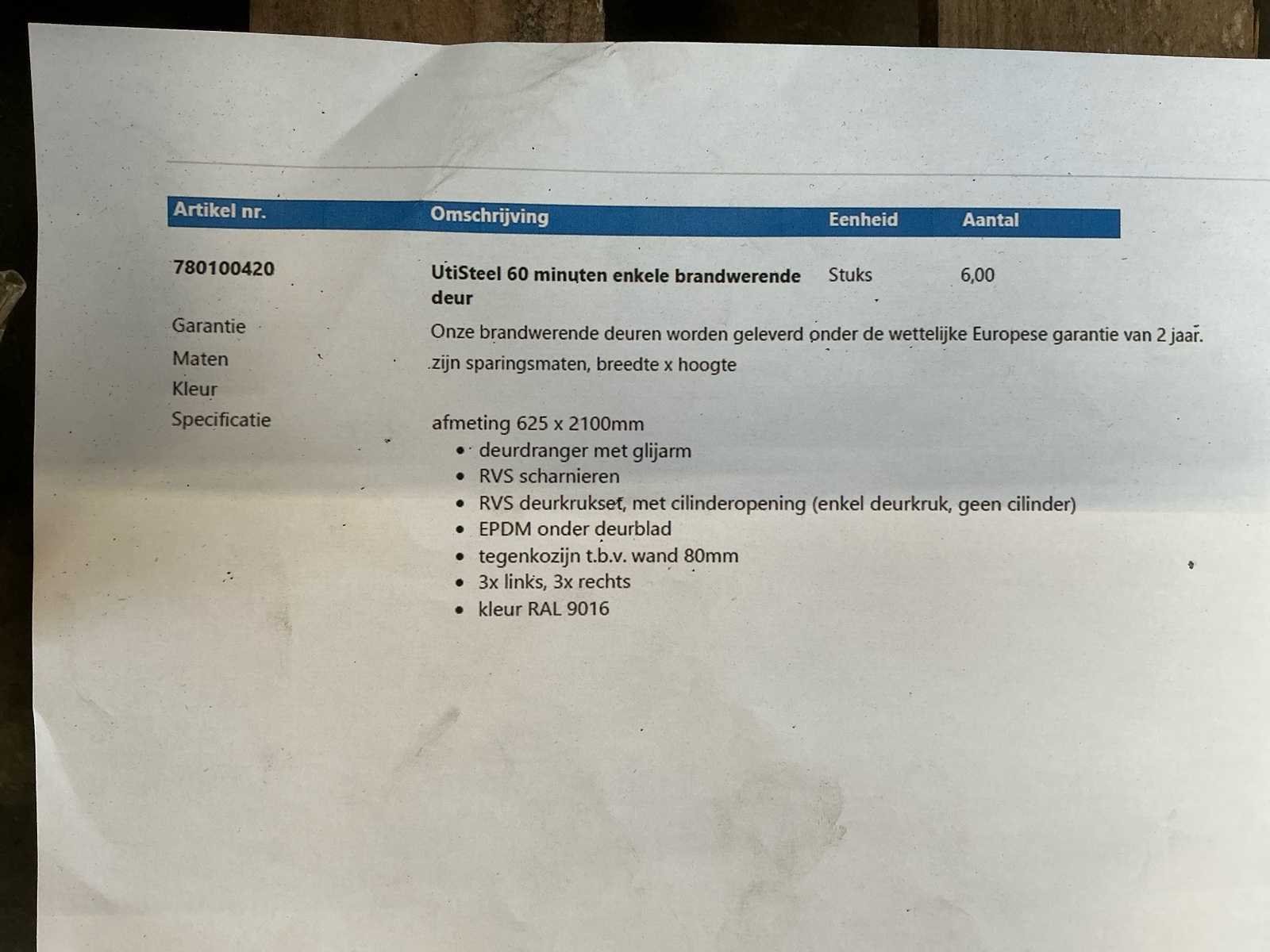 Voorzien van: Alle toebehoren, zoals: drangers, deurbeslag profielen, complete set deuren. Stalen brandwerende deur, uitvoering EI2 60 (60 minuten) met C5 zelfsluitend, rechtsdraaiend, afmeting ca. 625× 2100 mm (b × h), geleverd als deurblad met scharnieren, geschikt voor utiliteits-/industriële toepassingen. Artikel 780100420 betreft 6 stuks UtiSteel enkele brandwerende deuren met een brandwerendheid van 60 minuten, sparingsmaat ca. 625 × 2100 mm, uitgevoerd met deurdranger met glijarm, RVS scharnieren, RVS deurkrukset met cilinderopening (zonder cilinder), EPDM valdorpel onder het deurblad, tegenkozijn voor wanddikte 80 mm, 3 links- en 3 rechtsdraaiend, kleur RAL 9016, geleverd met 2 jaar Europese garantie, nieuw waarde €10000,- No Merk: Unisteel Afmeting h: 2100mm Afmeting b: 625mm Bouwjaar: 2024 Dikte: 80mm Kleur: RAL9016