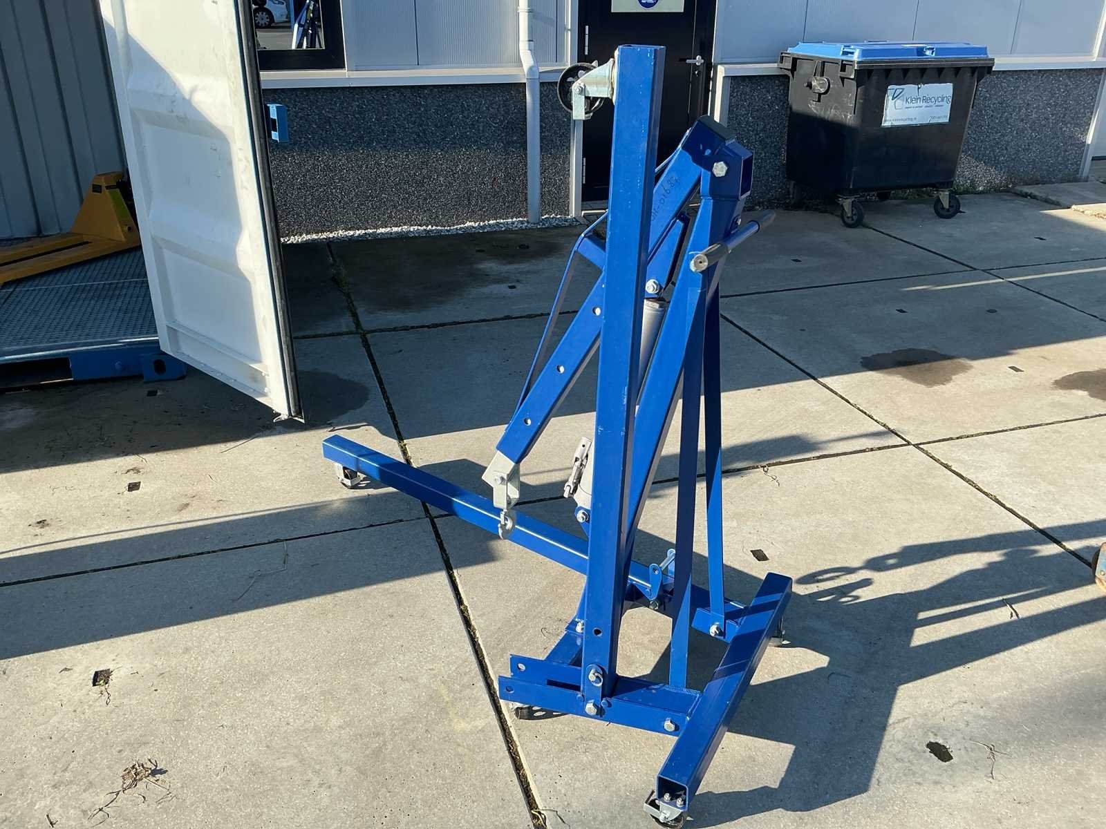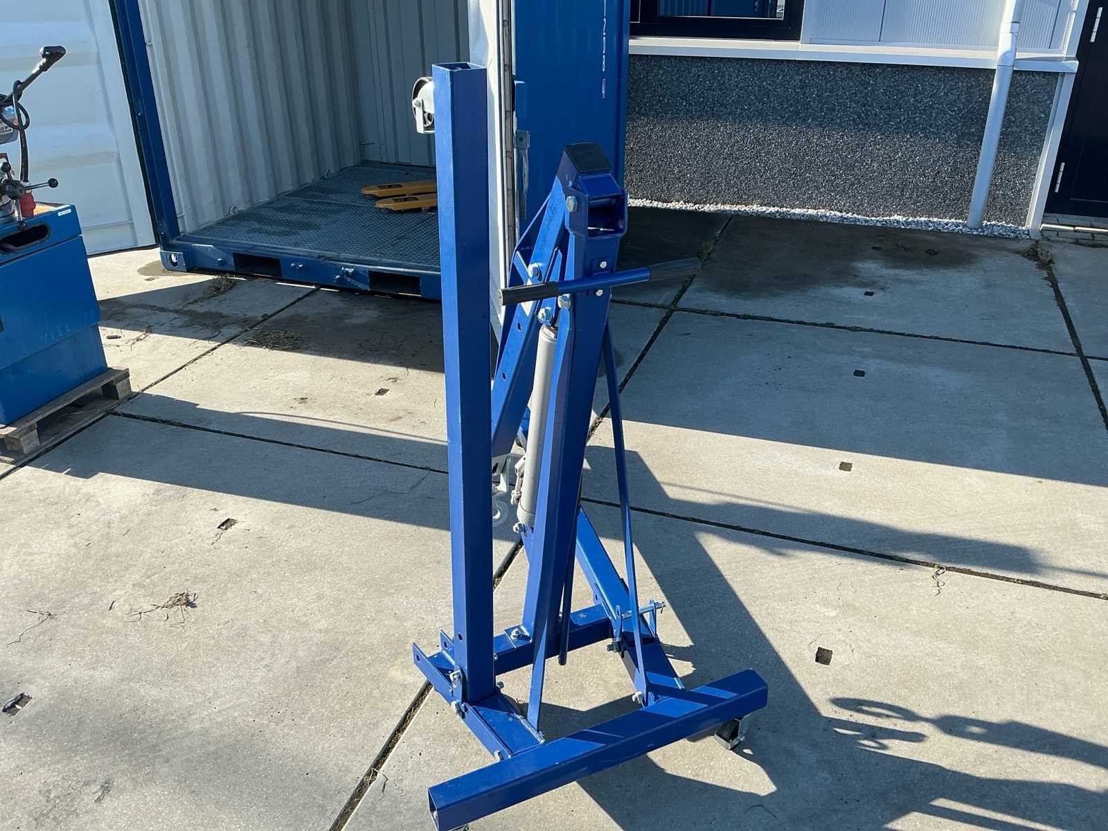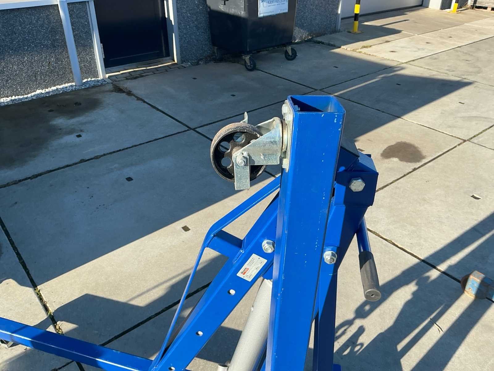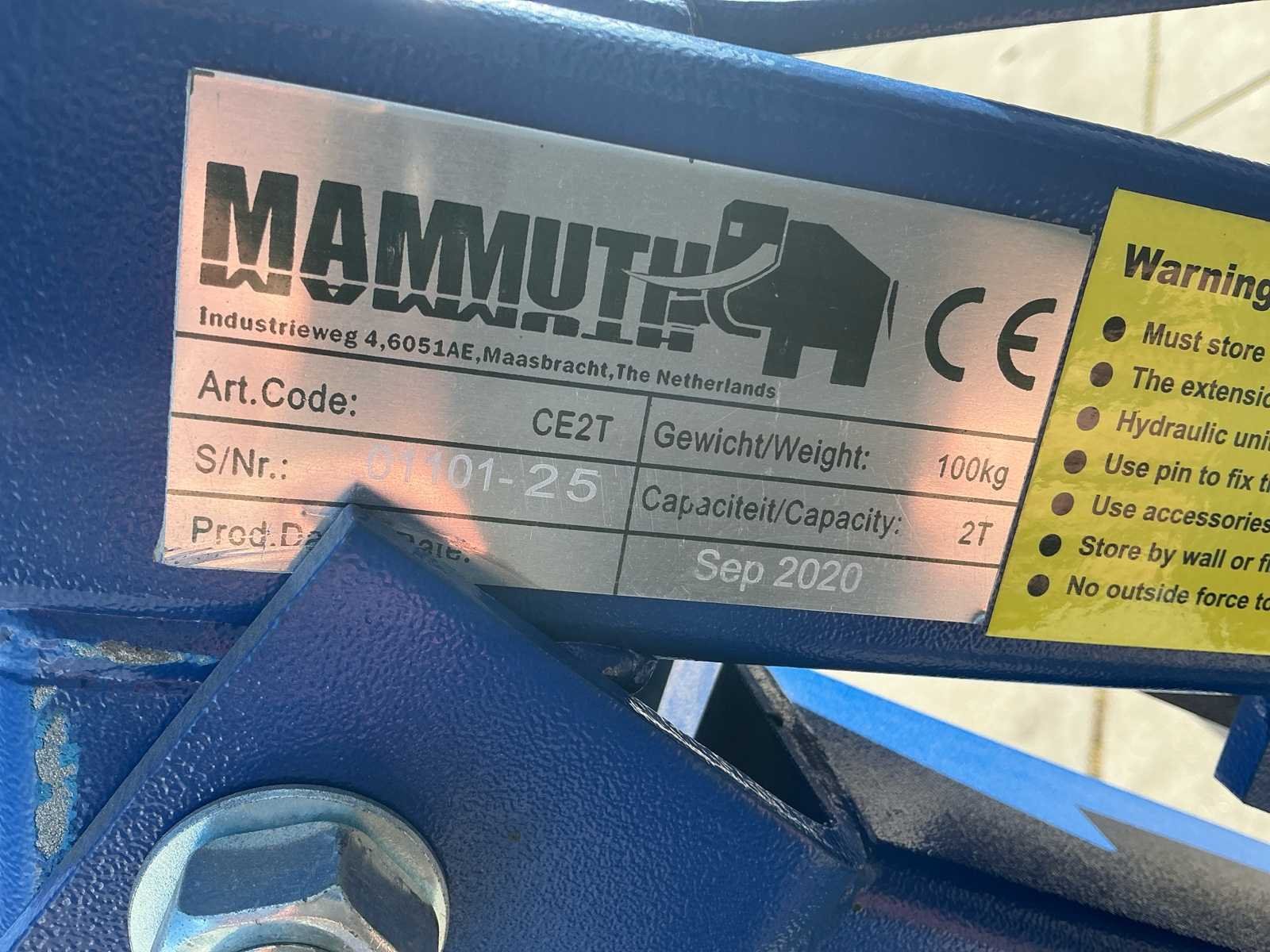 Voorzien van: Hydraulische verrijdbare werkplaatskraan Mammuth CE2T (bouwjaar 09-2020), hefvermogen 2.000 kg, eigen gewicht ca. 100 kg, CE-gemarkeerd, uitgevoerd met inklapbaar frame, handpomp en hijshaak, met afmetingen ca. 165 × 110 × 220 cm (l × b × h) en een ingeklapte hoogte van ca. 155 cm. No Merk: Mammuth Model: CE2T Product type: 01102-25 Kleur: Blauw Gewicht: 100kg Lengte: 165cm Breedte: 110cm Hoogte: 155cm