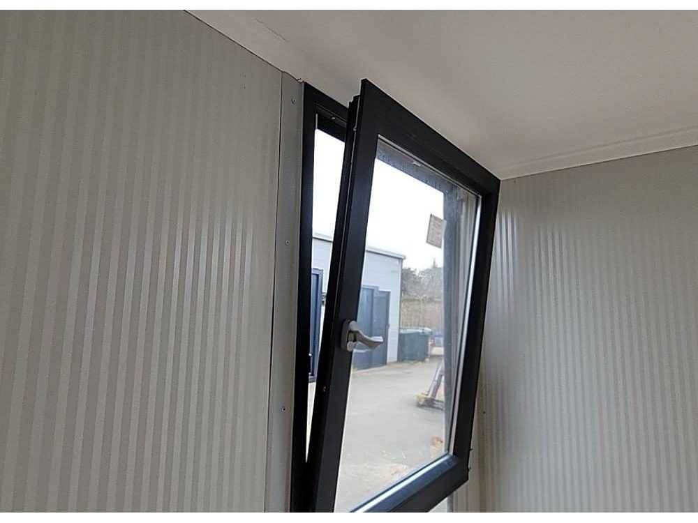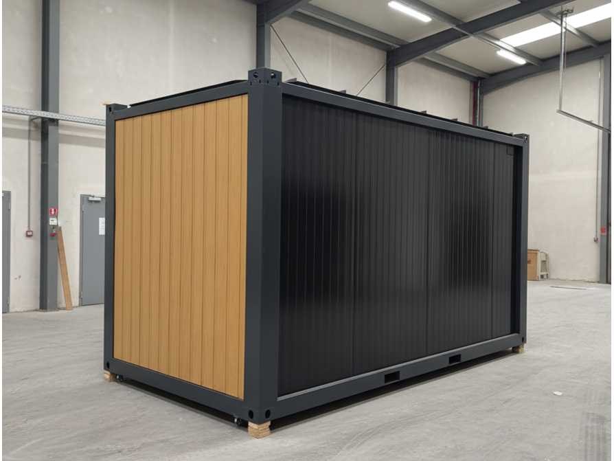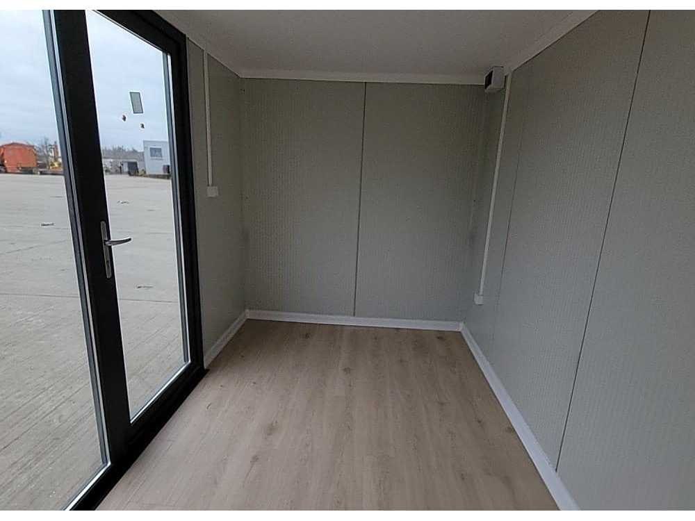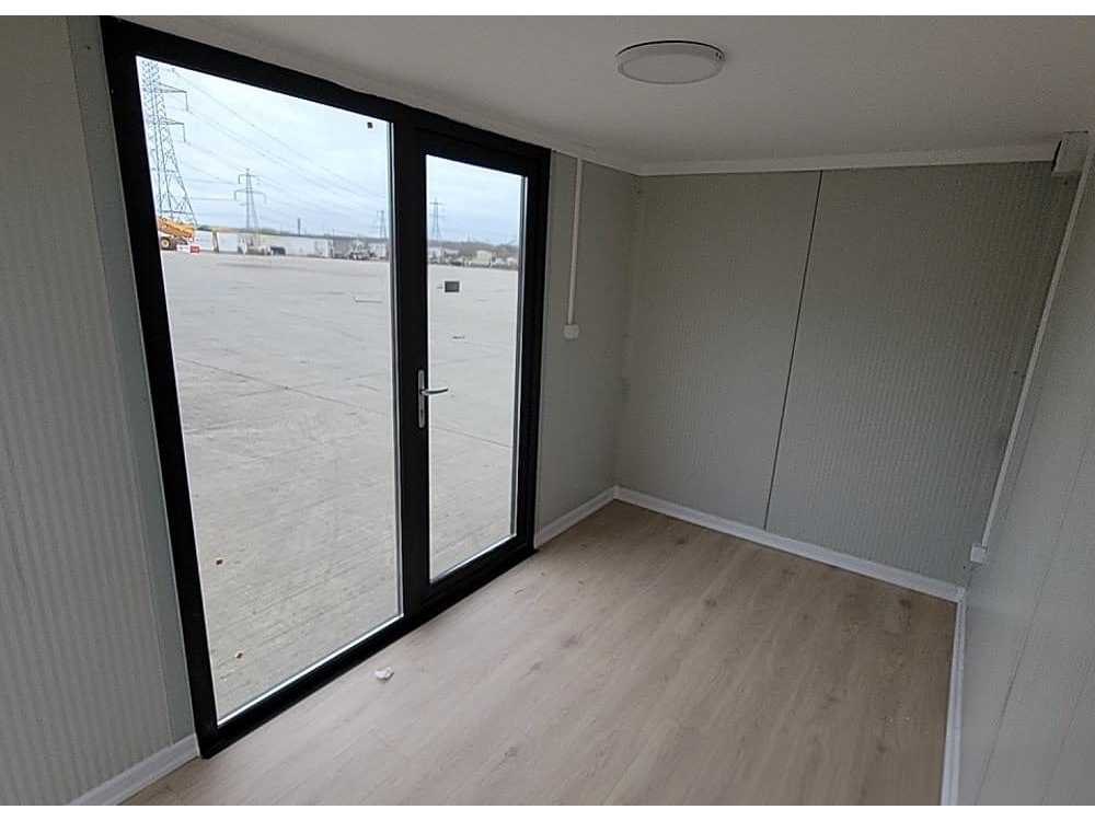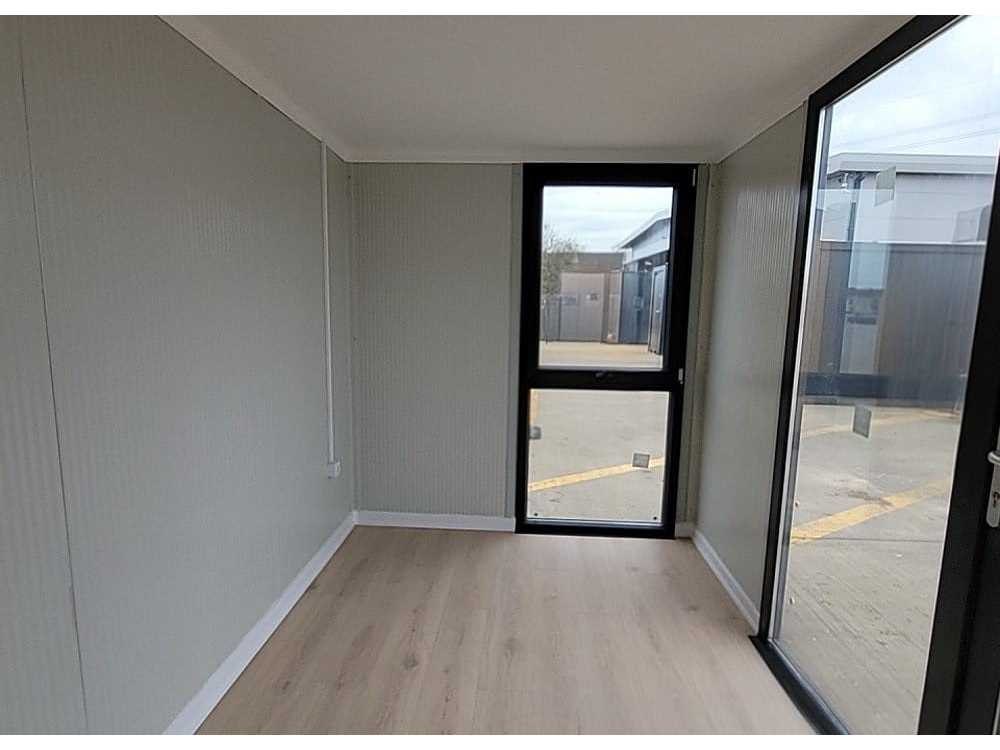 Houtcomposiet gevelbekleding; Interieur, 50mm geïsoleerde wanden, vloer & dak; Vloer, laminaatparket; Wanden, sandwichpaneel; Plafond, gepleisterd & gipsplaat; Ramen, Deceuninck Nee Merk: Adacon Type: W400 Afmeting l: 3900mm Afmeting b: 2200mm Afmeting h: 2400mm