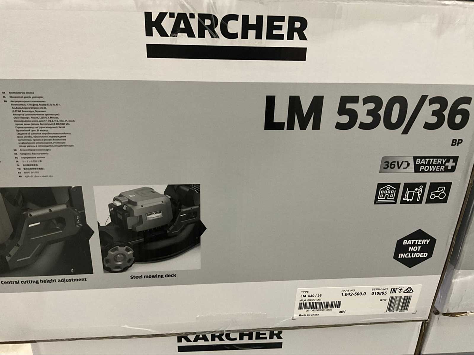 Ongebruikt in de originele verpakking Met accu’s en lader inbegrepen Accuplatform 36 V accuplatform Maaihoogte (mm) 530 Maaihoogte (mm) 30 - 110 Toerental (tpm) 3100 Rijsnelheid (max.) (km/u) 2 - 5 Maaidekmateriaal Staal Volume grasopvangbak (l) 70 Materiaal grasopvangbak Kunststof Geluidsvermogen (dB(A)) 95 Trillingswaarde (m/s²) 0,8 Accutype Lithium-ion verwisselbare accu Spanning (V) 36 Capaciteit (Ah) 6 Prestaties per acculading (m²) max. 600 (6,0 Ah) / max. 750 (7,5 Ah) Gebruiksduur per acculading (min) max. 40 (6,0 Ah) / max. 55 (7,5 Ah) Voeding voor acculader (V/Hz) 100 - 240 / 50 - 60 Kabellengte van acculader (m) 1,2 Gewicht zonder accessoires (kg) 34,6 Gewicht incl. verpakking (kg) 41 Afmetingen (L × B × H) (mm) 1580 x 550 x 1130 Nee Merk: Karcher Type: LM 530/36 Bp Bouwjaar: 2026 Loopmaaier: true Elektrisch aangedreven: true Eigen gewicht: 35kg Totale afmeting L: 1580cm Totale afmeting Breedte: 550cm Totale afmeting Hoogte: 550cm