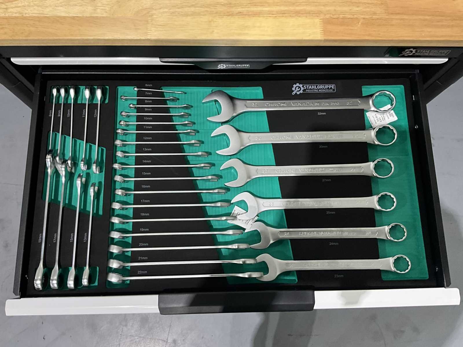 Staat: ongebruikt, in de originele verpakking Merk: Stahlgruppe Aantal laden: 7 laden Aantal gevulde laden: 6 gevulde laden Gereedschap: Chrome Vanadium gereedschap Inhoud: 3 dopsleutelsets (1/2”, 3/8” & 1/4”) ring- steeksleutelset (6-32 mm) ringratel-steeksleutelset (8-19 mm) diverse tangen (12 stuks) schuifmaat (0-150 mm * 0,02 mm) schroevendraaiers (21 stuks) T-greep Torxsleutels (T10-T45) T-greep dopsleutels (8-14 mm) T-greep Inbussleutels (2-8mm) krachtdoppen (10-32 mm) momentsleutel (0-300 Nm) Nee Merk: Stahlgruppe Type: S36 Bouwjaar: 2026 Aantal laden: 7 Met inhoud: true