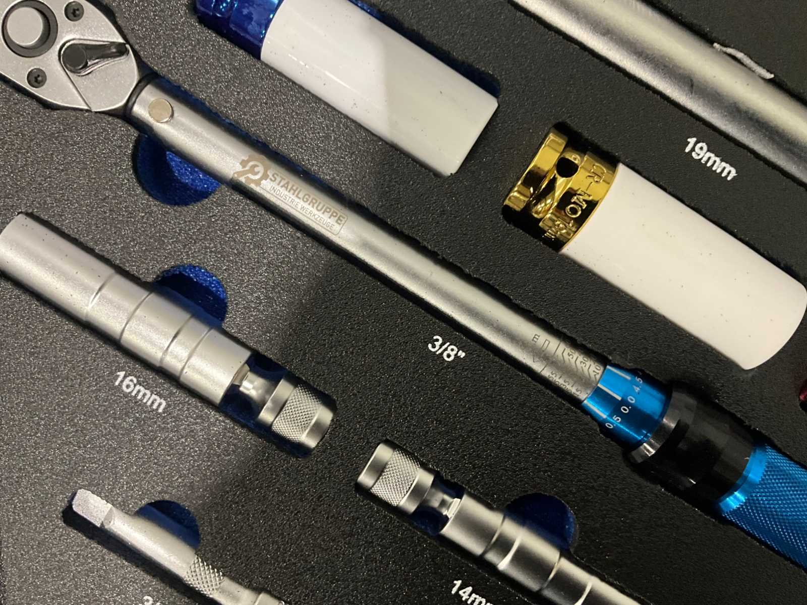 Ongebruikt 1x 1/4" momentsleutel met 72-tands aandrijving (bereik: 5-25 N/M) 1x 3/8" momentsleutel met 72-tands aandrijving (bereik: 10-60 N/M) 1x 1/2" momentsleutel met 72-tands aandrijving (bereik: 40-220 N/M) 3x Impactdoppen (1/2"): 17mm, 19mm, 21mm 3x Dopsleutels (1/2"): 17mm, 19mm, 21mm 3x Verlengstukken: 1/4" x 3", 3/8" x 3", 1/2" x 5" 2x Universele koppelingen (1/4" & 1/2") 16x Bitdoppen (1/4"): PH1, PH2, PH3, T10, T15, T20, T25, T30, H2, H2.5, H3, H4, H5, H6, H8, H10 2x Bougiesleutels (14mm, 16mm) met dunne wand, 3/8" aandrijving voor BMW Nee Merk: Stahlgruppe Type: 32PC Bouwjaar: 2026 Lengte: 45 Breedte: 33 Hoogte: 5