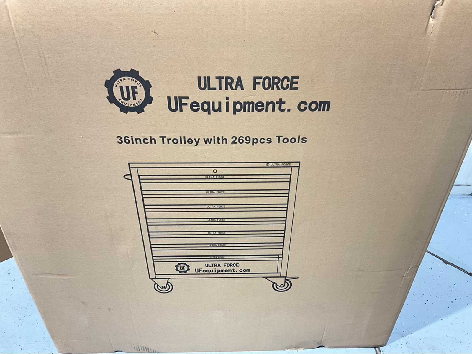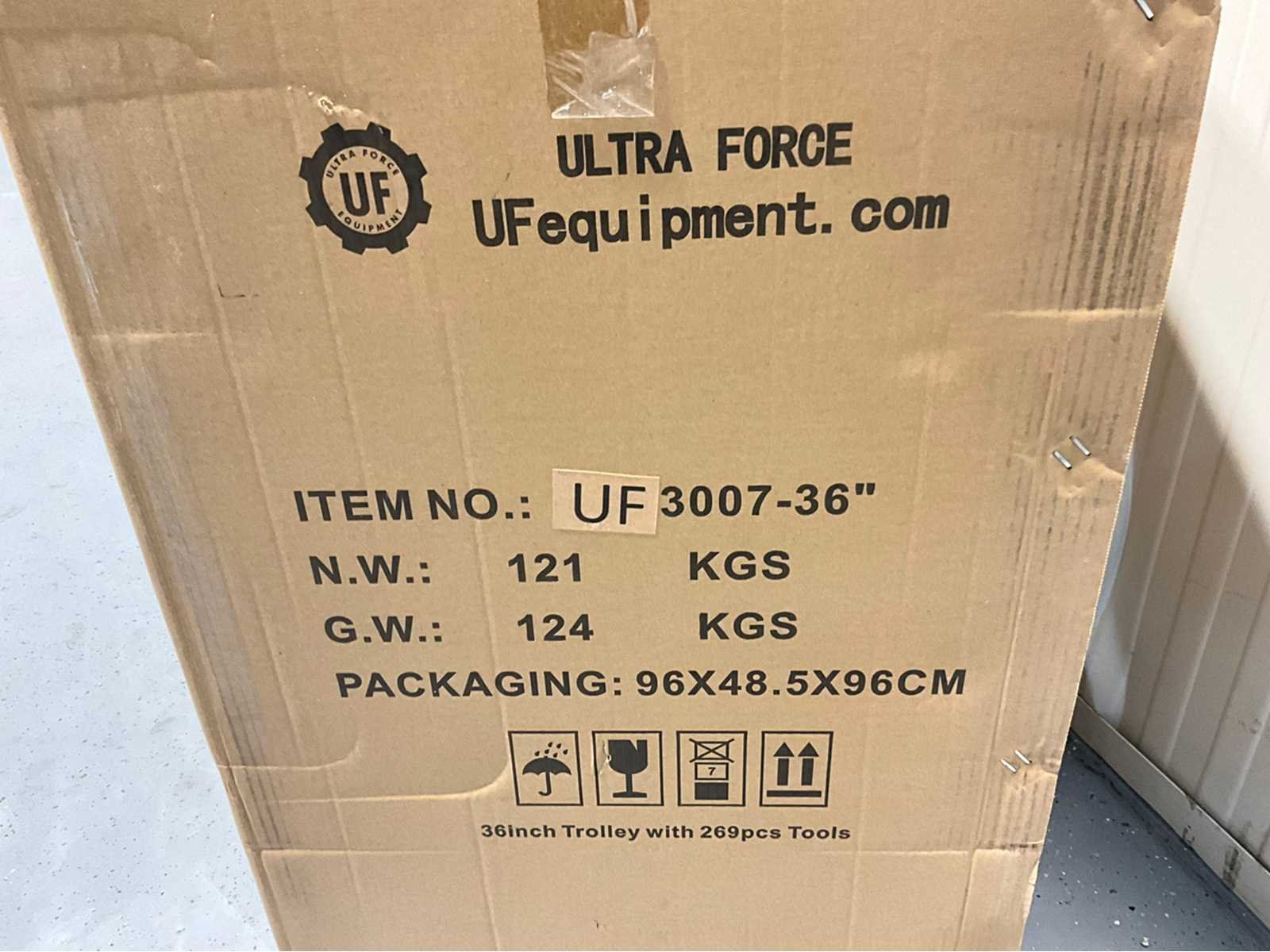 Professionele gereedschapswagen, 7 laden gevuld met 269 pcs gereedschap. Softclose-mechanisme. 2 zwenkwielen en 2 sleutels. Nee Merk: Ultra Force Equipment Gewicht: 124kg Lengte: 96cm Breedte: 49cm Hoogte: 96cm