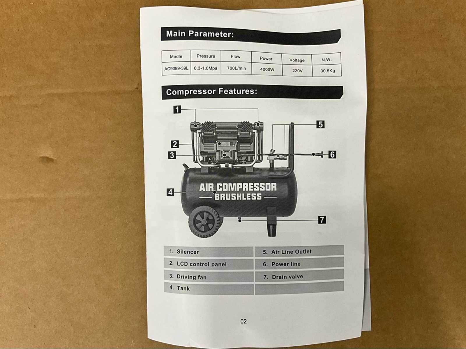 Compressor Brushless - power 4000W - Air tank 39liter Voltage AC220v Air Delivery 700L/min Pressure 0,3-1.0Mpa Nee Merk: Ultra Force Equipment Type: AC9099-39L Bouwjaar: 2026 Buffertank inhoud: 39l Eigen gewicht: 29kg