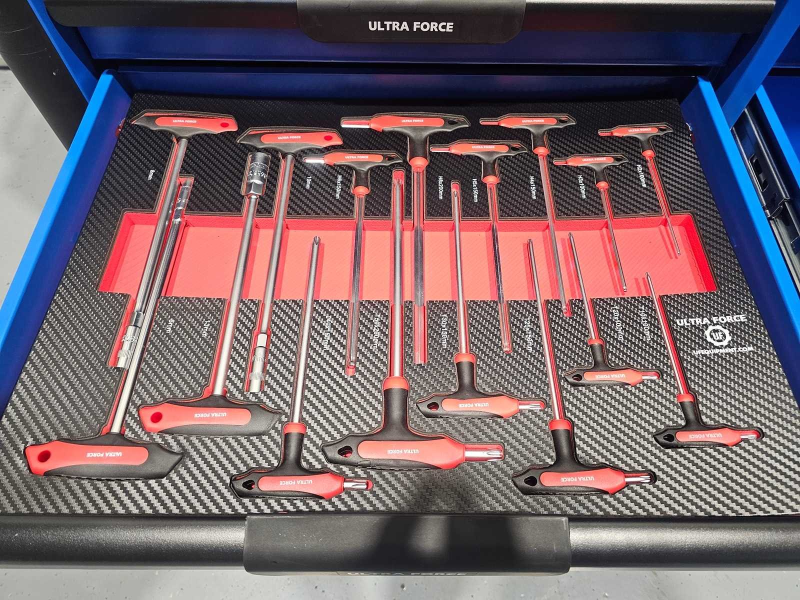 Professionele gereedschapswagen 12 laden, 293 pcs EN een 4 delige accu gereedschap set. Gereedschapswagen 12 laden waarvan 11 gevuld met 293 pcs gereedschap Heavy equipment. 600 kg laadvermogen. Softclose-mechanisme. 2 zwenkwielen en 4 sleutels. En een 4 delige accu gereedschap set: schroefmachine - slagmoersleutel - boormachine en slijper. Inclusief 2 accu's, oplader en diverse accessoires in koffer. Cordless power tools set Nee Merk: Ultra Force Equipment Type: Jumbo Gewicht: 132kg Lengte: 112cm Breedte: 50cm Hoogte: 103cm