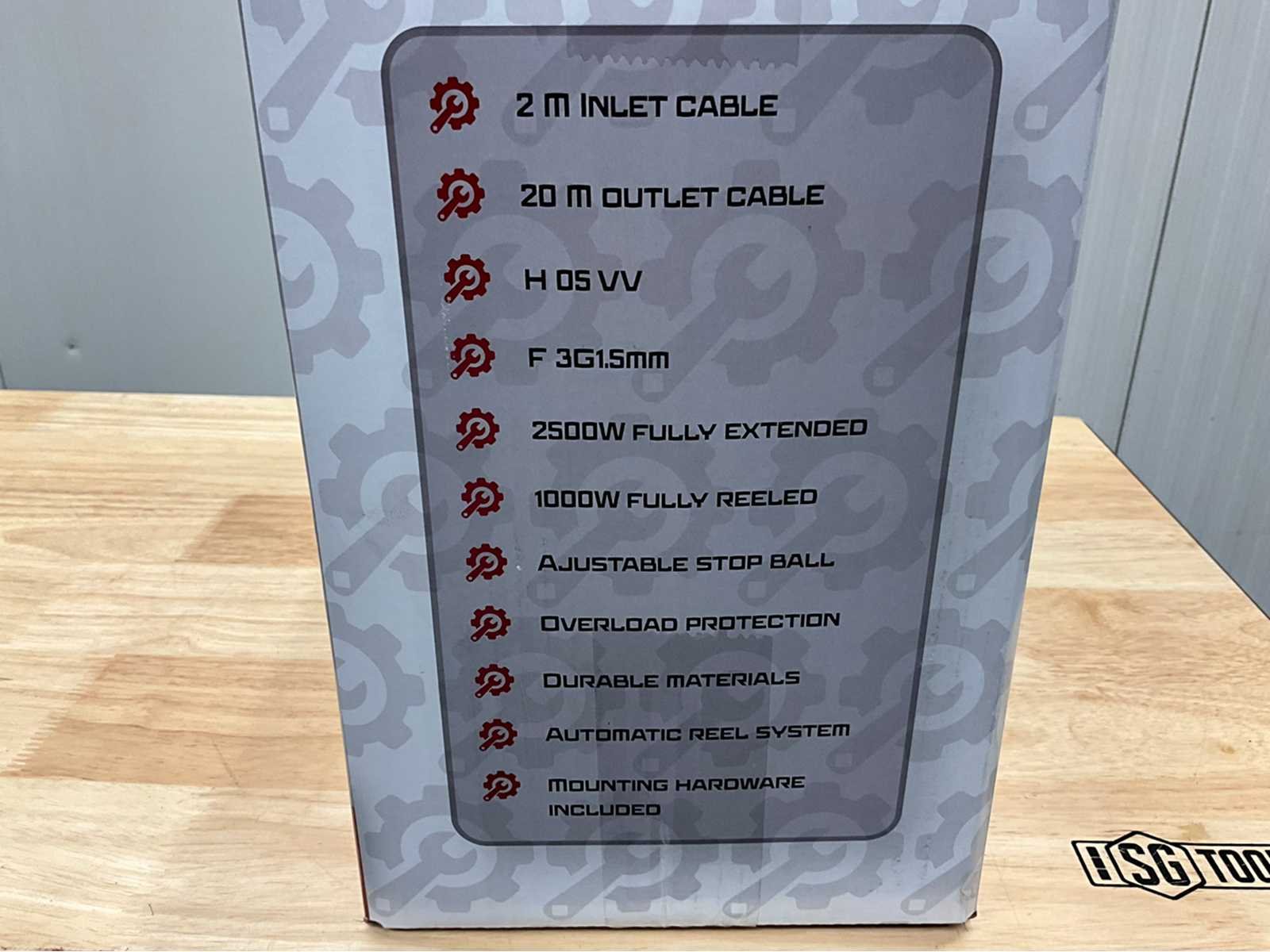 2 M ingaande kabel 20 M uitgaande kabel H 05 VV F 3G1.5mm 2500W volledig uitgerold 1000W volledig opgerold Verstelbare stop bal Overbelasting beveiliging Duurzame materialen Automatisch oprolsysteem Montagemateriaal inbegrepen Nee Merk: Stahlgruppe Type: SGKT20M Bouwjaar: 2026 Aansluiting: 220V