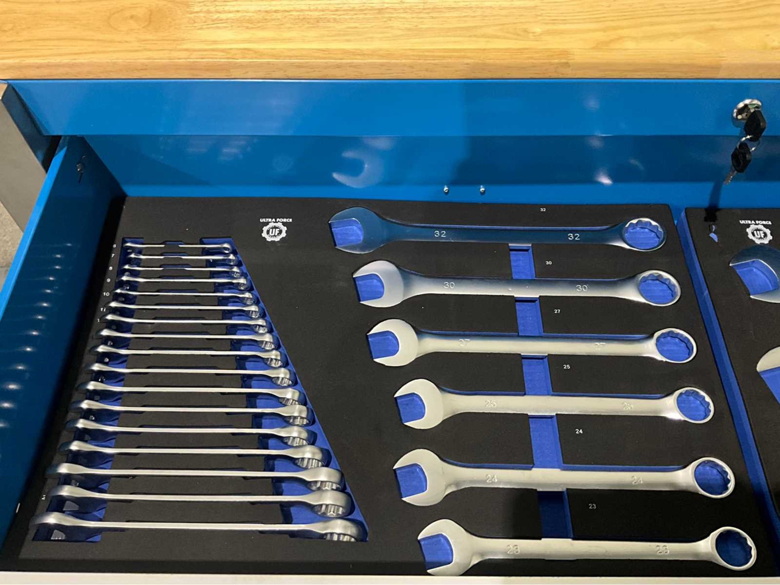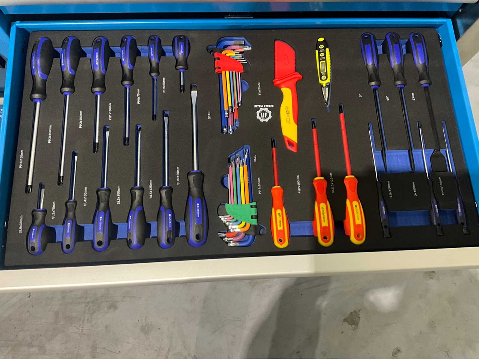 Ongebruikt in de originele verpakking 4 zwenkwielen rattelset en doppenset tot en met maat 50 386 st Heavy Duty gereedschapswagen gebruik: voor professionals aantal laden: 11 laden aantal gevulde laden: 9 gevulde laden gereedschap: chroom-vanadium gereedschap inhoud: 29-delige ring-steeksleutel set (6 mm - 50 mm) 3 ratelsleutel sets met doppen & bitsen (1/4”, 3/8” & 1/2”) 11-delige ring-ringsleutel set (6*7 mm - 30*32 mm) verstelbanre moersleutel 12-delige tangen set 2 hamers & 4 vijlen puntslag en beitel set 12 schroevendraaiers inbussleutels, Torxsleutels, precisiegereedschap 21-delige T-sleutelset 34-delige krachtdoppen set (12 mm - 50 mm) + Torx & inbus doppen & ratelsleutel 3/4,” LED-lamp, zaag, schaar, mes, meetgereedschappen enzovoort... in de originele verpakking No Merk: Ultra Force Type: 387 delige Pro Bouwjaar: 2026 Aantal laden: 11 Met inhoud: true Eigen gewicht: 191kg Totale afmeting L: 1480mm Totale afmeting Breedte: 520mm Totale afmeting Hoogte: 1110mm