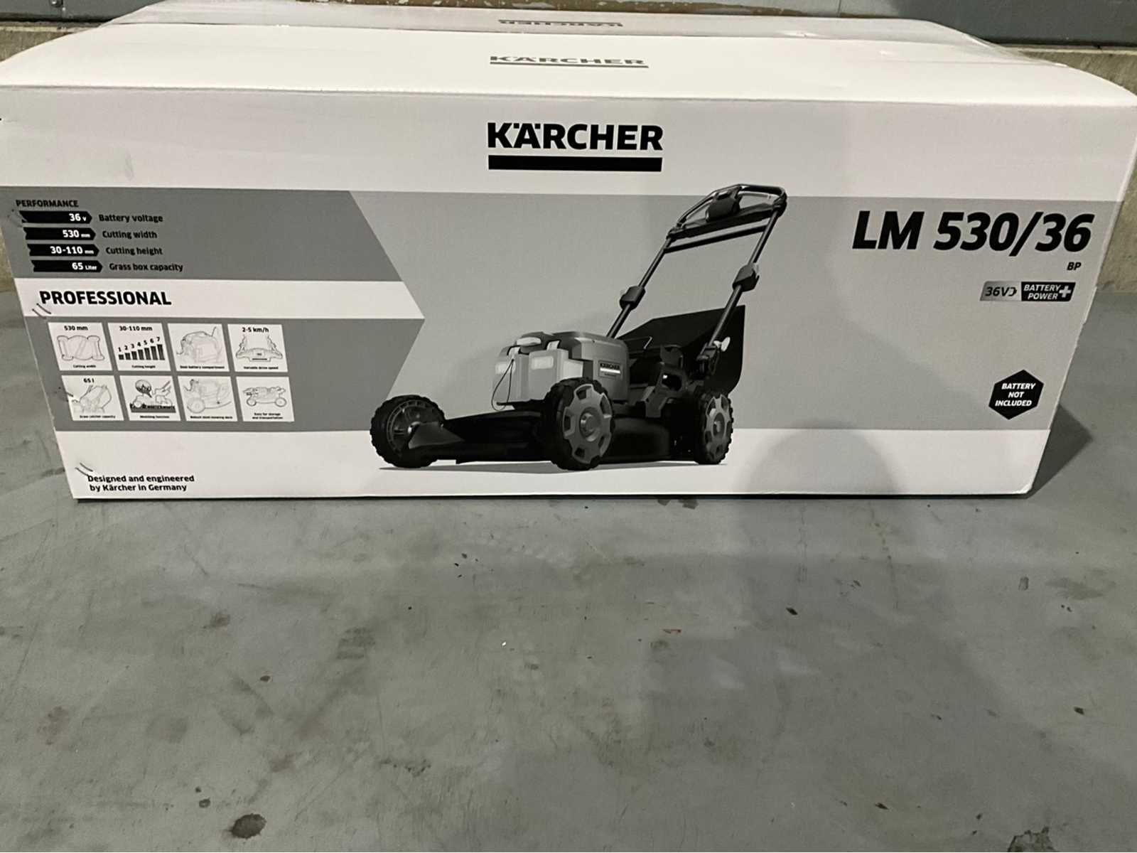 Ongebruikt in de originele verpakking Met accu’s en lader inbegrepen Accuplatform 36 V accuplatform Maaihoogte (mm) 530 Maaihoogte (mm) 30 - 110 Toerental (tpm) 3100 Rijsnelheid (max.) (km/u) 2 - 5 Maaidekmateriaal Staal Volume grasopvangbak (l) 70 Materiaal grasopvangbak Kunststof Geluidsvermogen (dB(A)) 95 Trillingswaarde (m/s²) 0,8 Accutype Lithium-ion verwisselbare accu Spanning (V) 36 Capaciteit (Ah) 6 Prestaties per acculading (m²) max. 600 (6,0 Ah) / max. 750 (7,5 Ah) Gebruiksduur per acculading (min) max. 40 (6,0 Ah) / max. 55 (7,5 Ah) Voeding voor acculader (V/Hz) 100 - 240 / 50 - 60 Kabellengte van acculader (m) 1,2 Gewicht zonder accessoires (kg) 34,6 Gewicht incl. verpakking (kg) 41 Afmetingen (L × B × H) (mm) 1580 x 550 x 1130 Nee Merk: Karcher Type: LM 530/36 Bp Bouwjaar: 2026 Loopmaaier: true Elektrisch aangedreven: true Eigen gewicht: 35kg Totale afmeting L: 1580cm Totale afmeting Breedte: 550cm Totale afmeting Hoogte: 550cm