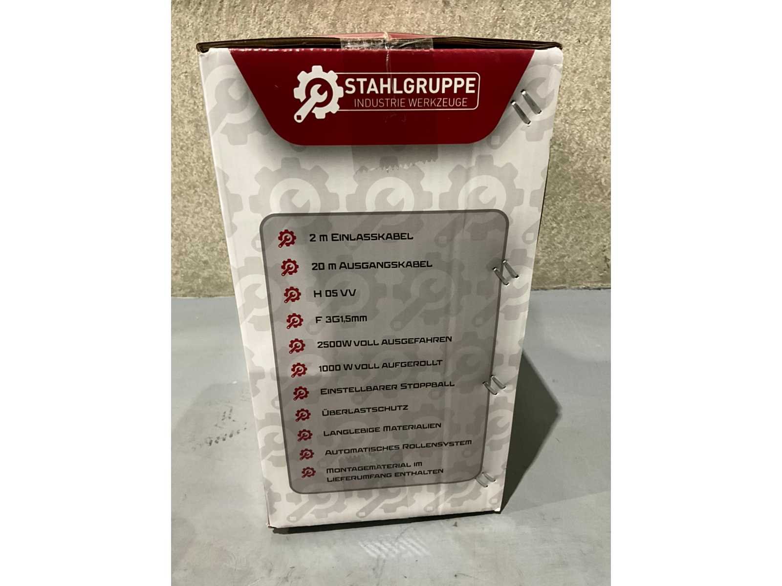 Ongebruikt 2 M ingaande kabel 20 M uitgaande kabel H 05 VV F 3G1.5mm 2500W volledig uitgerold 1000W volledig opgerold Verstelbare stop bal Overbelasting beveiliging Duurzame materialen Automatisch oprolsysteem Montagemateriaal inbegrepen Nee Merk: Stahlgruppe Type: SGKT20M Bouwjaar: 2026 Aansluiting: 220V