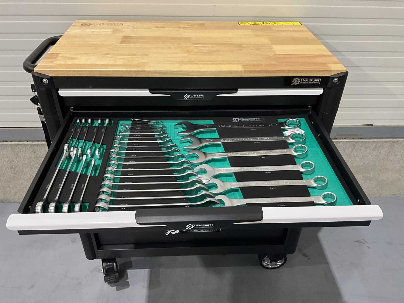 Staat: ongebruikt, in de originele verpakking Merk: Stahlgruppe Aantal laden: 7 laden Aantal gevulde laden: 6 gevulde laden Gereedschap: Chrome Vanadium gereedschap Inhoud: 3 dopsleutelsets (1/2”, 3/8” & 1/4”) ring- steeksleutelset (6-32 mm) ringratel-steeksleutelset (8-19 mm) diverse tangen (12 stuks) schuifmaat (0-150 mm * 0,02 mm) schroevendraaiers (21 stuks) T-greep Torxsleutels (T10-T45) T-greep dopsleutels (8-14 mm) T-greep Inbussleutels (2-8mm) krachtdoppen (10-32 mm) momentsleutel (0-300 Nm) Nee Merk: Stahlgruppe Type: S36 Bouwjaar: 2026 Aantal laden: 7 Met inhoud: true