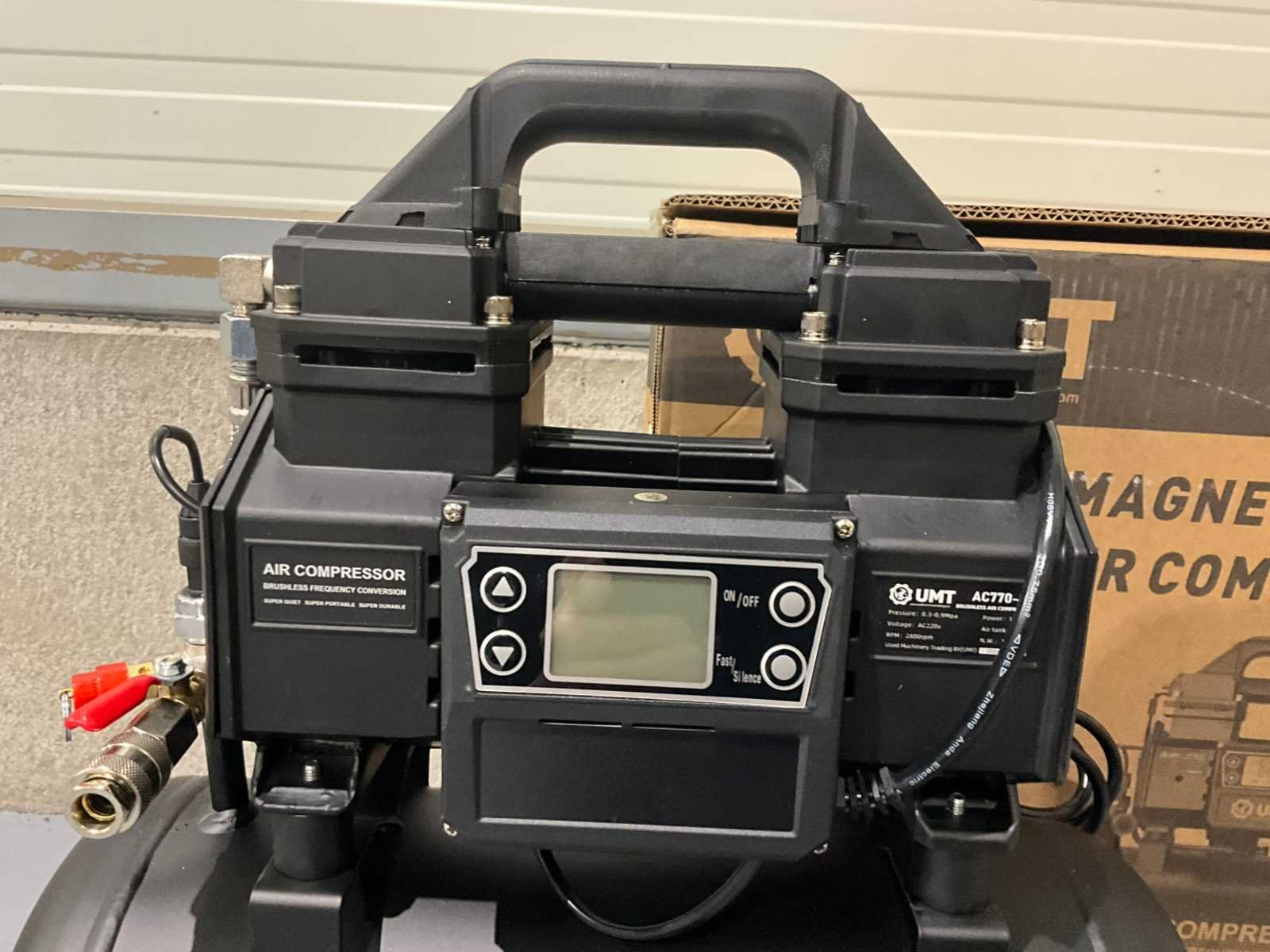 Ongebruikt , Led display , 1000W , 2800RPM , 0.3-0.9MPA Nee Merk: UMT Type: AC770-19 Bouwjaar: 2026 Capaciteit.: 9bar Luchtstroom: 250l/min Vermogen: 1kW Aansluiting: 220V Eigen gewicht: 12kg
