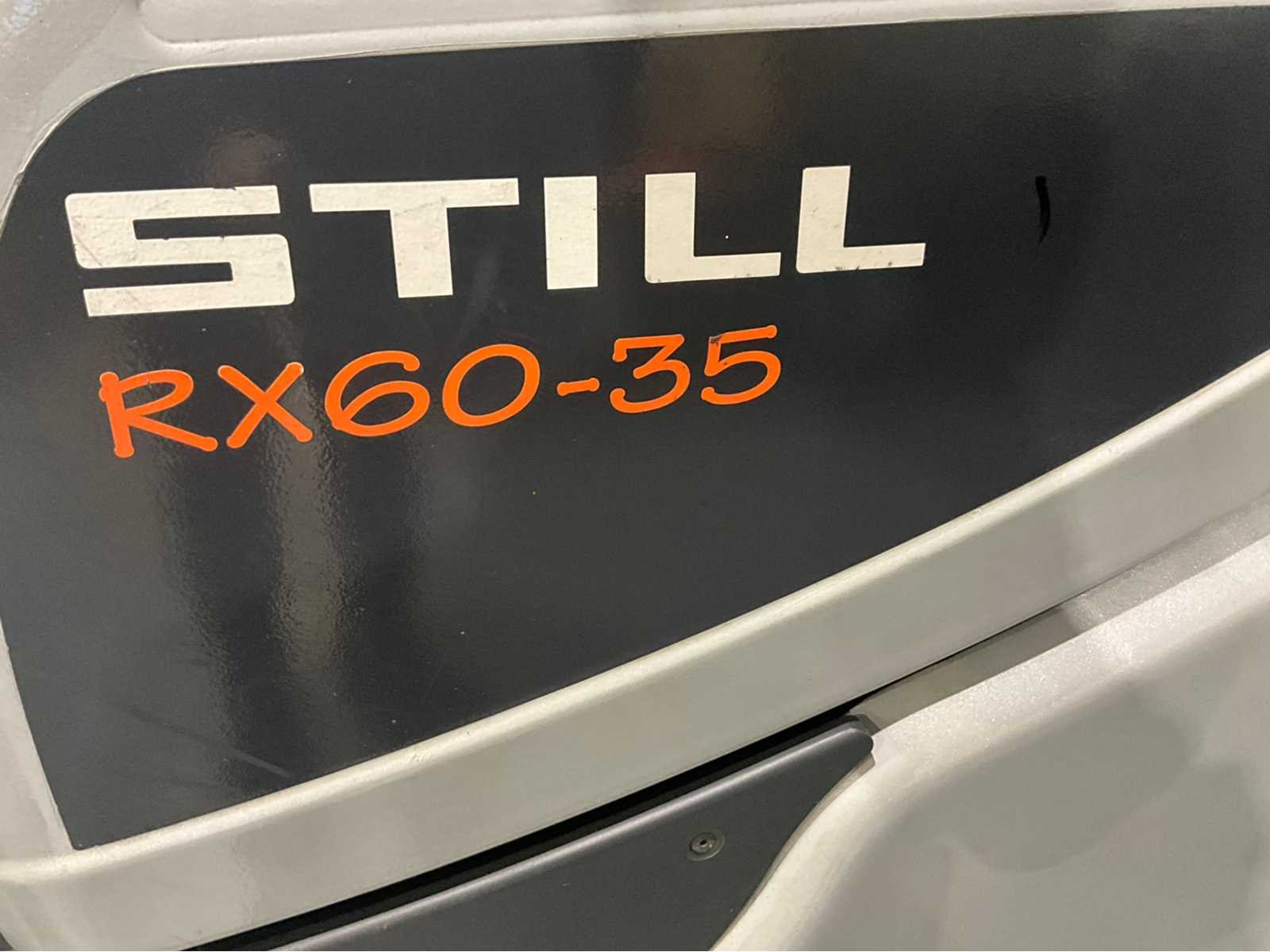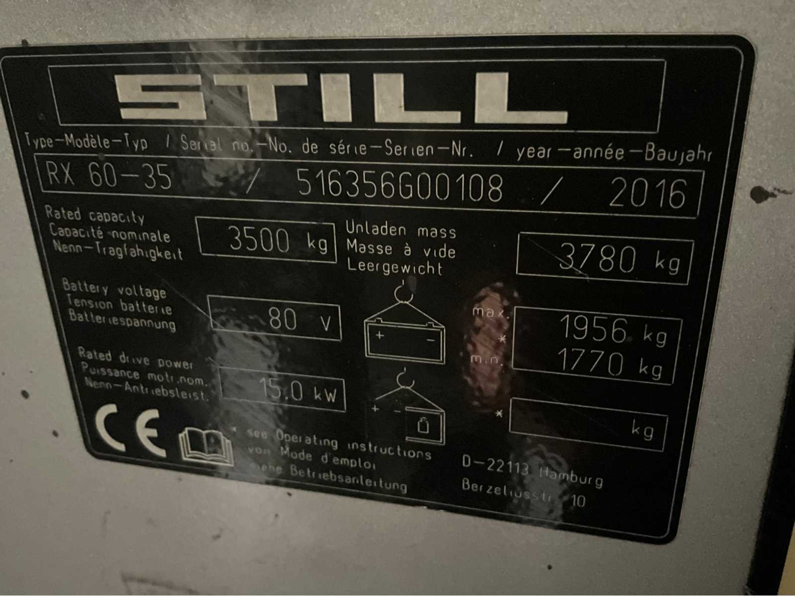 Extra opties : Rondom led verlichting , Blue spot , zwaailamp , brandblusser , Non-marking banden Nee Merk: Still Type: RX60-35 Bouwjaar: 2016 Serienummer: 51635G00108 Mast: Triple Soort band: Volrubber banden Aantal wielen: 4 Free-lift: true Triple mast: true Eigen gewicht: 5736kg Hefvermogen: 3500kg Hefhoogte: 4700mm Vol rubber banden: true Totale afmeting L: 3710mm Totale afmeting Breedte: 1350mm Totale afmeting Hoogte: 2270mm