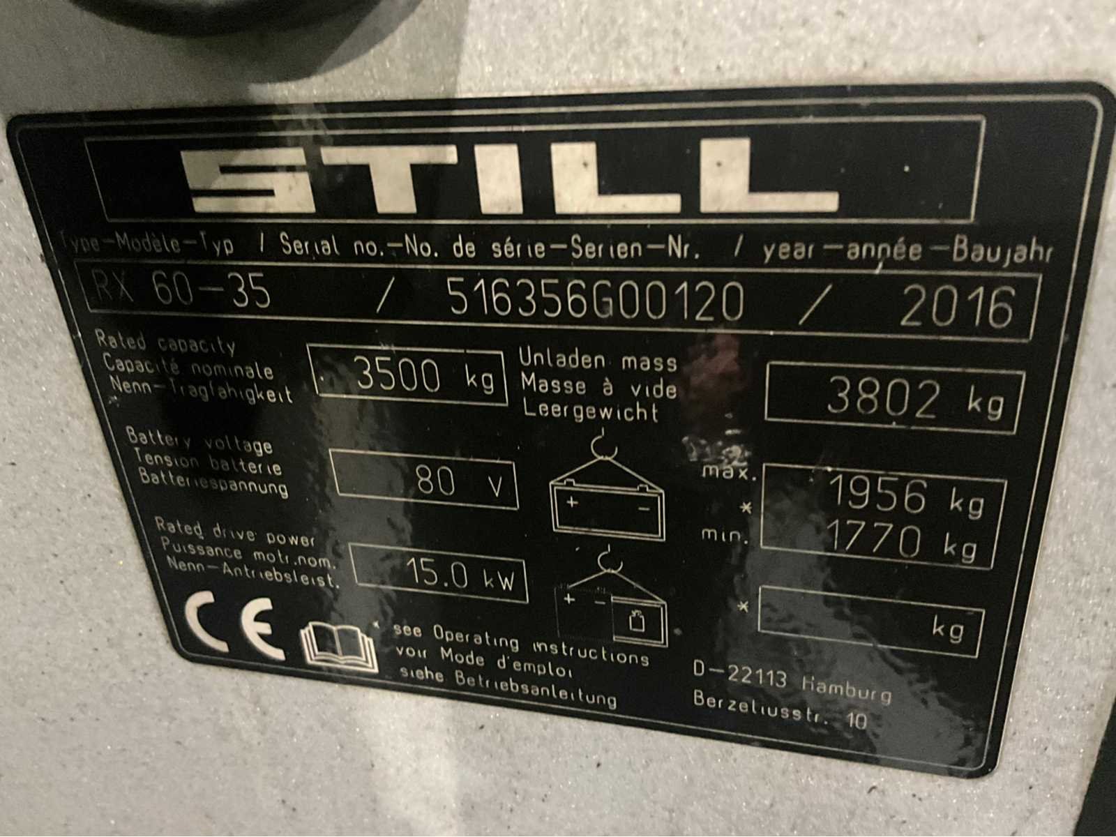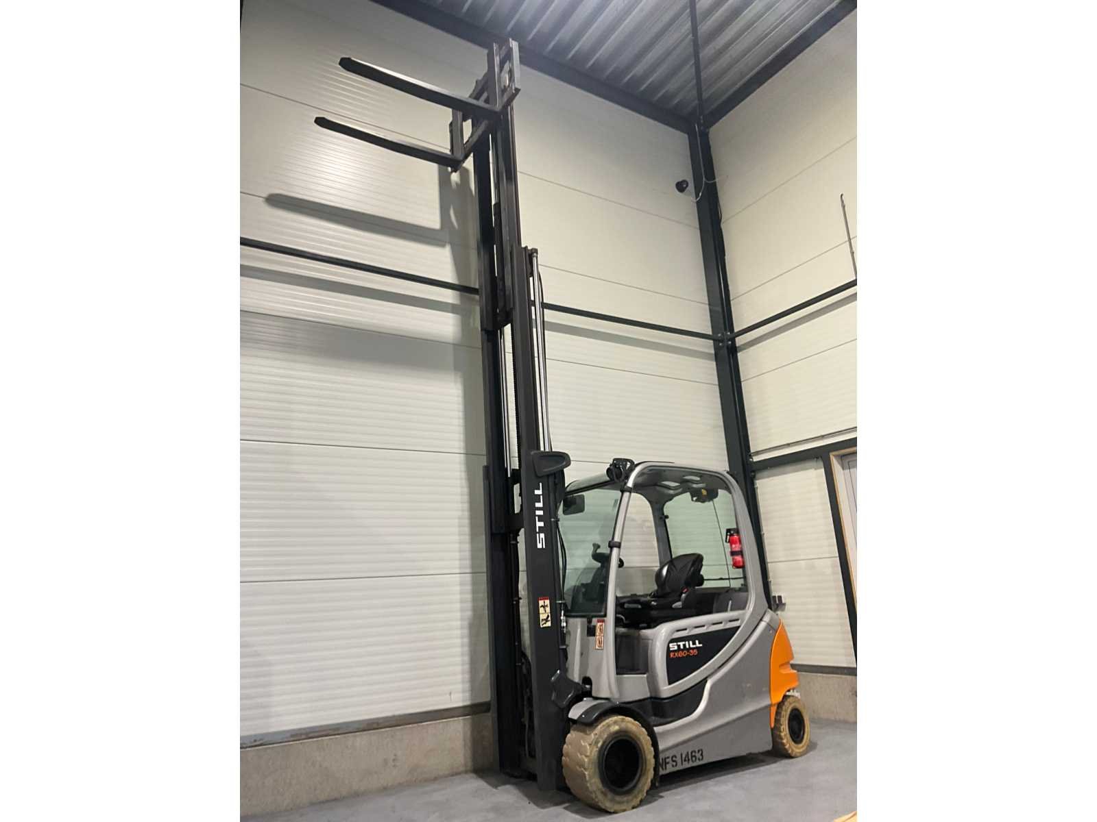 Extra opties : Rondom led verlichting , Blue spot , zwaailamp , brandblusser , Non-marking banden Nee Merk: Still Type: RX60-35 Bouwjaar: 2016 Serienummer: 51635G00120 Mast: Triple Soort band: Volrubber banden Aantal wielen: 4 Afgelezen urenstand: 7666 Free-lift: true Triple mast: true Eigen gewicht: 5758kg Hefvermogen: 3500kg Hefhoogte: 4700mm Vol rubber banden: true Totale afmeting L: 3710mm Totale afmeting Breedte: 1350mm Totale afmeting Hoogte: 2270mm