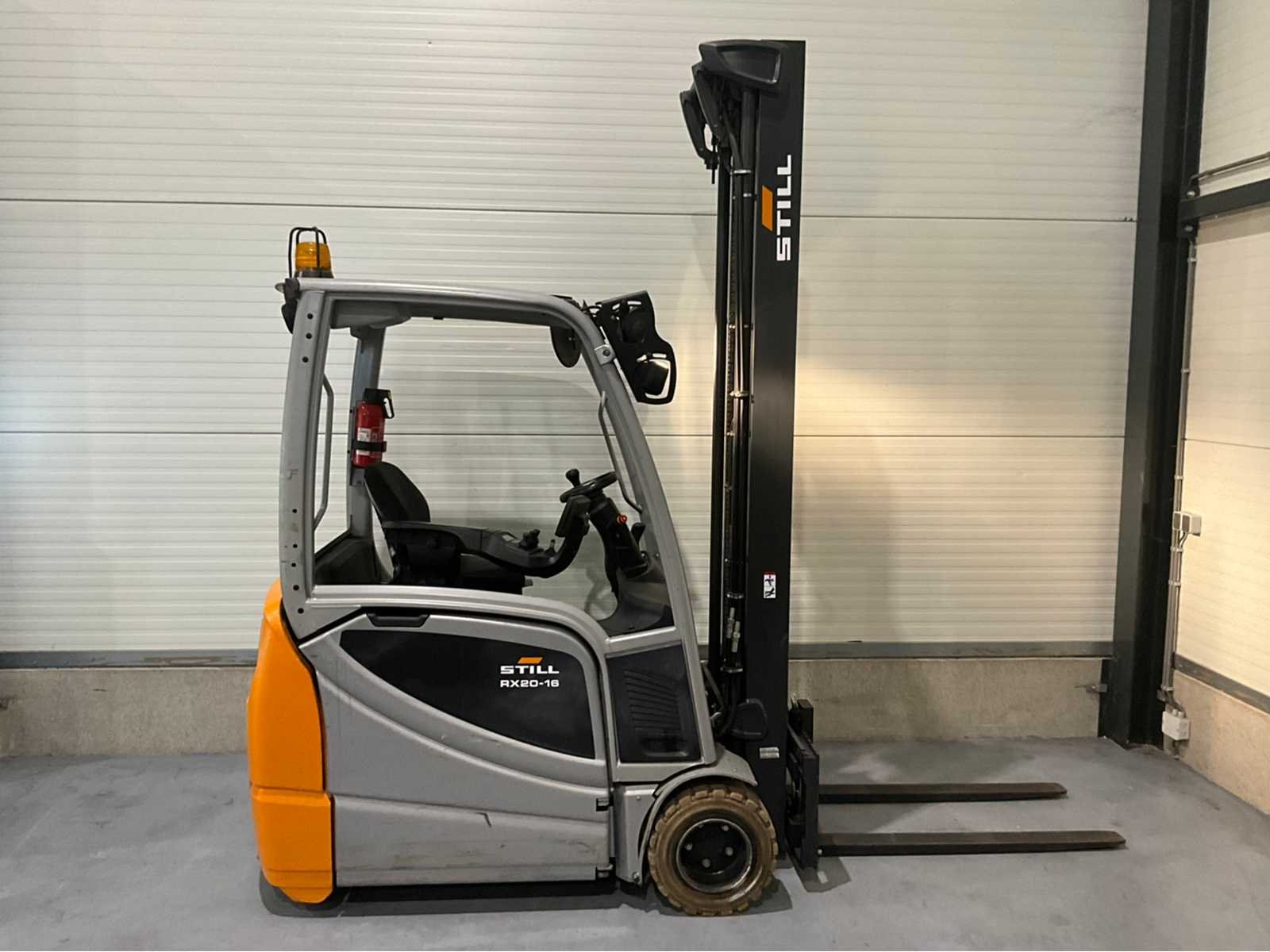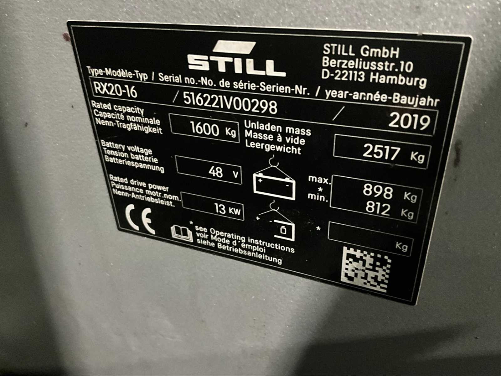 Extra opties : Rondom verlichting , blue spot voor en achter, Non-marking banden , joy stick , zwaailamp , brandblusser Nee Merk: Still Type: RX20-16 Bouwjaar: 2019 Serienummer: 516221V00298 Mast: Triple Soort band: Volrubber banden Aantal wielen: 3 Free-lift: true Side-shift: true Triple mast: true Eigen gewicht: 3415kg Hefvermogen: 1600kg Hefhoogte: 6800mm Vol rubber banden: true Totale afmeting L: 3210mm Totale afmeting Breedte: 1170mm Totale afmeting Hoogte: 2860mm