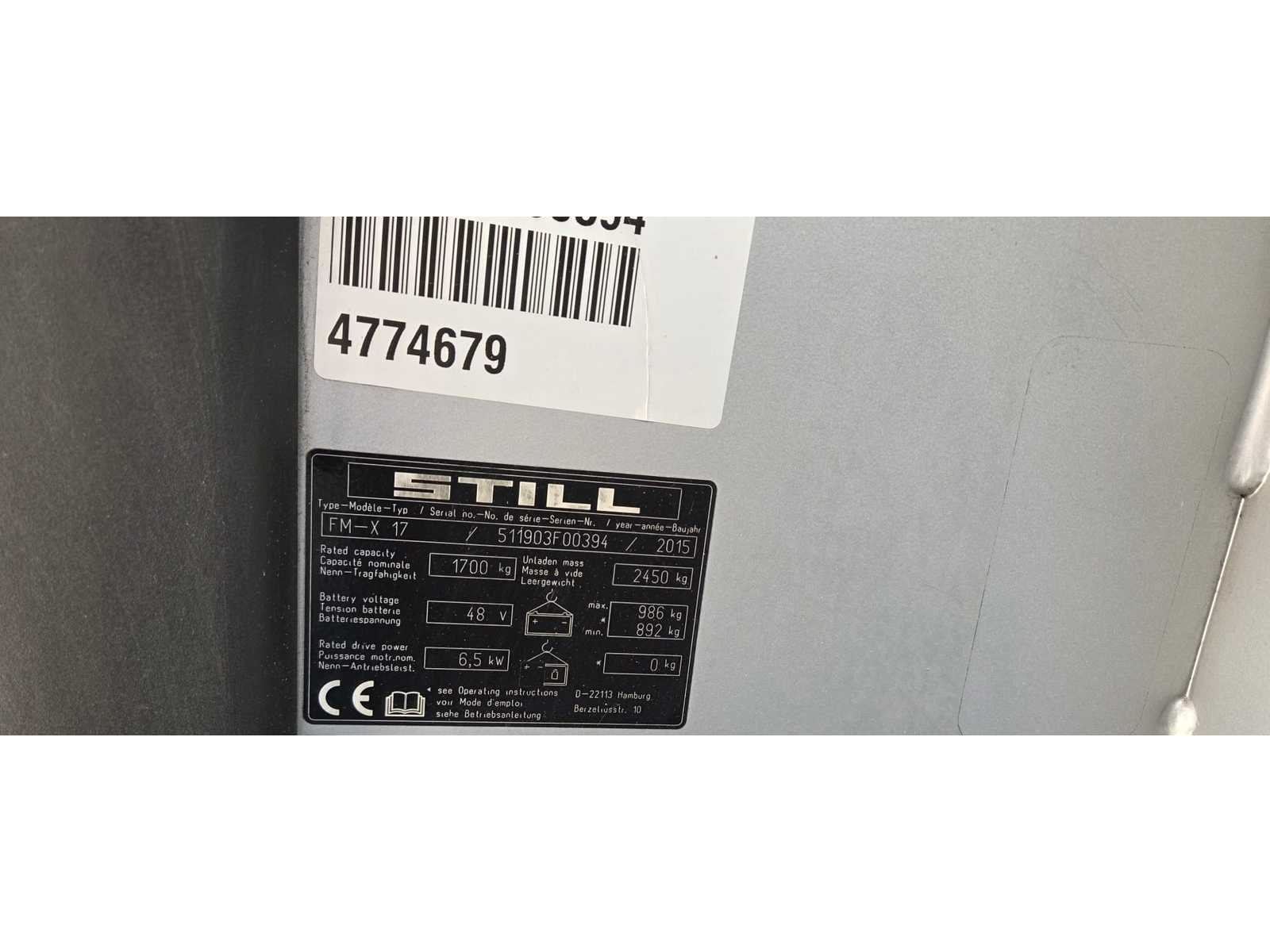 Still FMX17: Merk: Still Type: Heftruck / FM-X17 Hefvermogen: 1700 Kg Masttype: Triplex, freelift Doorrijhoogte: 230 cm Hefhoogte: 575 cm Freelift: ja Sideshift: nee Accu: 48V, 620Ah Acculader inbegrepen: ja Bouwjaar machine: 2015 Lengte: 160 cm Breedte: 130 cm Nee Merk: Still Type: FMX17 Bouwjaar: 2015 Mast: Triplo Aantal wielen: 3 Afgelezen urenstand: 3771 Accu lader: true Free-lift: true Side-shift: true Triple mast: true Eigen gewicht: 3436kg Hefvermogen: 1700kg Hefhoogte: 5750mm Totale afmeting L: 1600mm Totale afmeting Breedte: 1300mm Totale afmeting Hoogte: 2300mm