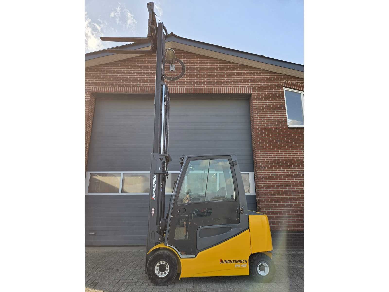 Extra opties : Rondom verlichting , blue spot , volledige cabine , dagrij verlichting , lepelversteller , verwarming Nee Merk: Jungheinrich Type: EFG 425K Bouwjaar: 2015 Serienummer: FN488954 Mast: Triple Soort band: Volrubber banden Aantal wielen: 4 Afgelezen urenstand: 6035 Free-lift: true Side-shift: true Hydraulisch verstelbare lepels: true Triple mast: true Eigen gewicht: 5150kg Hefvermogen: 2500kg Hefhoogte: 5000mm Vol rubber banden: true Totale afmeting L: 3300mm Totale afmeting Breedte: 1250mm Totale afmeting Hoogte: 2250mm