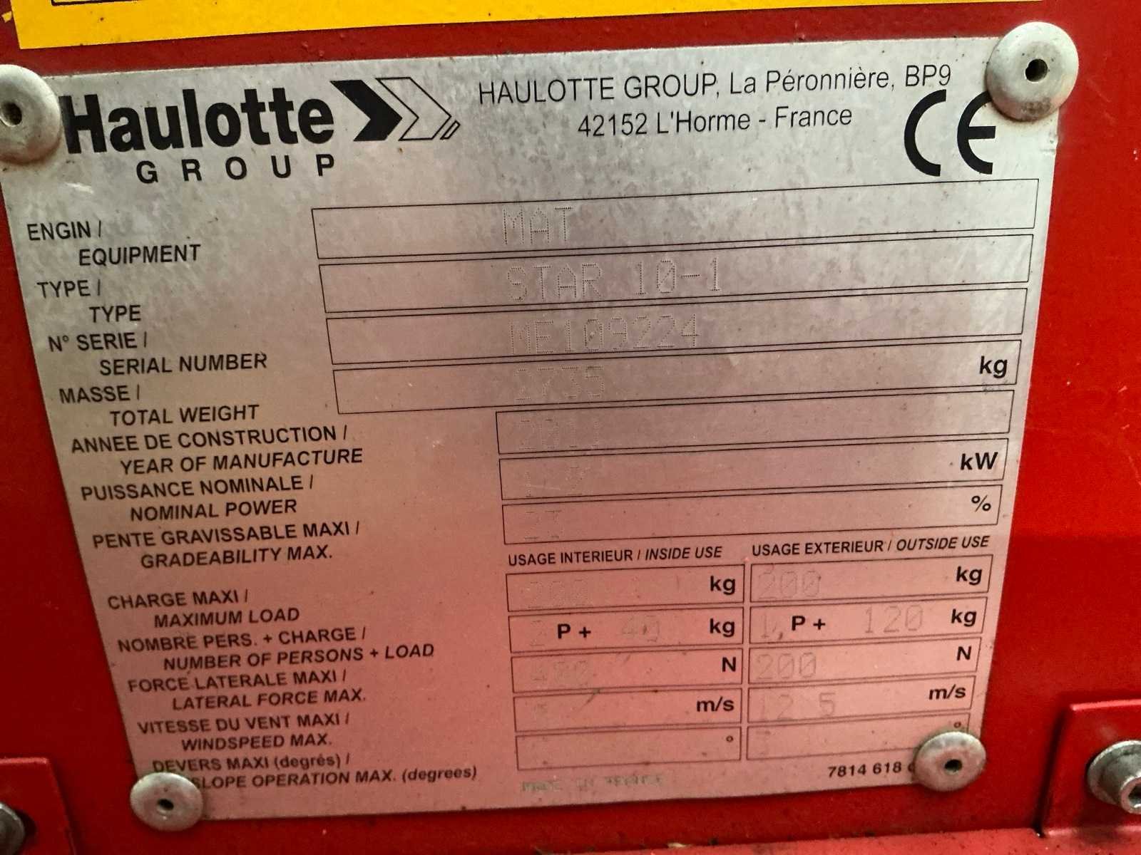 Accupakket dient vervangen te worden No Merk: Haulotte Type: STAR 10-1 Bouwjaar: 2011 Serienummer: ME-109224 Knikarm hoogwerker: true Masthoogwerker: true Plateau afm. l: 920mm Plateau afm. b: 660mm Eigen gewicht: 2735kg Totale afmeting L: 2600mm Totale afmeting Breedte: 1100mm Totale afmeting Hoogte: 1970mm