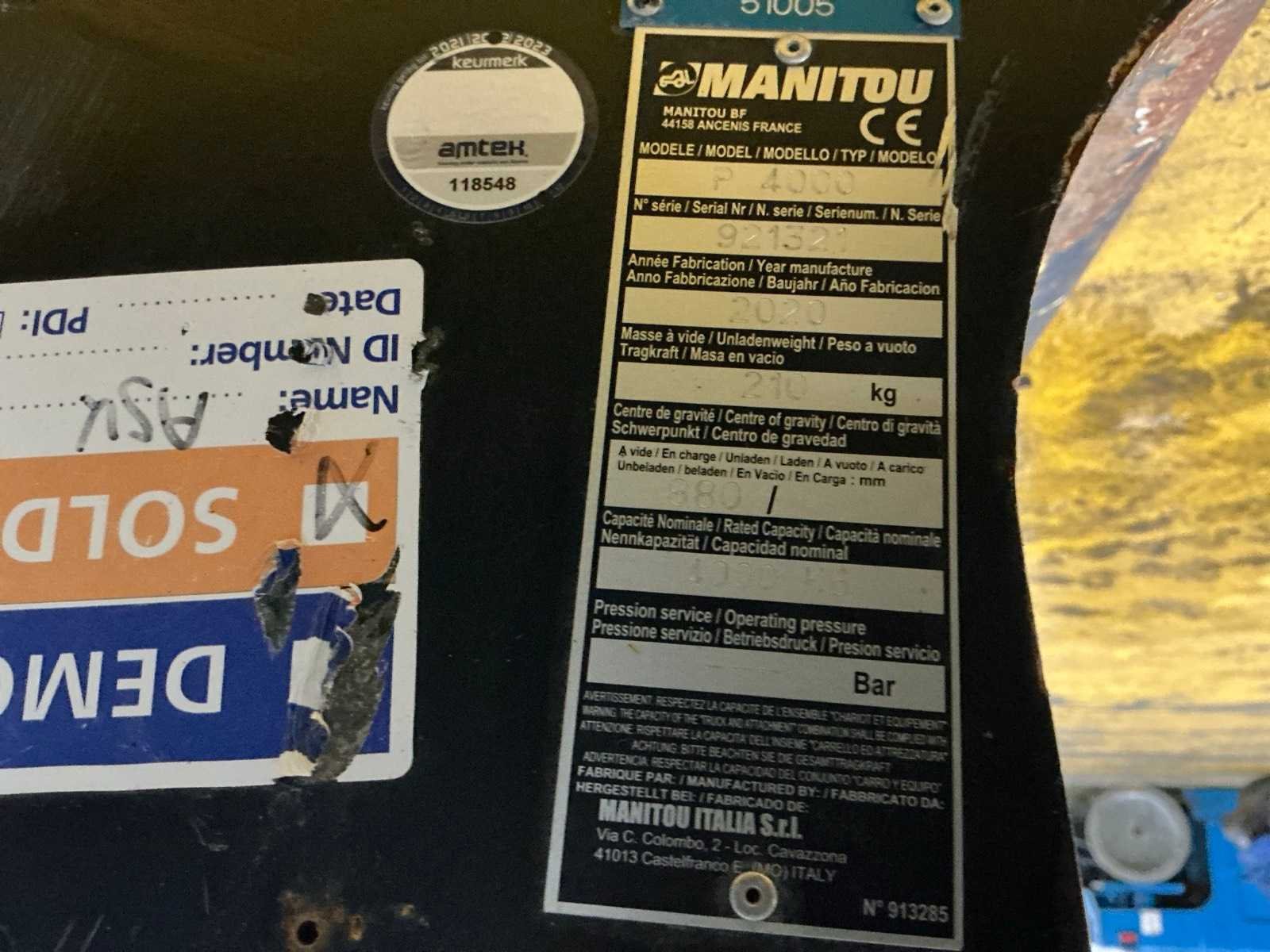 Voorzien van 2x hijshaak Nee Merk: Manitou Type: P4000 Bouwjaar: 2020 Serienummer: 921321 Hefvermogen: 4000kg Eigen gewicht: 210kg Totale afmeting L: 2700mm Totale afmeting Breedte: 790mm