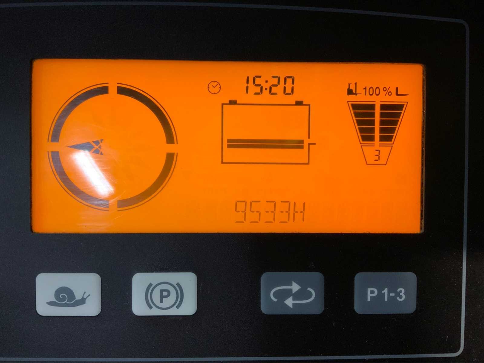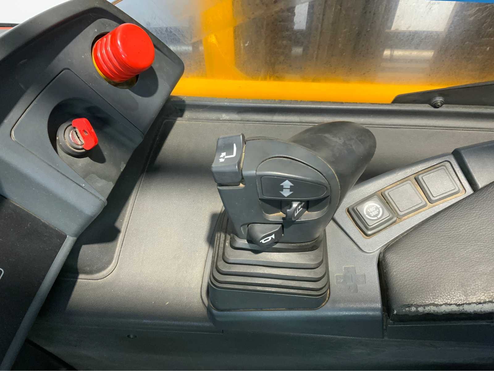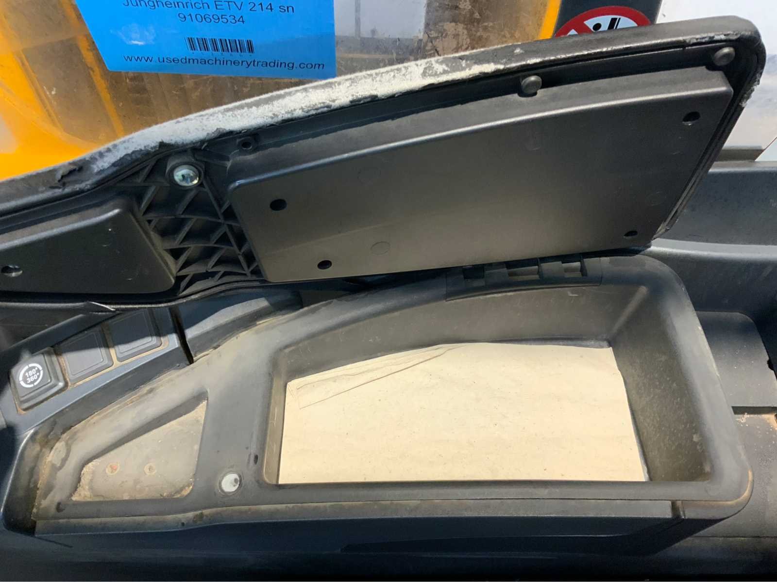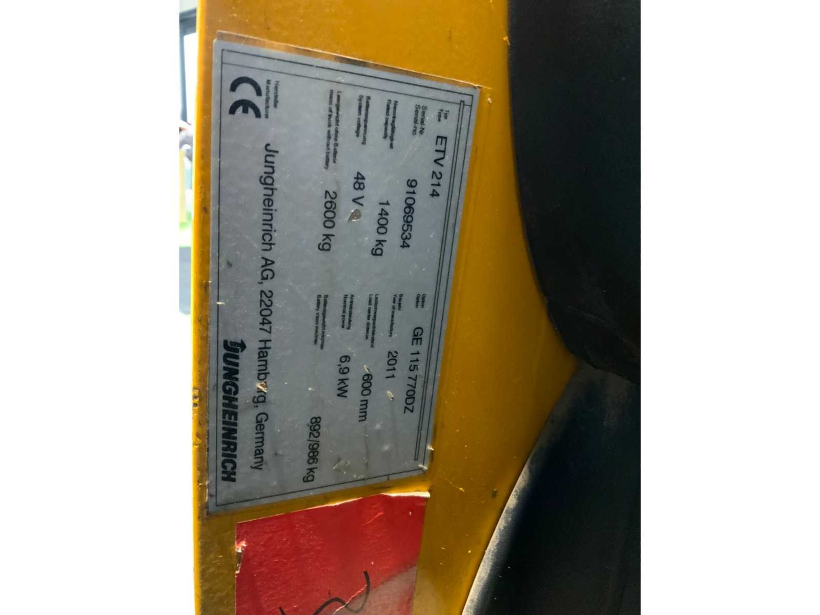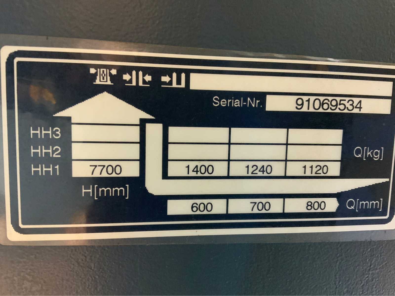 Extra opties: opbergruimte armsteun, 360 Graden functie. Nee Merk: Jungheinrich Type: ETV 214 Bouwjaar: 2011 Serienummer: 91069534 Brandstof: Elektrisch Mast: Triplex Aantal wielen: 3 Afgelezen urenstand: 9533 Free-lift: true Side-shift: true Triple mast: true Eigen gewicht: 3586kg Hefvermogen: 1400kg Lepellengte: 1150mm Max. hefhoogte: 7700mm Hefhoogte: 7700mm Totale afmeting L: 2550mm Totale afmeting Breedte: 1265mm Totale afmeting Hoogte: 3100mm Elektrisch: true Vol rubber banden: true