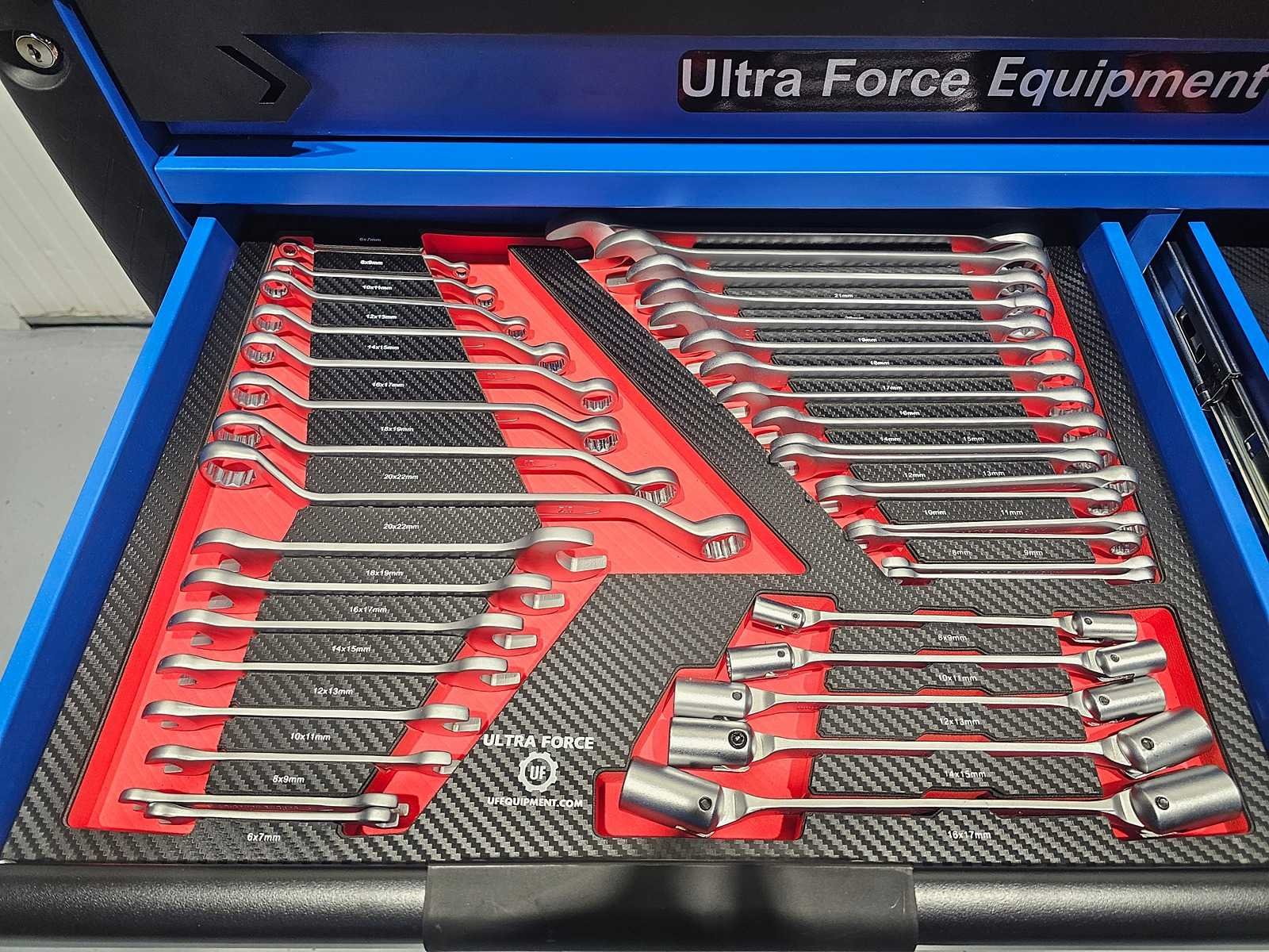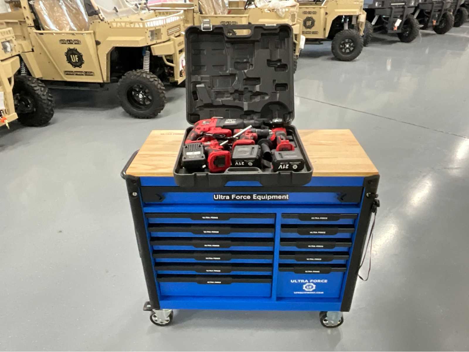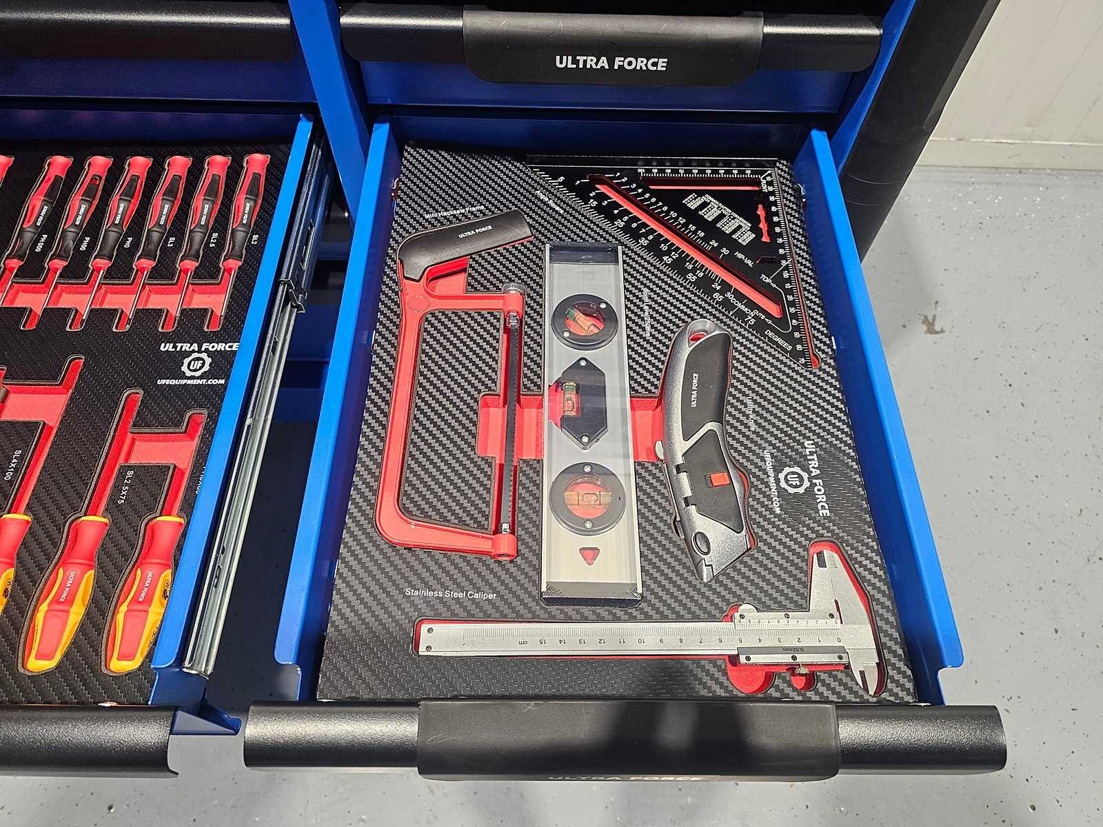 Professionele gereedschapswagen 12 laden, 293 pcs EN een 4 delige accu gereedschap set. Gereedschapswagen 12 laden waarvan 11 gevuld met 293 pcs gereedschap Heavy equipment. 600 kg laadvermogen. Softclose-mechanisme. 2 zwenkwielen en 4 sleutels. En een 4 delige accu gereedschap set: schroefmachine - slagmoersleutel - boormachine en slijper. Inclusief 2 accu's, oplader en diverse accessoires in koffer. Cordless power tools set Nee Merk: Ultra Force Equipment Type: Jumbo Gewicht: 132kg Lengte: 112cm Breedte: 50cm Hoogte: 103cm